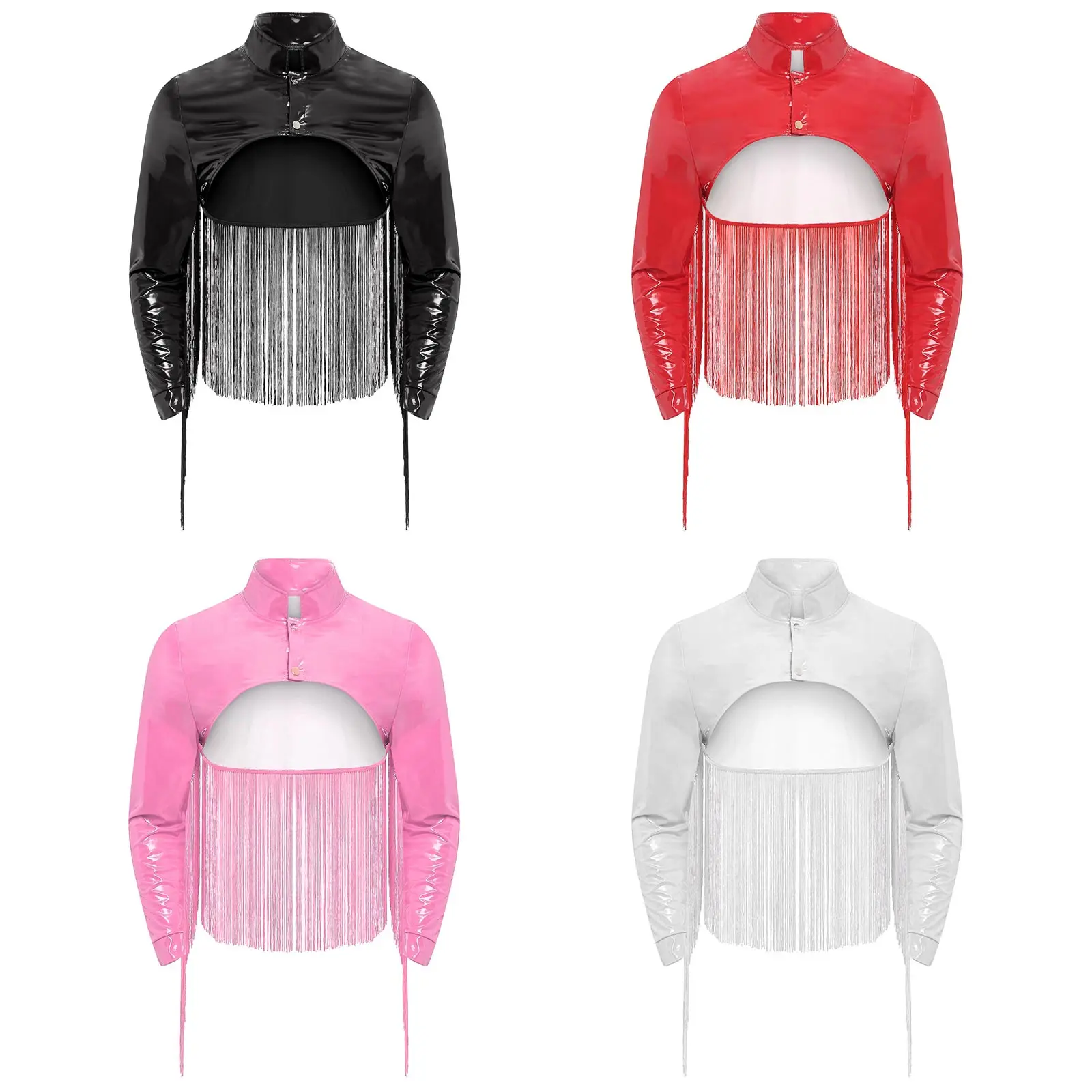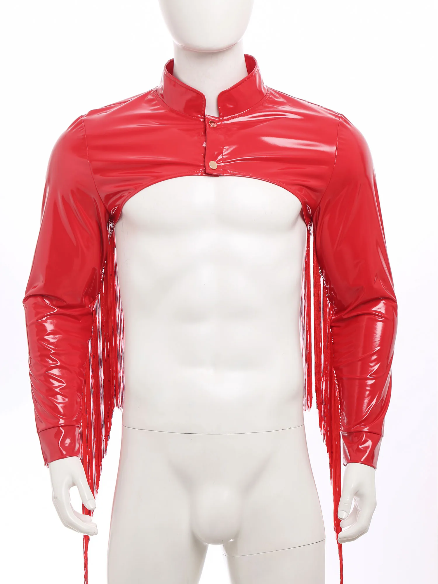 Men Punk Patent Leather Fringe Jacket Clubwear Stand Collar Long Sleeve Cutout Crop Top for Nightclub Rave Party Music Festival