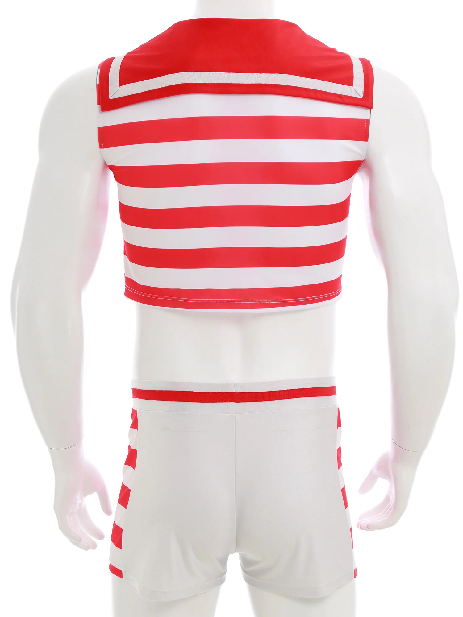 Men Striped Nautical Sailor Cosplay Costume Outfits Sleeveless Crop Tops with Boxer Shorts Suit for Halloween Masquerade Party