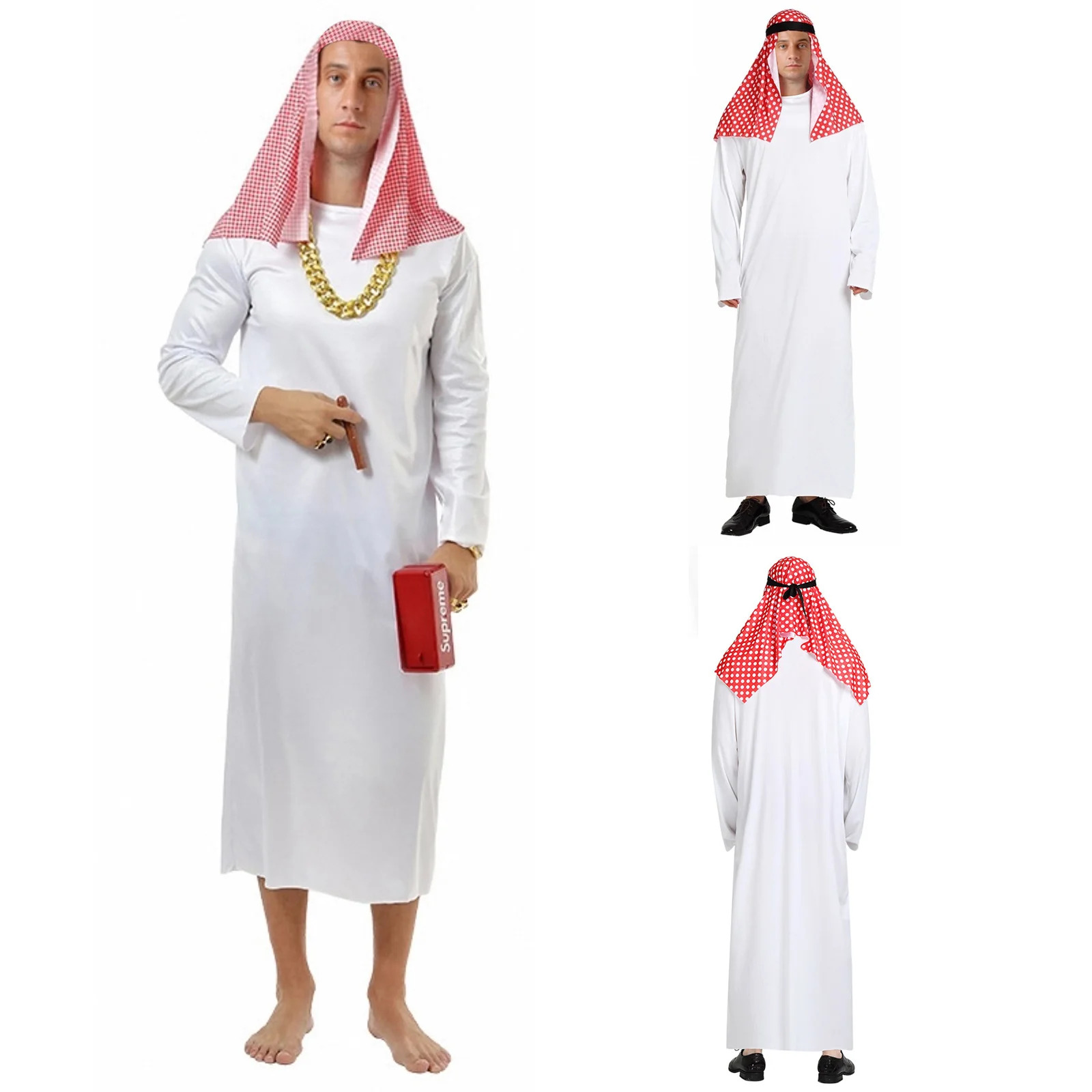Mens Arab Muslims Cosplay Costume with Robe And Head Scarf Saudi Arabia Eid Turkey Abaya Tunic Head Wrap Fancy Party Dress Up