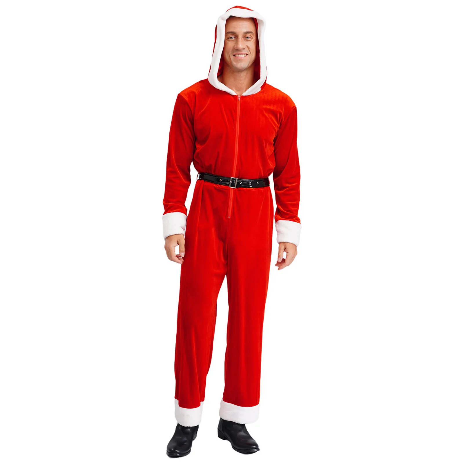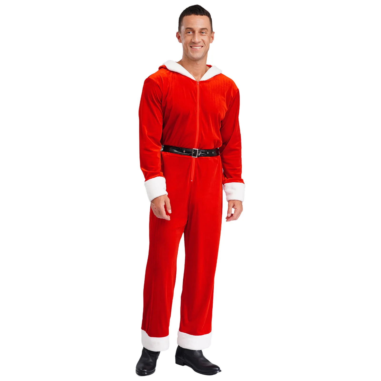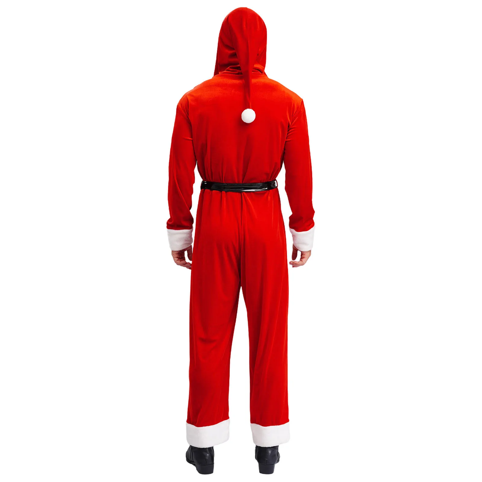 Mens Christmas Hooded Pajamas Pointed Hood Jumpsuit with Belt Santa Claus Xmas Costume Front Zip Wide Leg White Trim Unitard