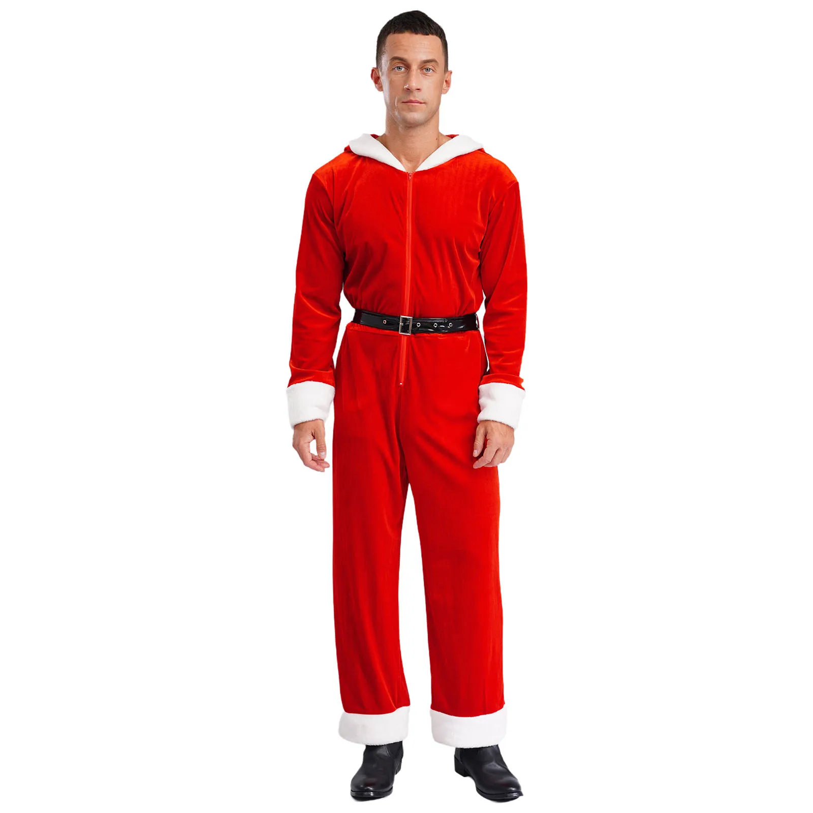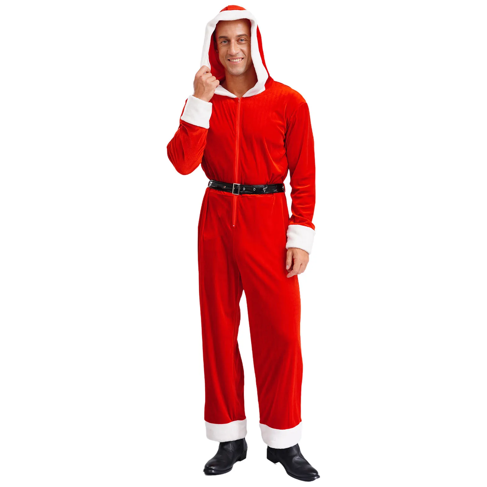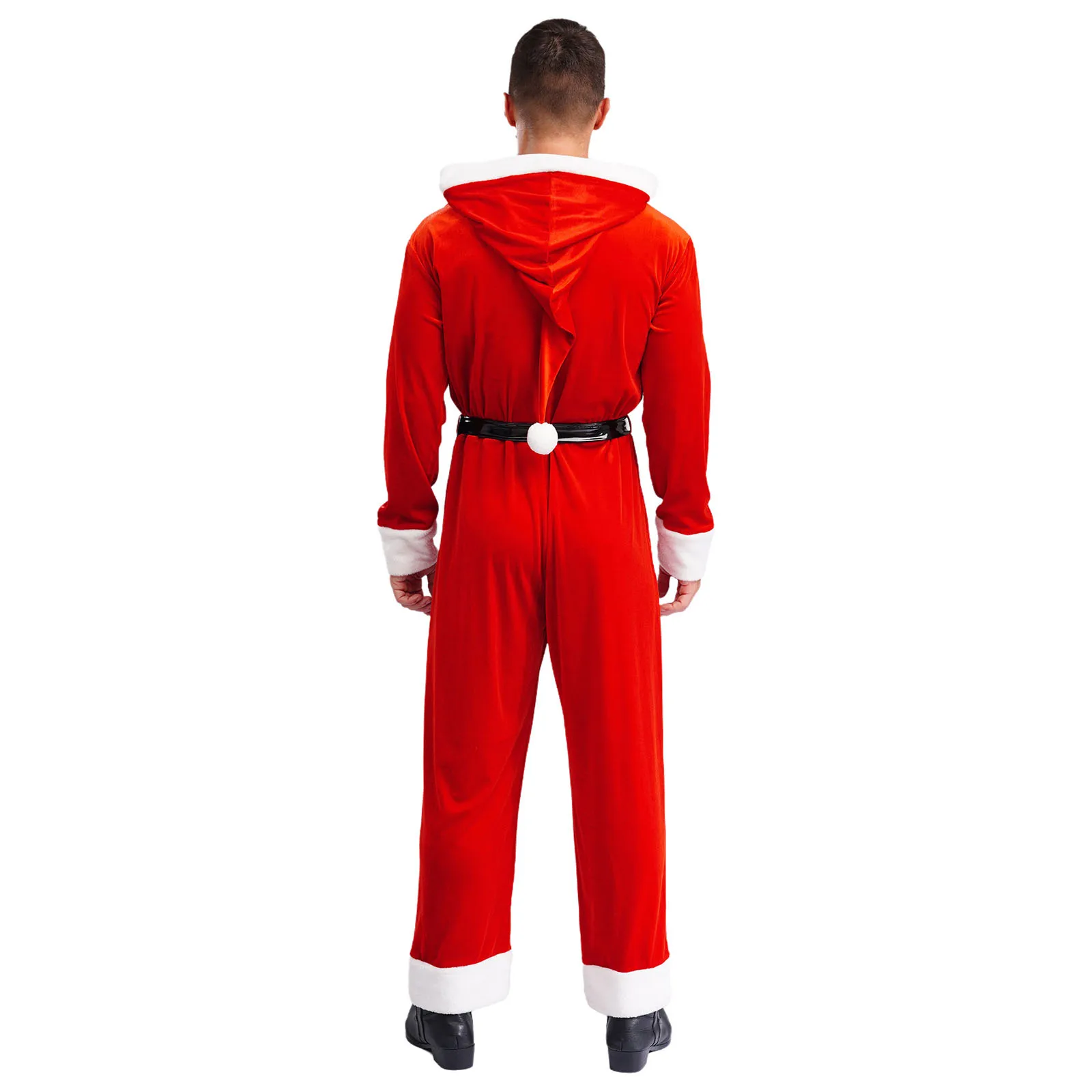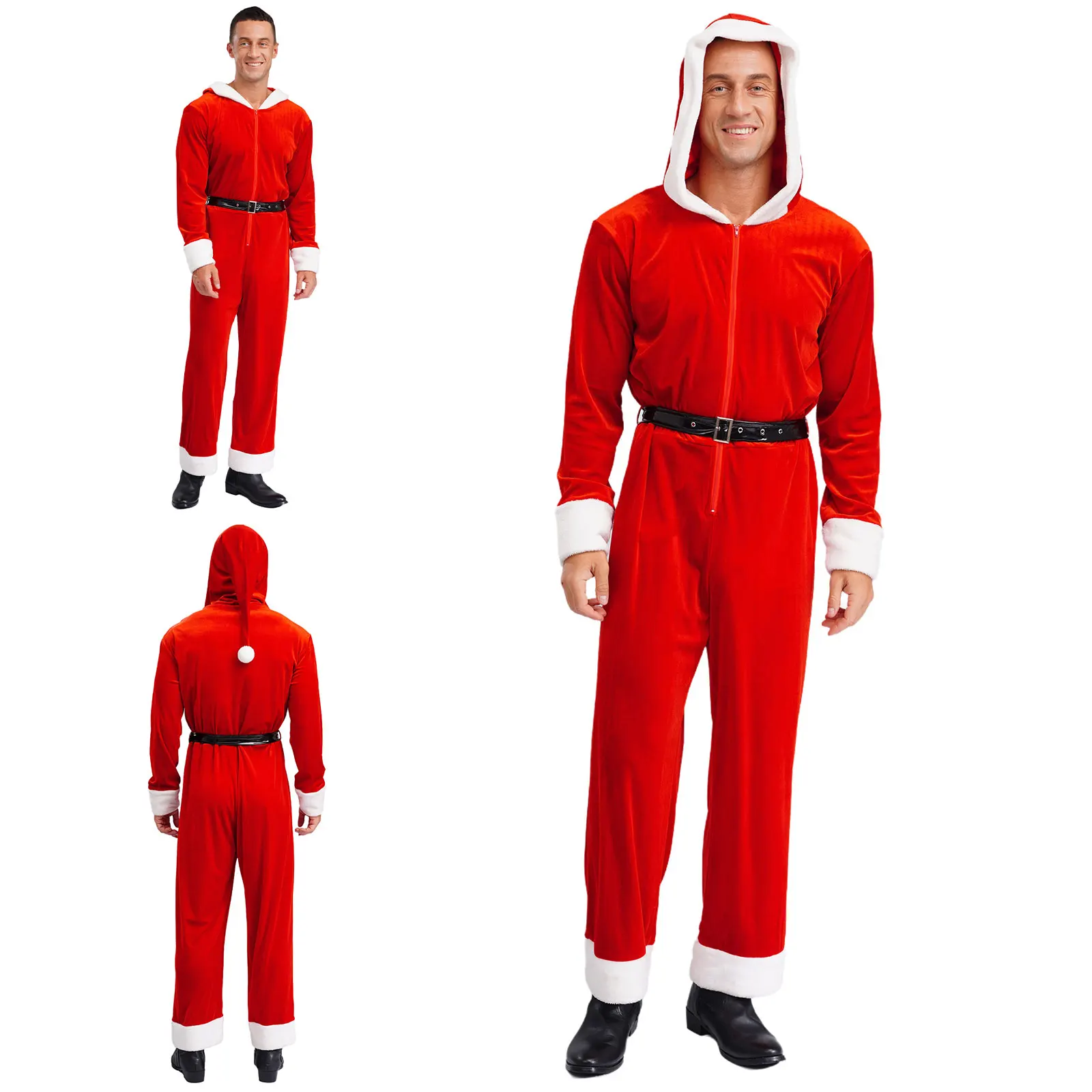 Mens Christmas Hooded Pajamas Pointed Hood Jumpsuit with Belt Santa Claus Xmas Costume Front Zip Wide Leg White Trim Unitard