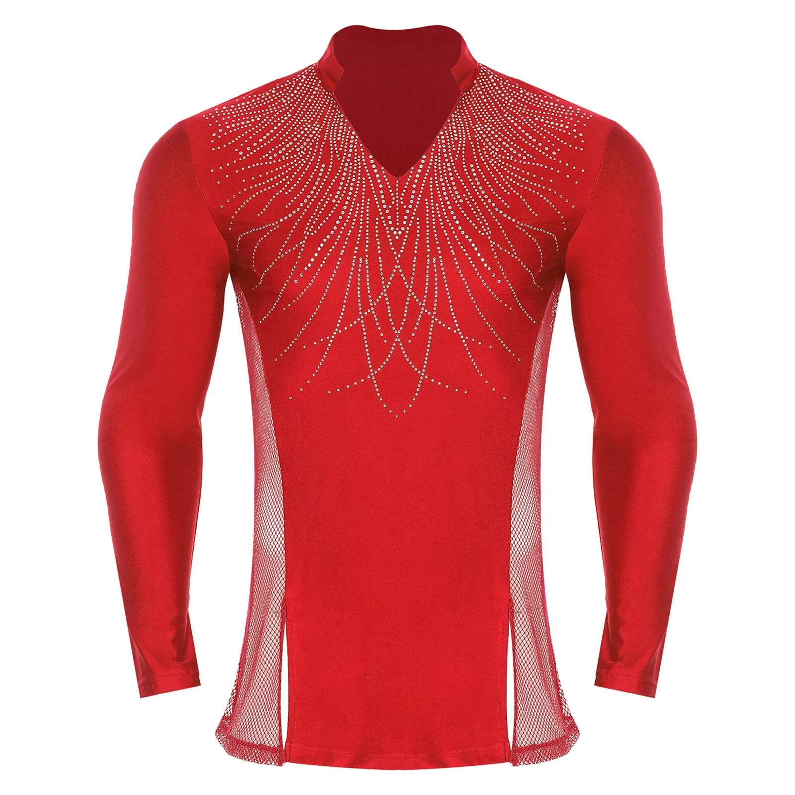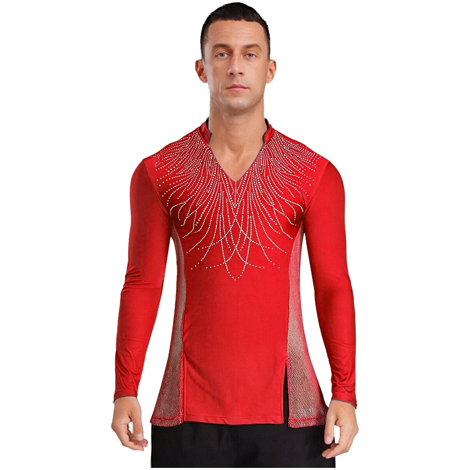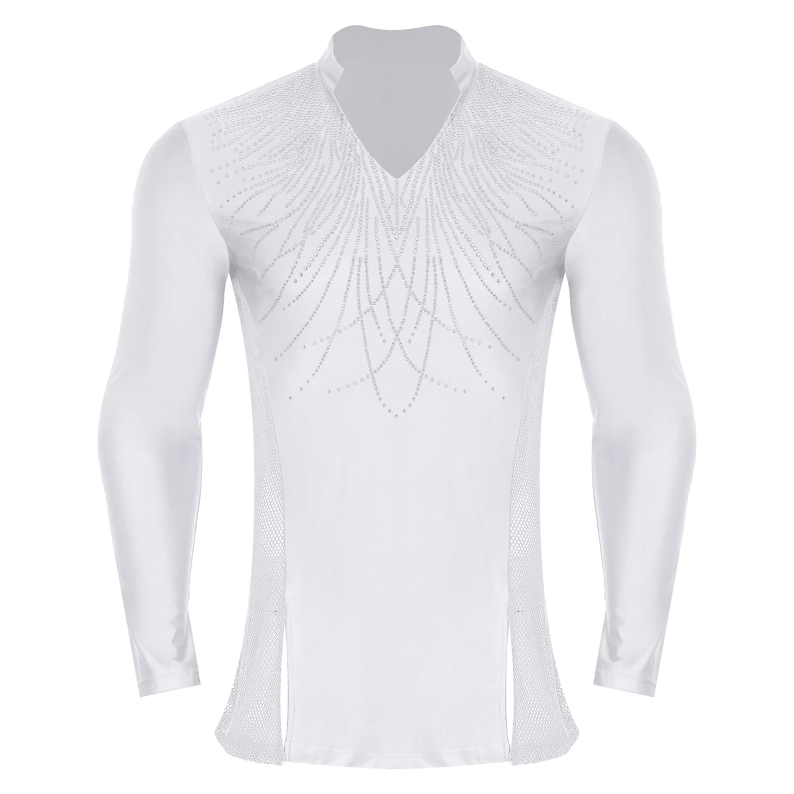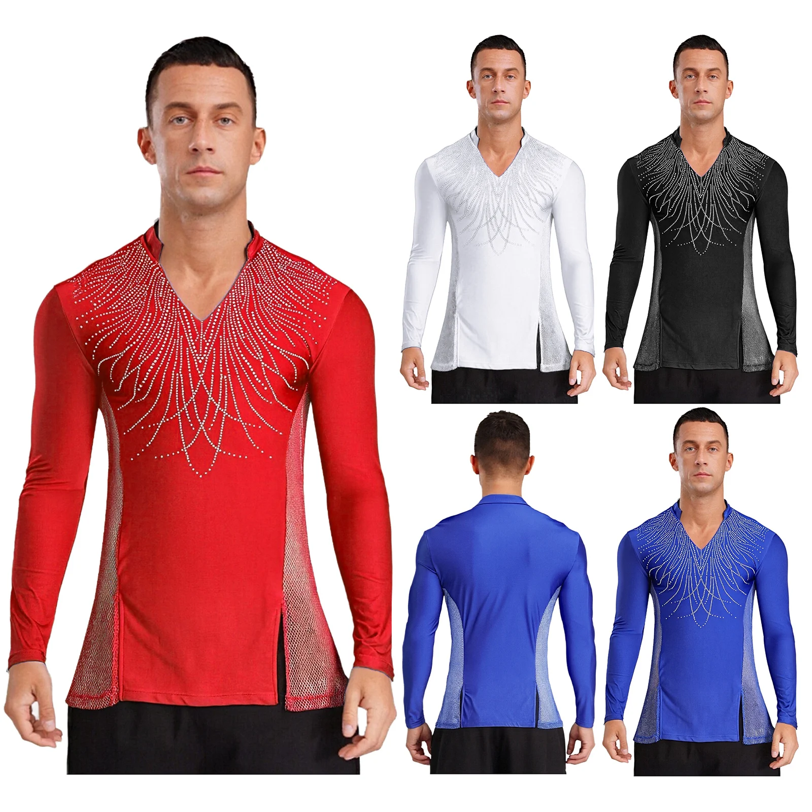 Mens Gymnastics Latin Ballet Dance Performance Costume Glittery Rhinestones Split Chacha Tango Ballroom Dance T-shirt Top
