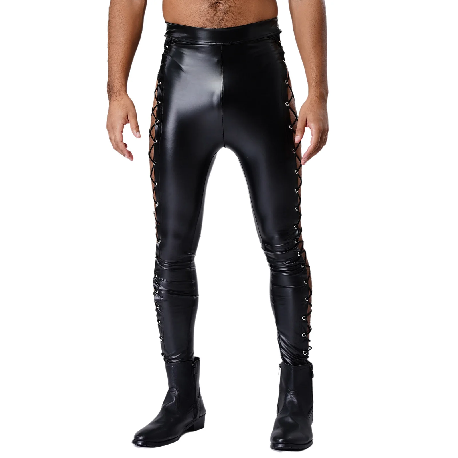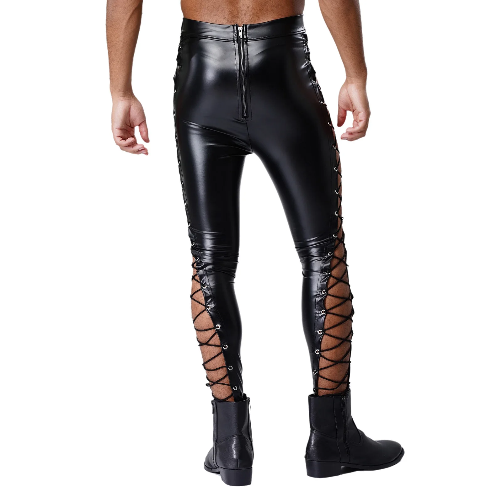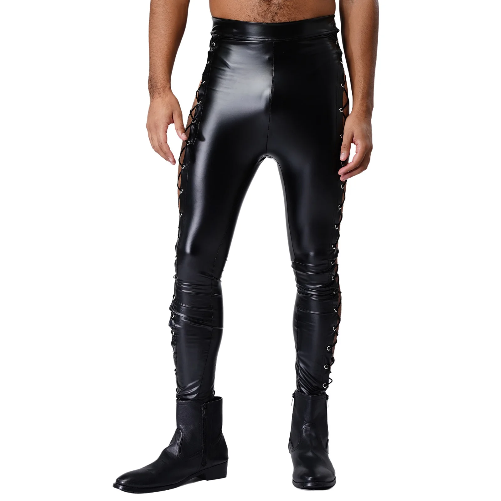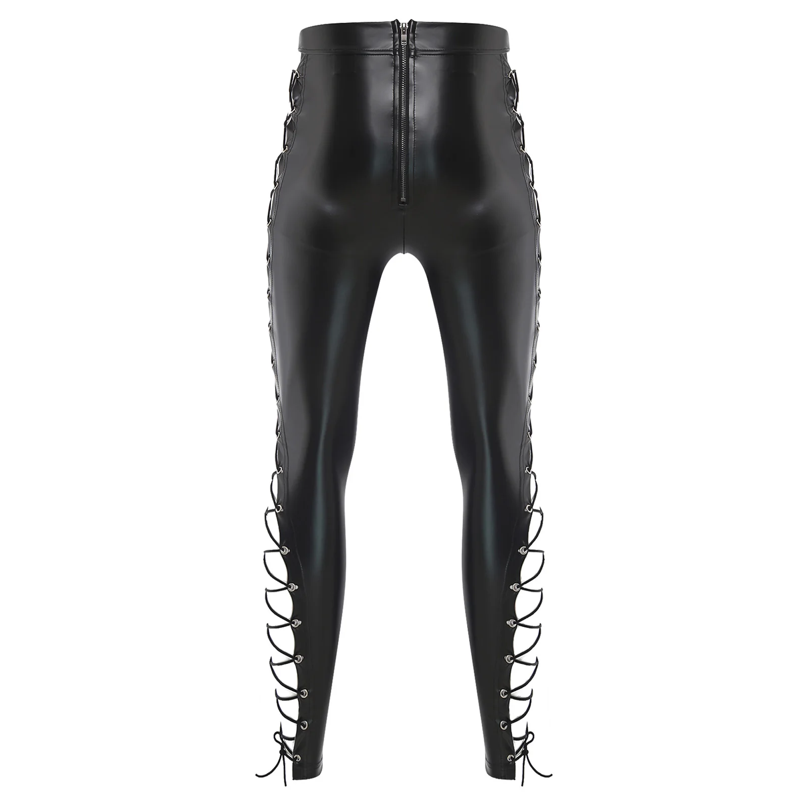 Mens Matte PU Leather High Waist Latex Pants Leggings Back Zip Sides Eyelets and Lace-up Tights Skinny Long Pants Chic Clubwear