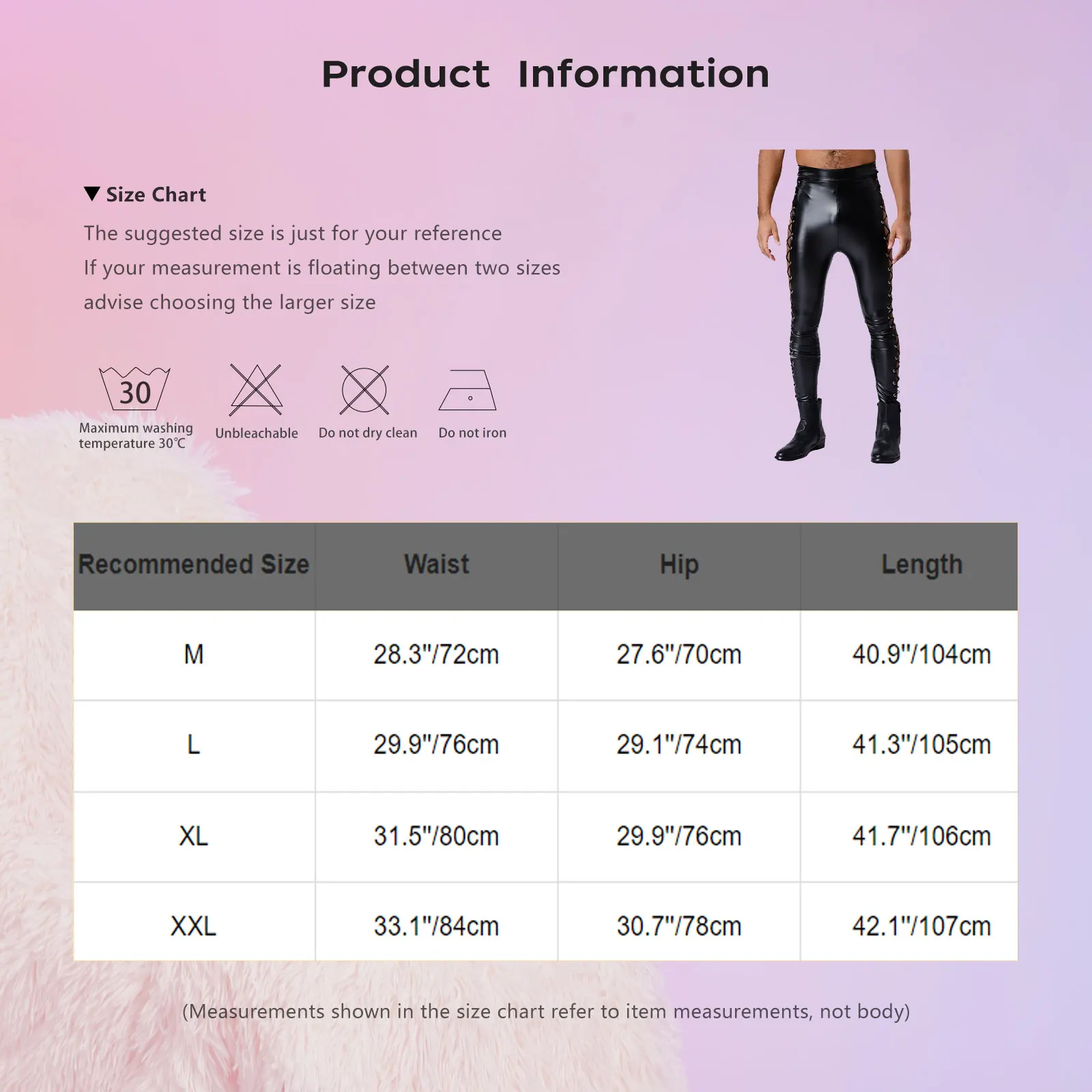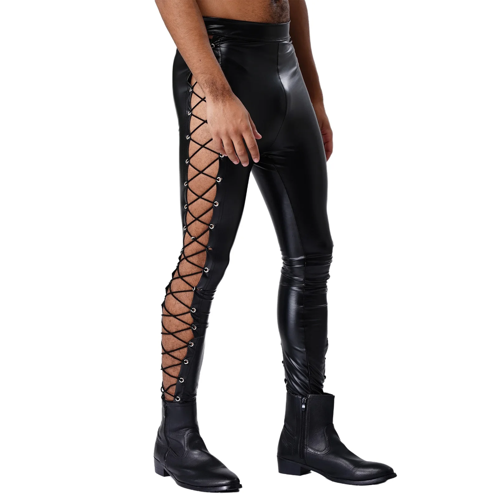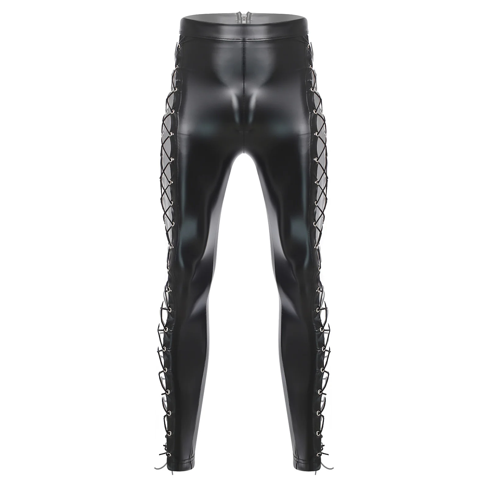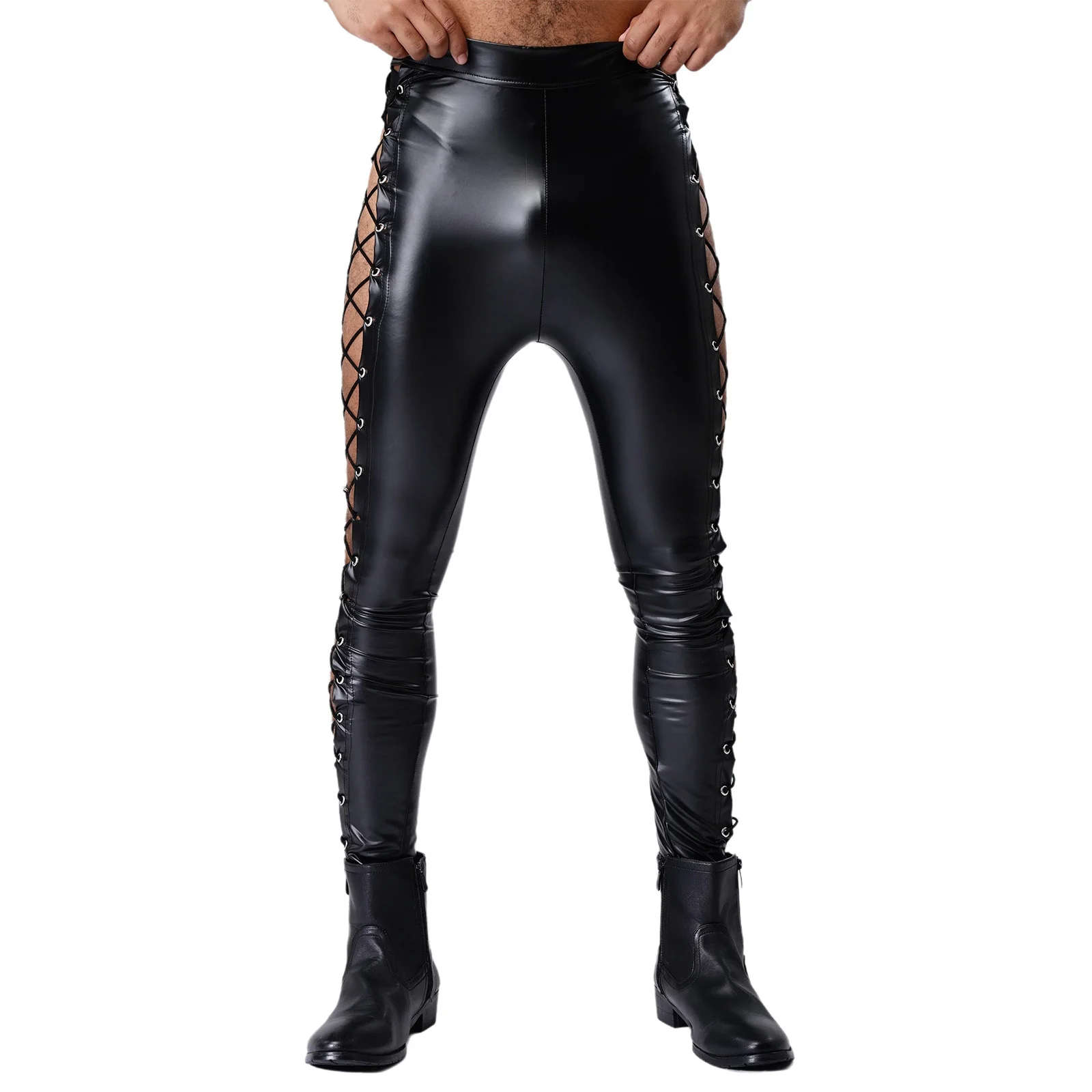 Mens Matte PU Leather High Waist Latex Pants Leggings Back Zip Sides Eyelets and Lace-up Tights Skinny Long Pants Chic Clubwear