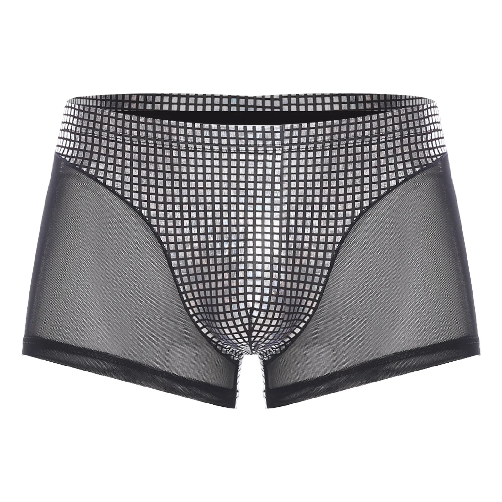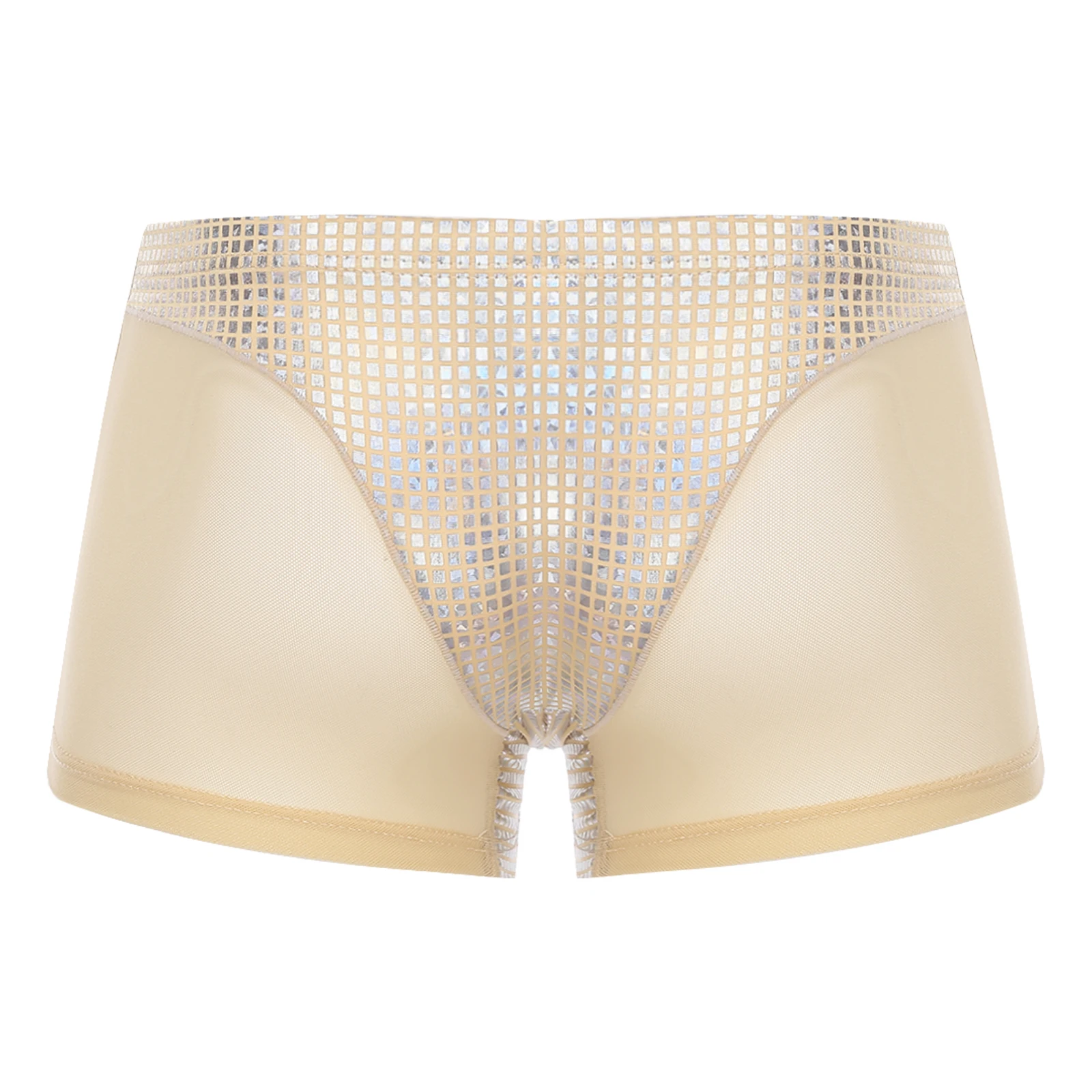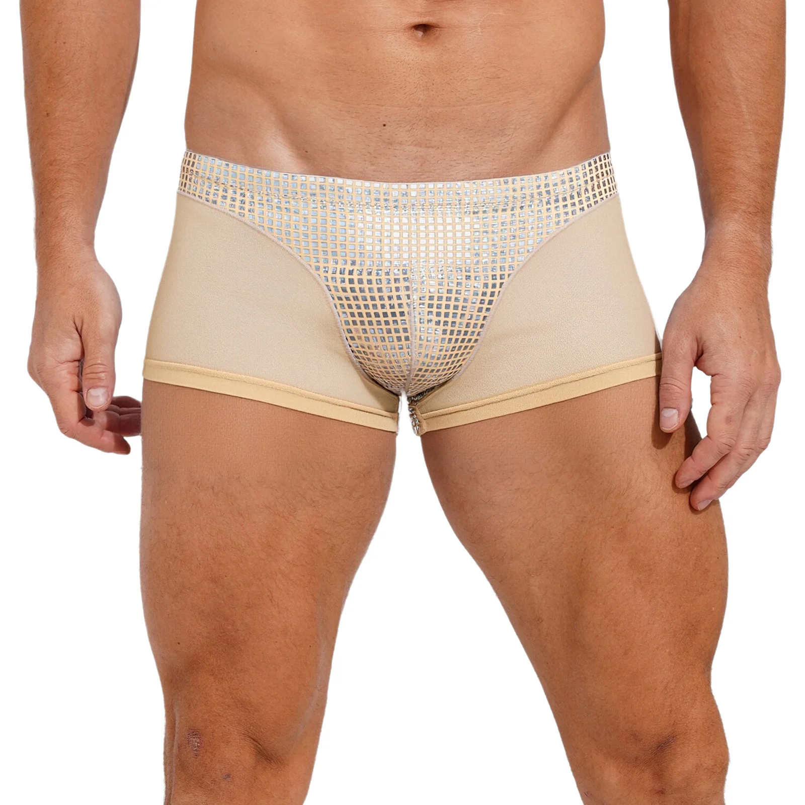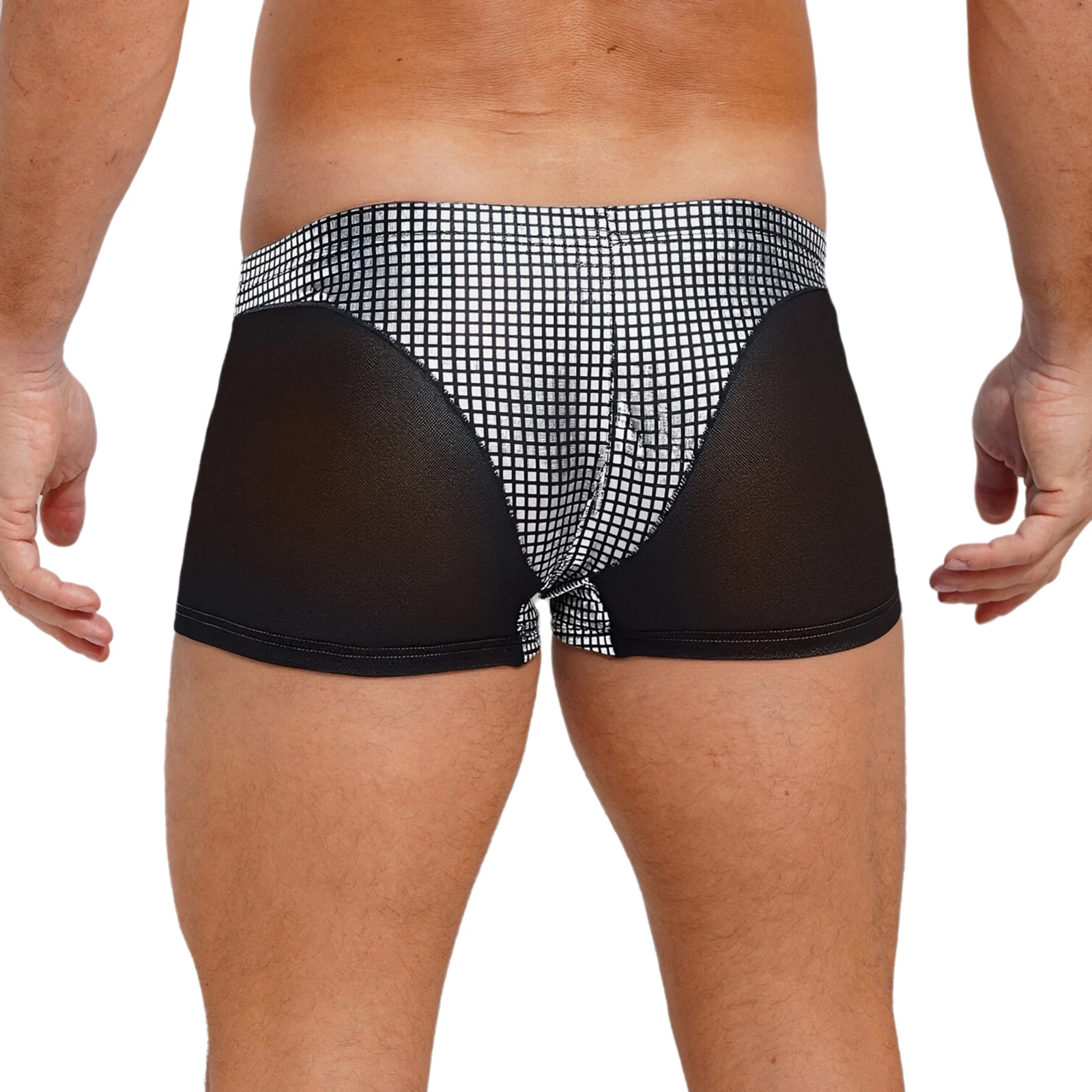 Mens Metallic Shiny Boxer Short Plaid And Mesh Patchwork Shorts Swimming Trunks Breathable Briefs Underwear for Beach Club Party