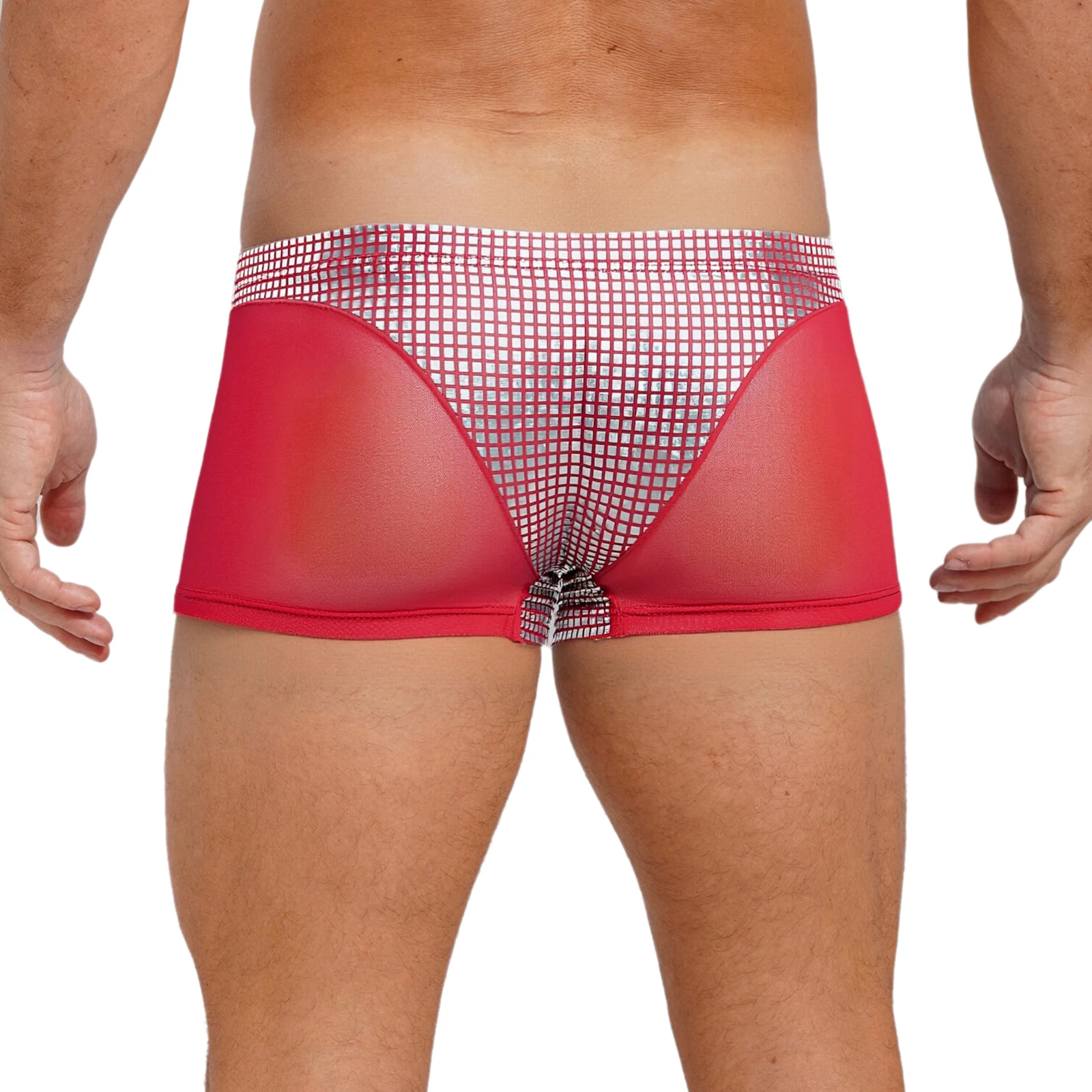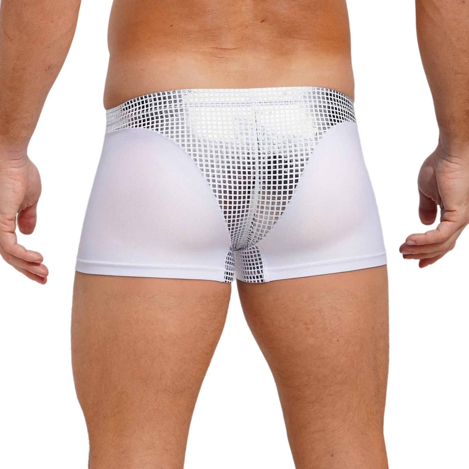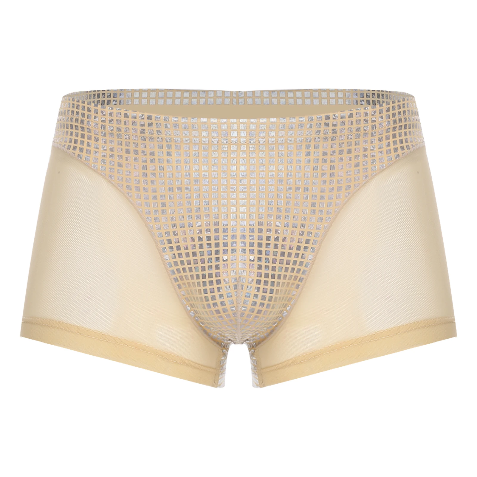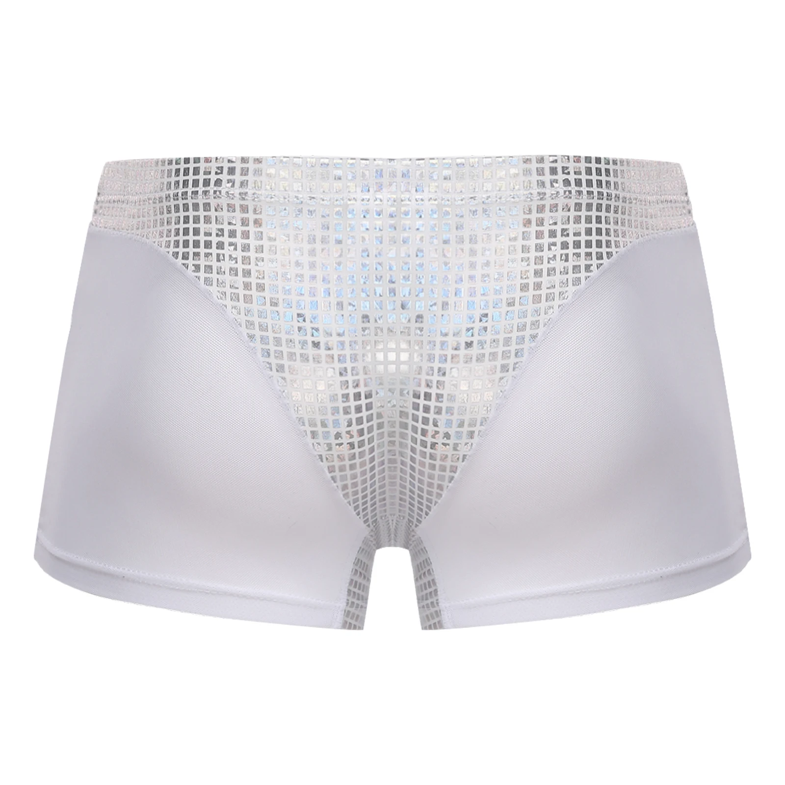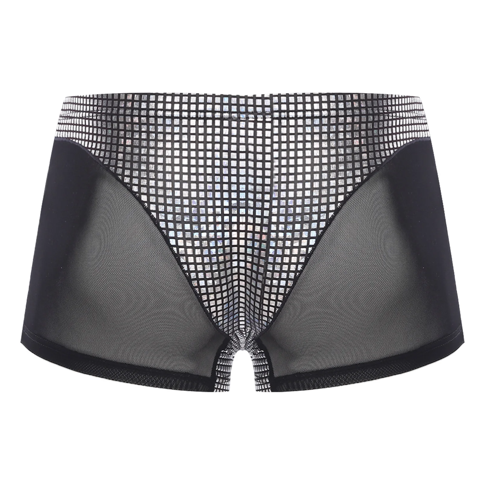 Mens Metallic Shiny Boxer Short Plaid And Mesh Patchwork Shorts Swimming Trunks Breathable Briefs Underwear for Beach Club Party
