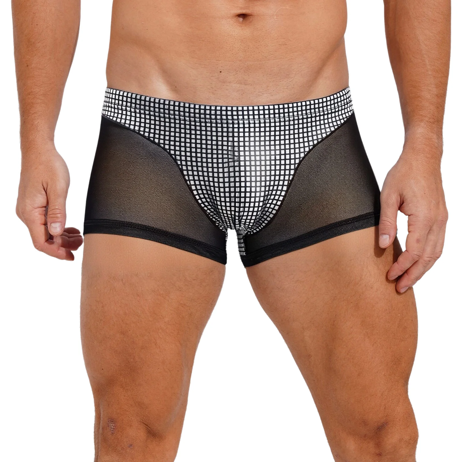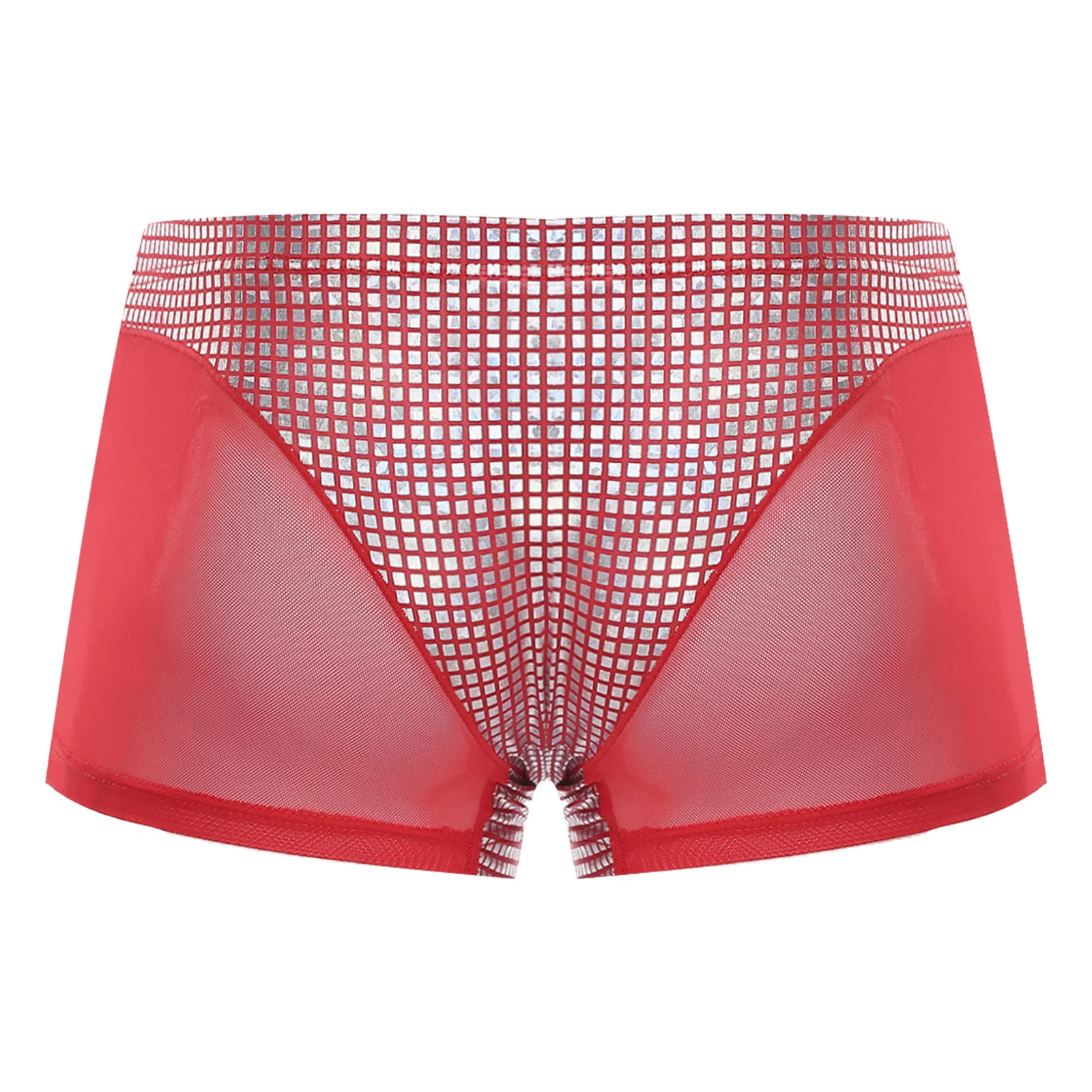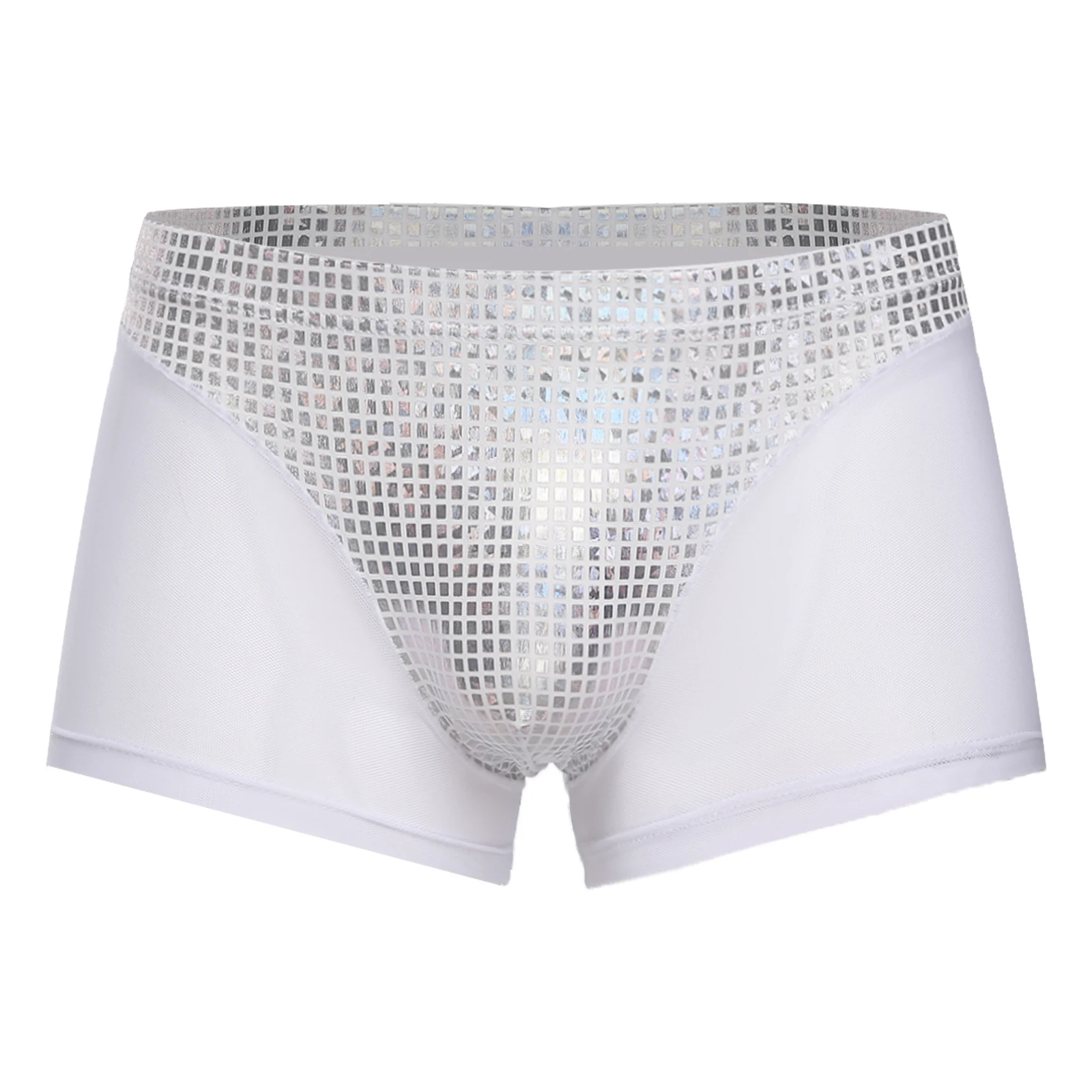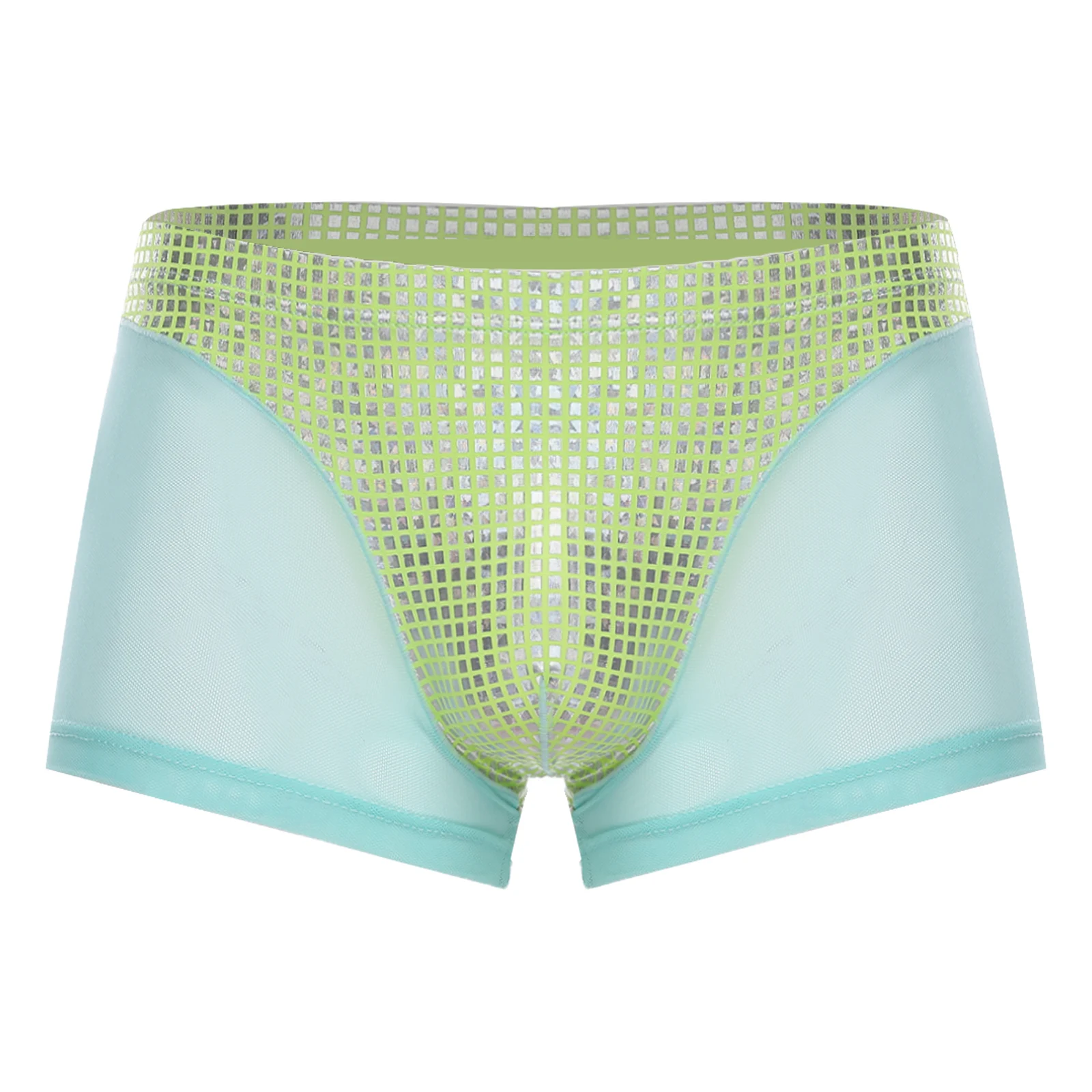 Mens Metallic Shiny Boxer Short Plaid And Mesh Patchwork Shorts Swimming Trunks Breathable Briefs Underwear for Beach Club Party