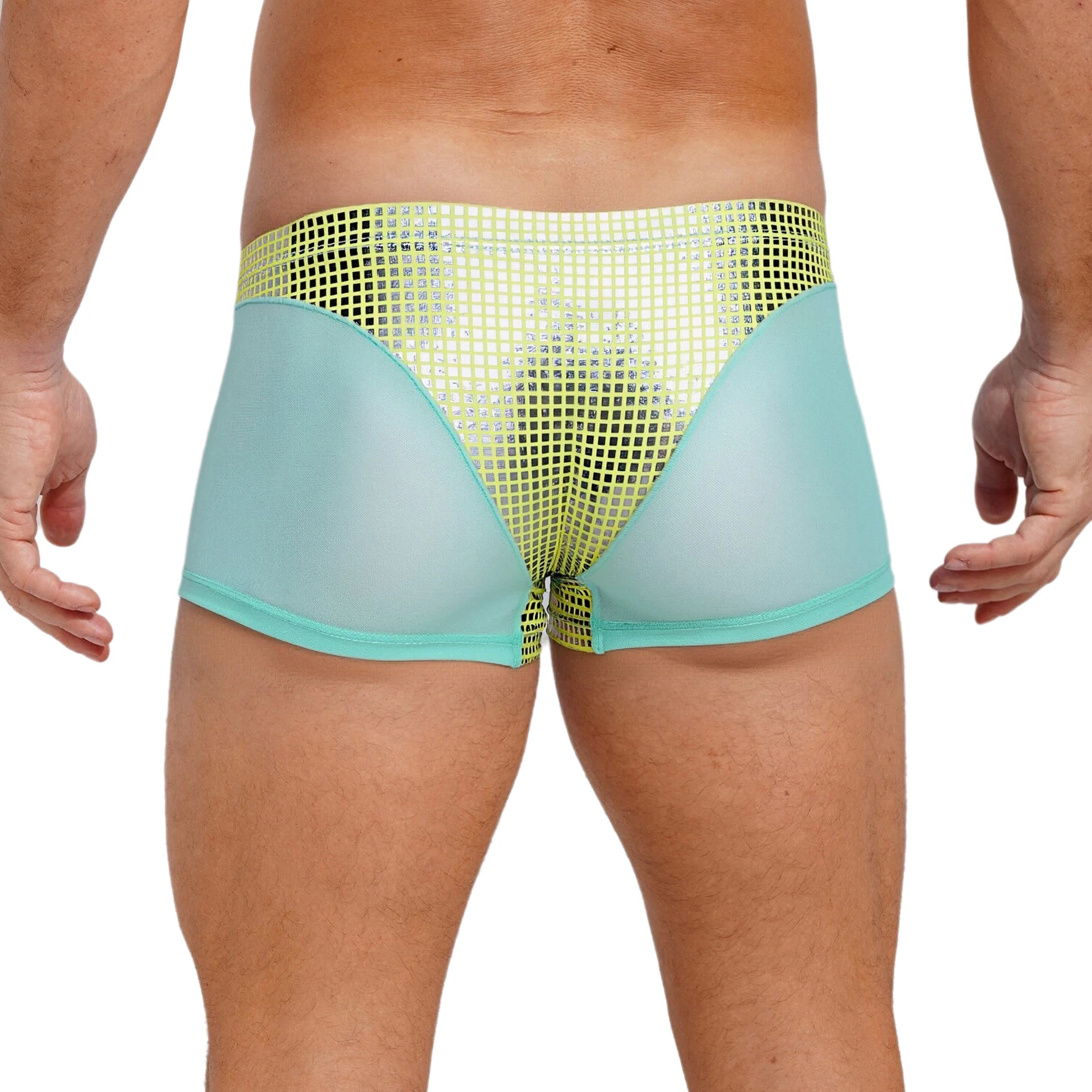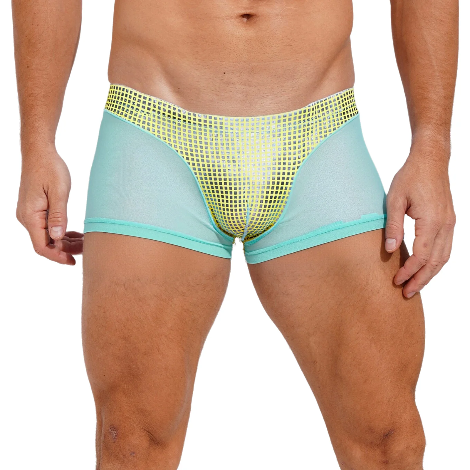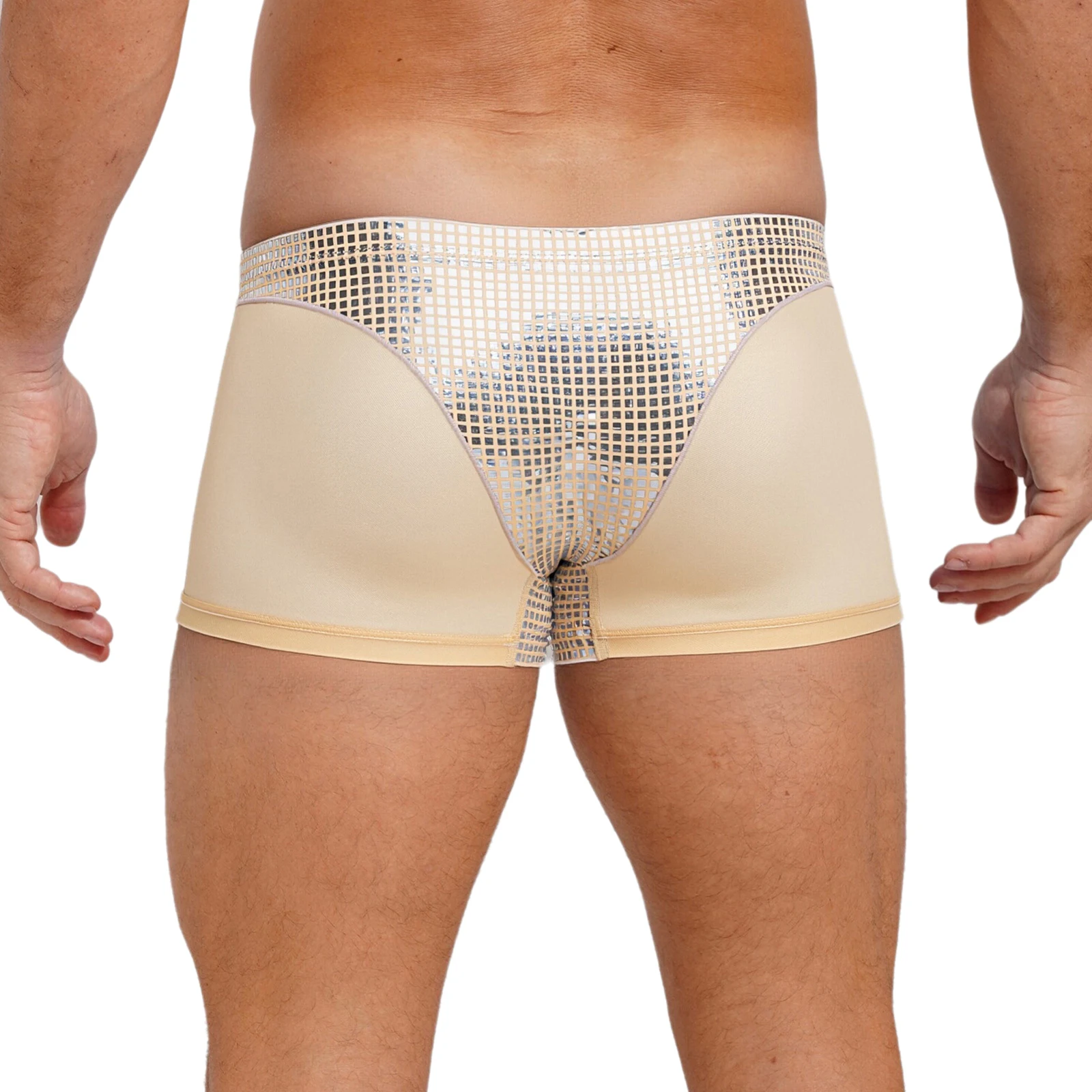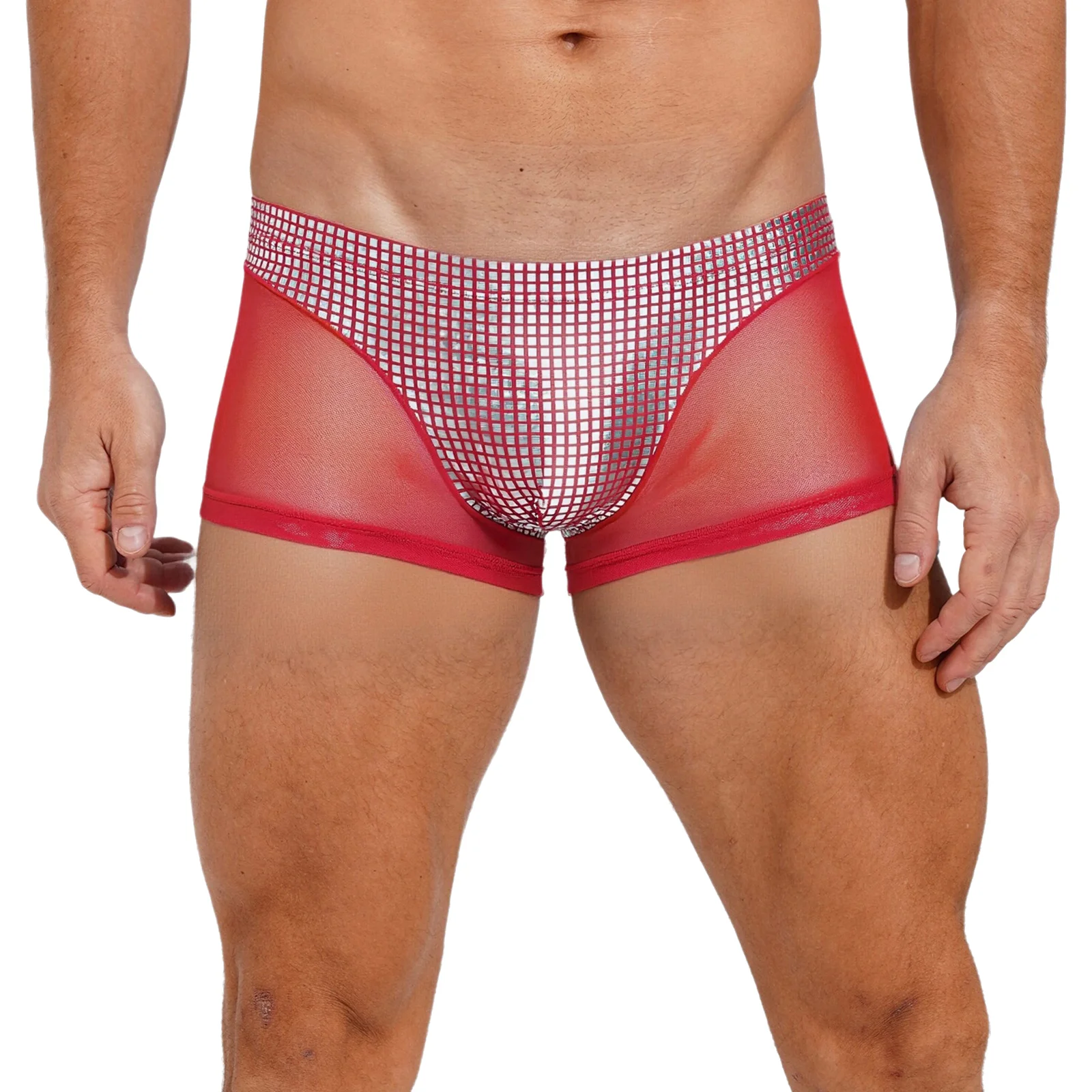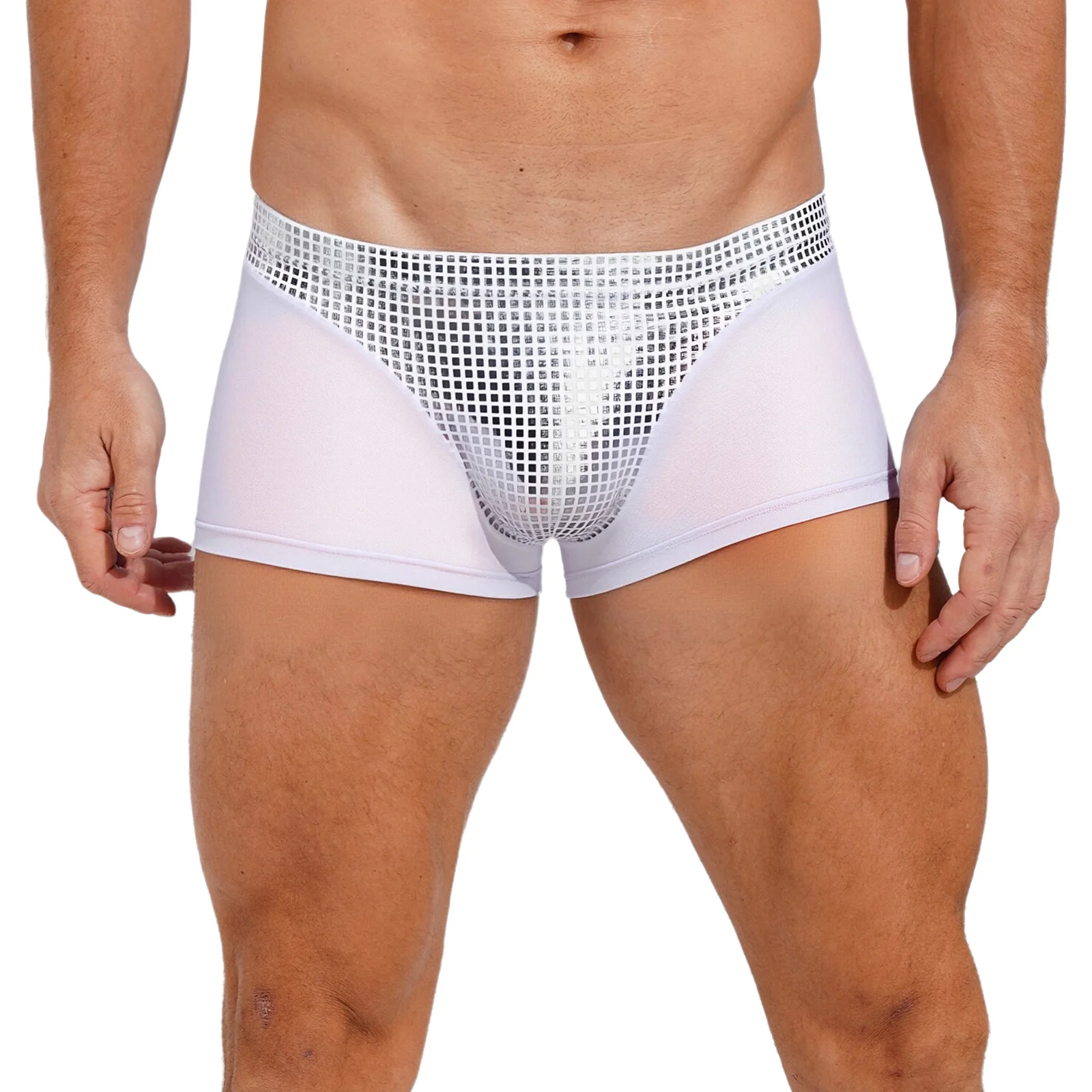 Mens Metallic Shiny Boxer Short Plaid And Mesh Patchwork Shorts Swimming Trunks Breathable Briefs Underwear for Beach Club Party