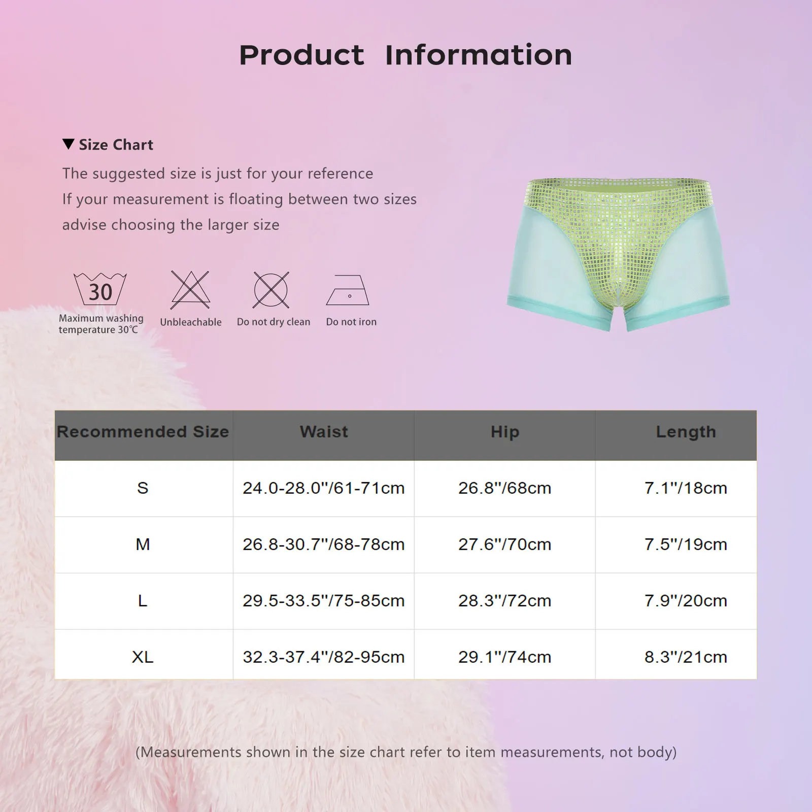 (Measurements shown in the size chart refer to item measurements, not body)