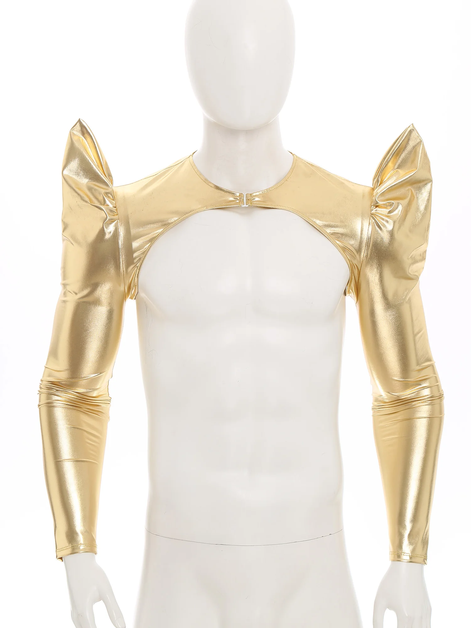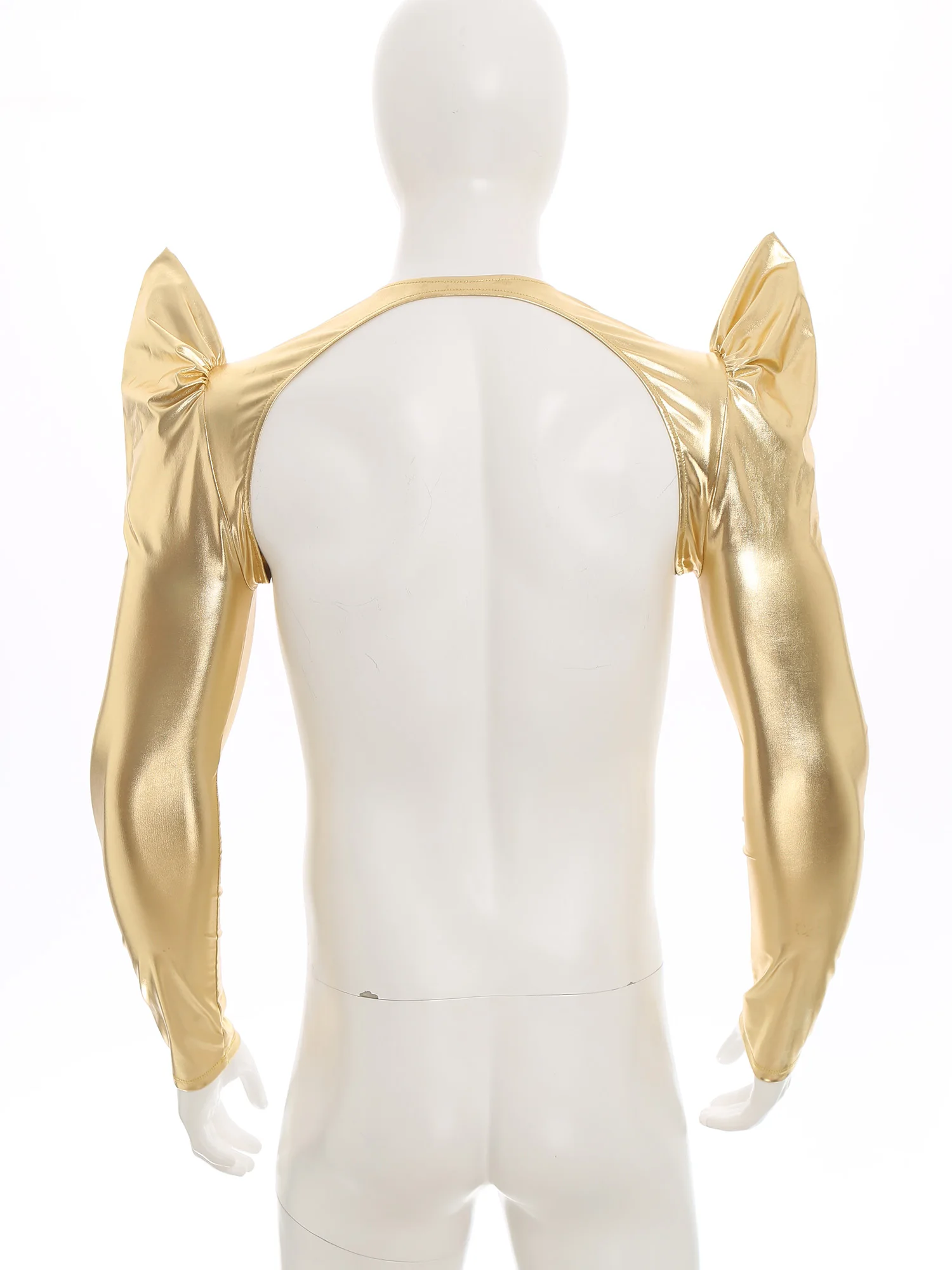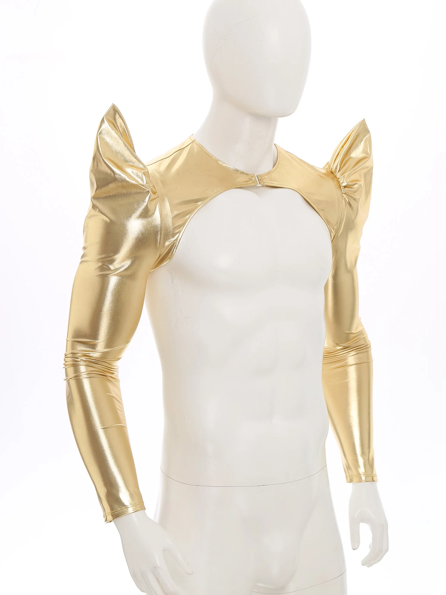 Mens Metallic Shiny Crop Tops Crew Neck Long Sleeve Rising Shoulder Crop Blouse Shoulder Cover Layering Fclubwear Party Costume