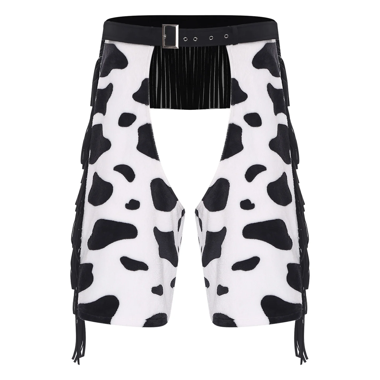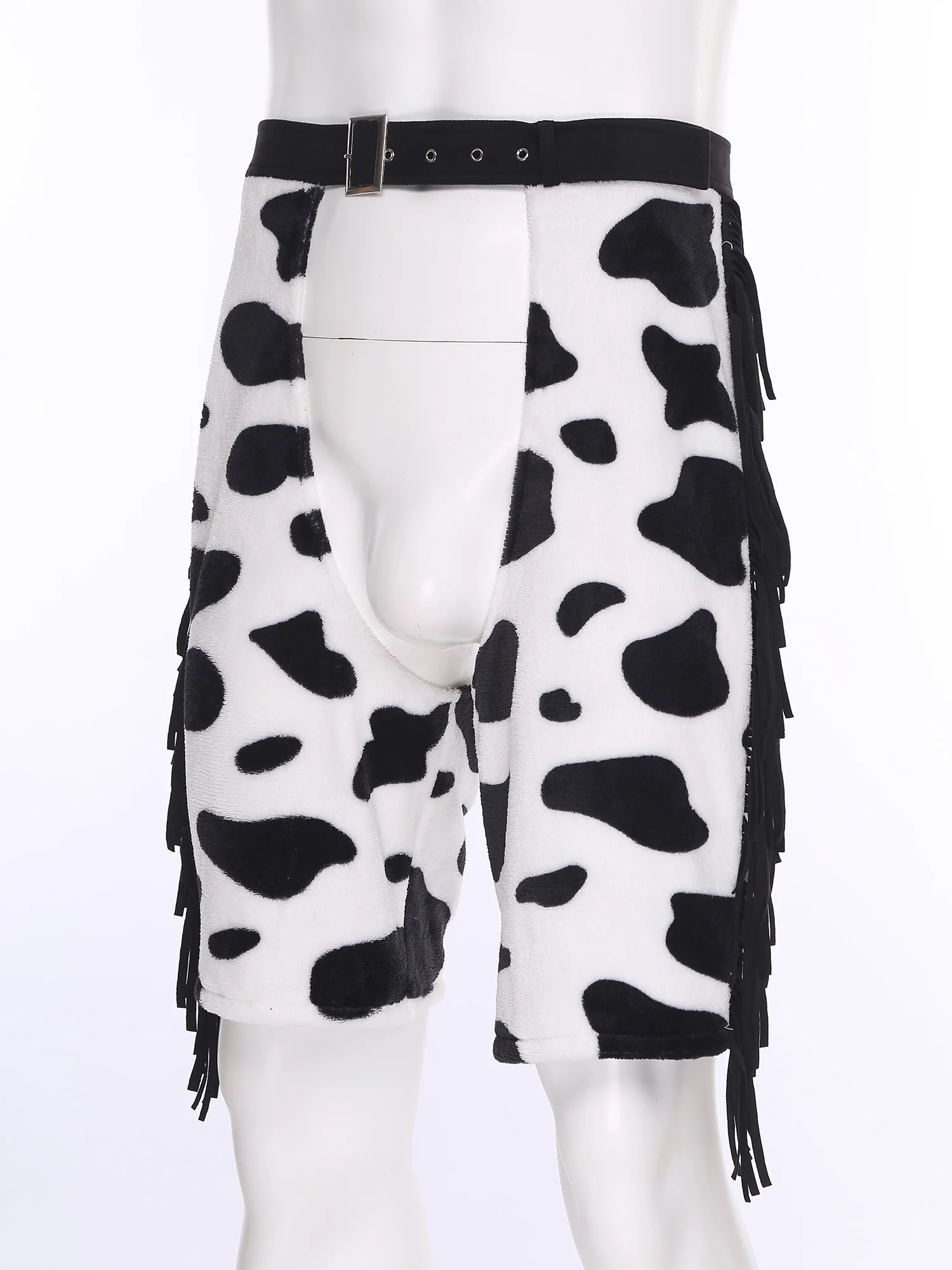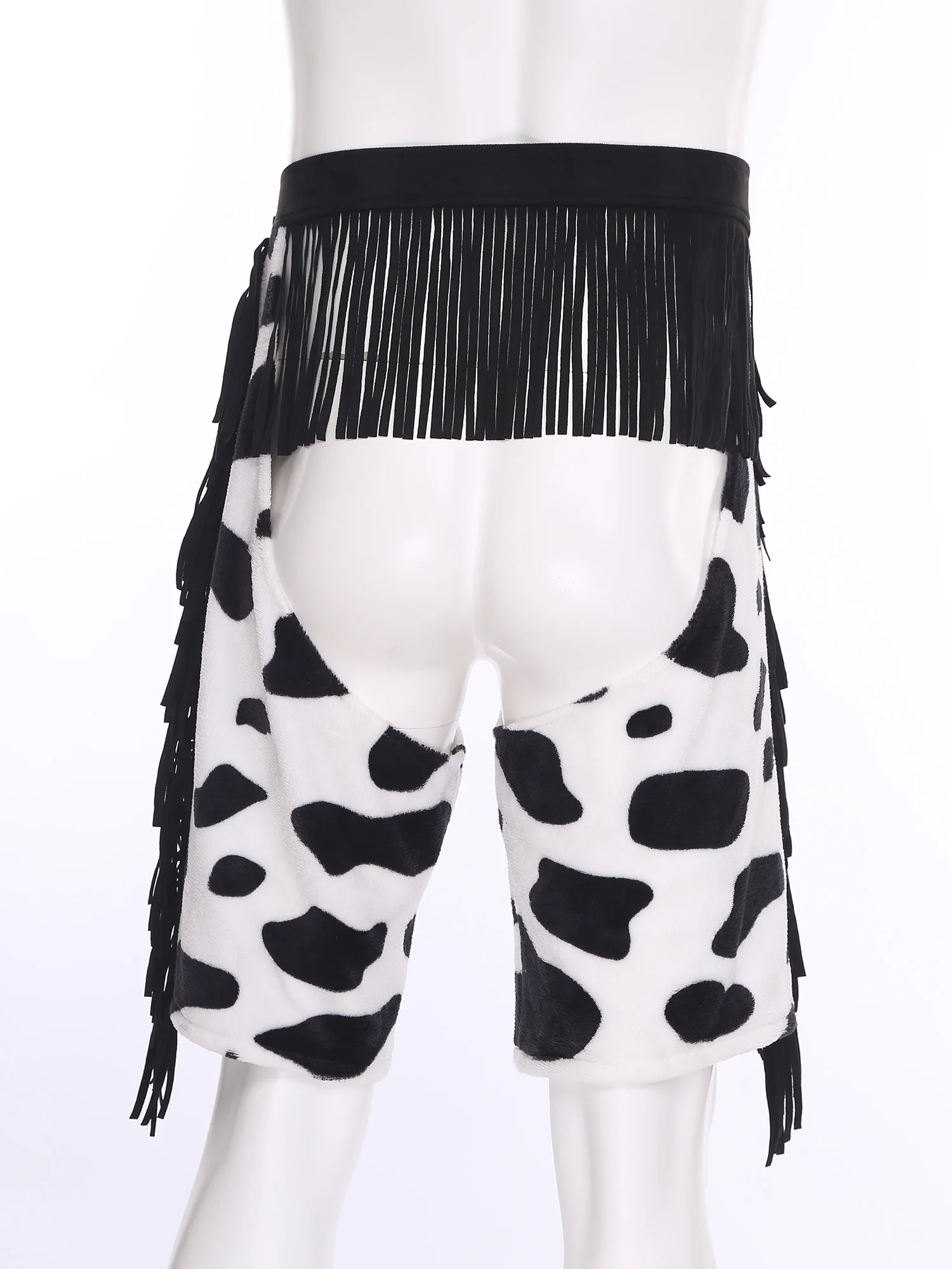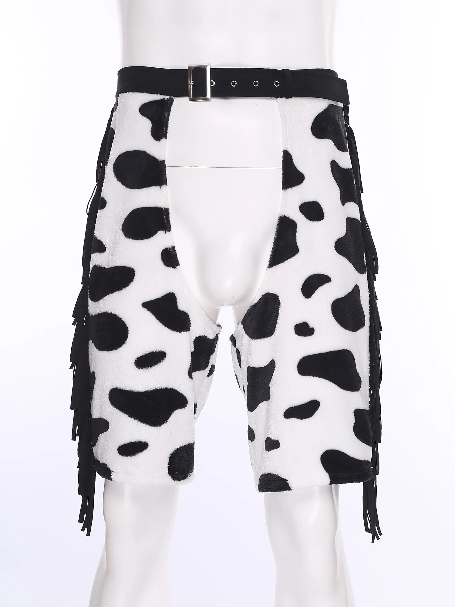 Mens Vintage Cowboy Chaps Halloween Cosplay Costume Cow Spot Tassel Fringe Print Flannel Hollow-out Crotch Shorts Raves Party