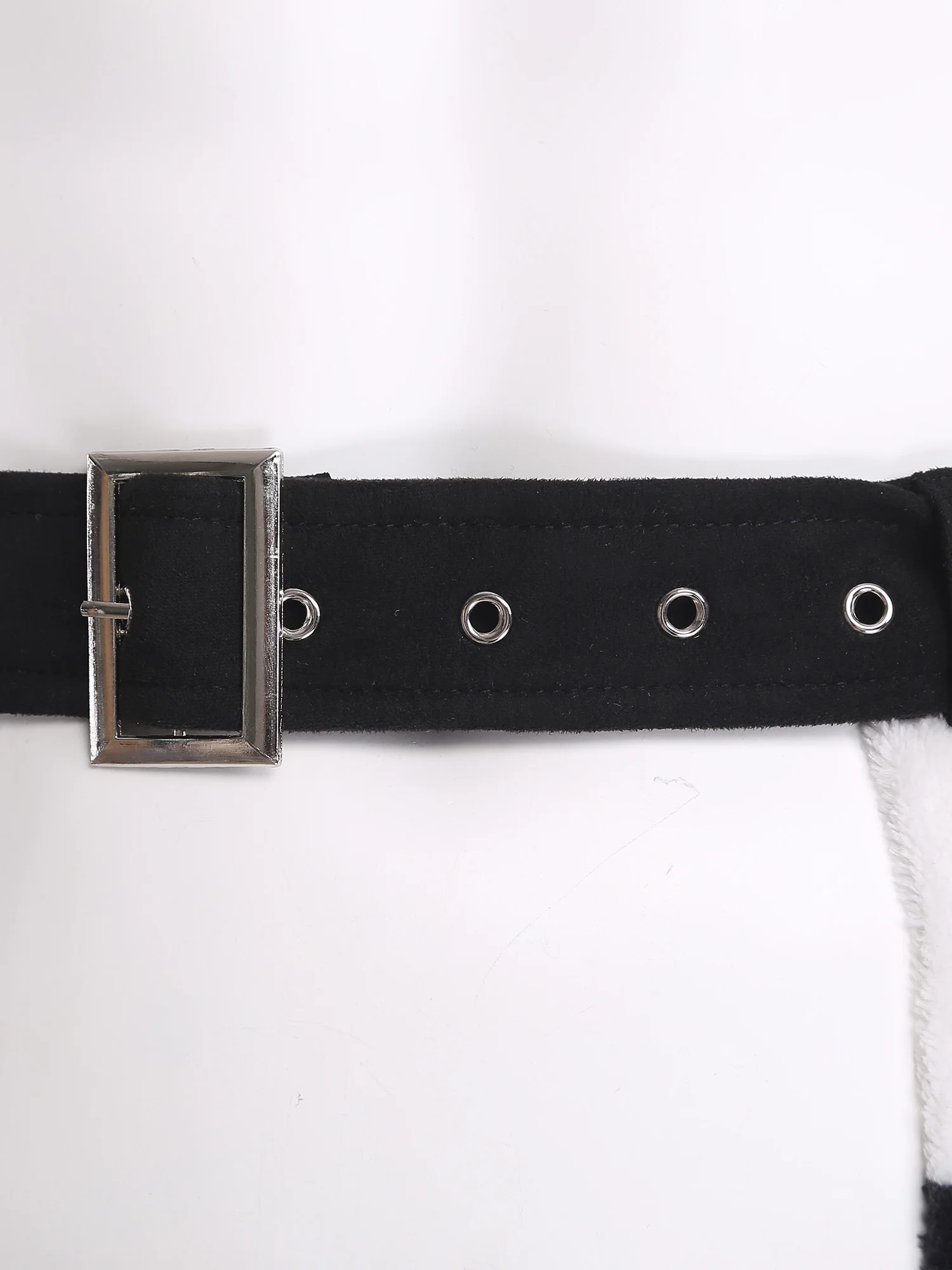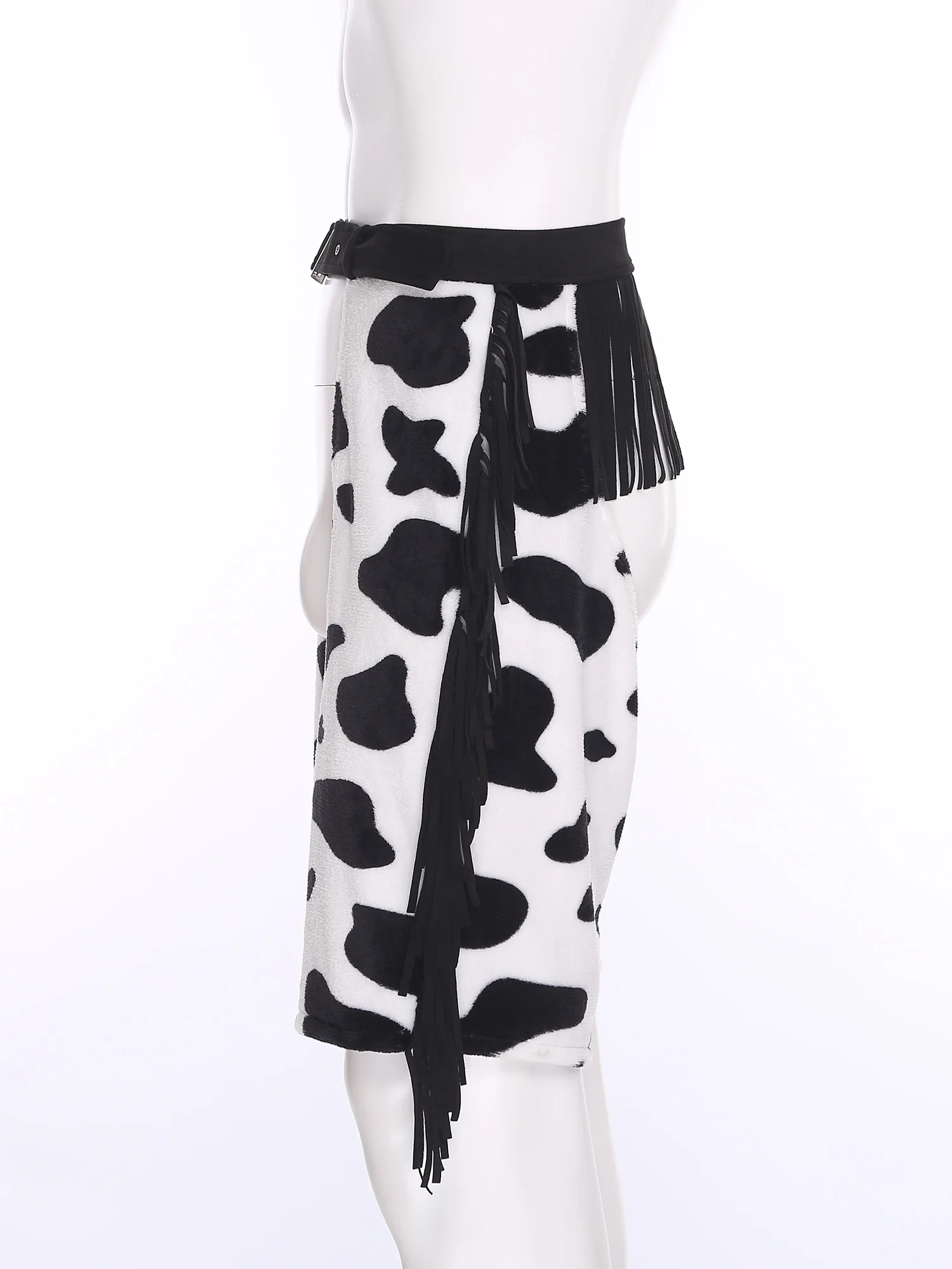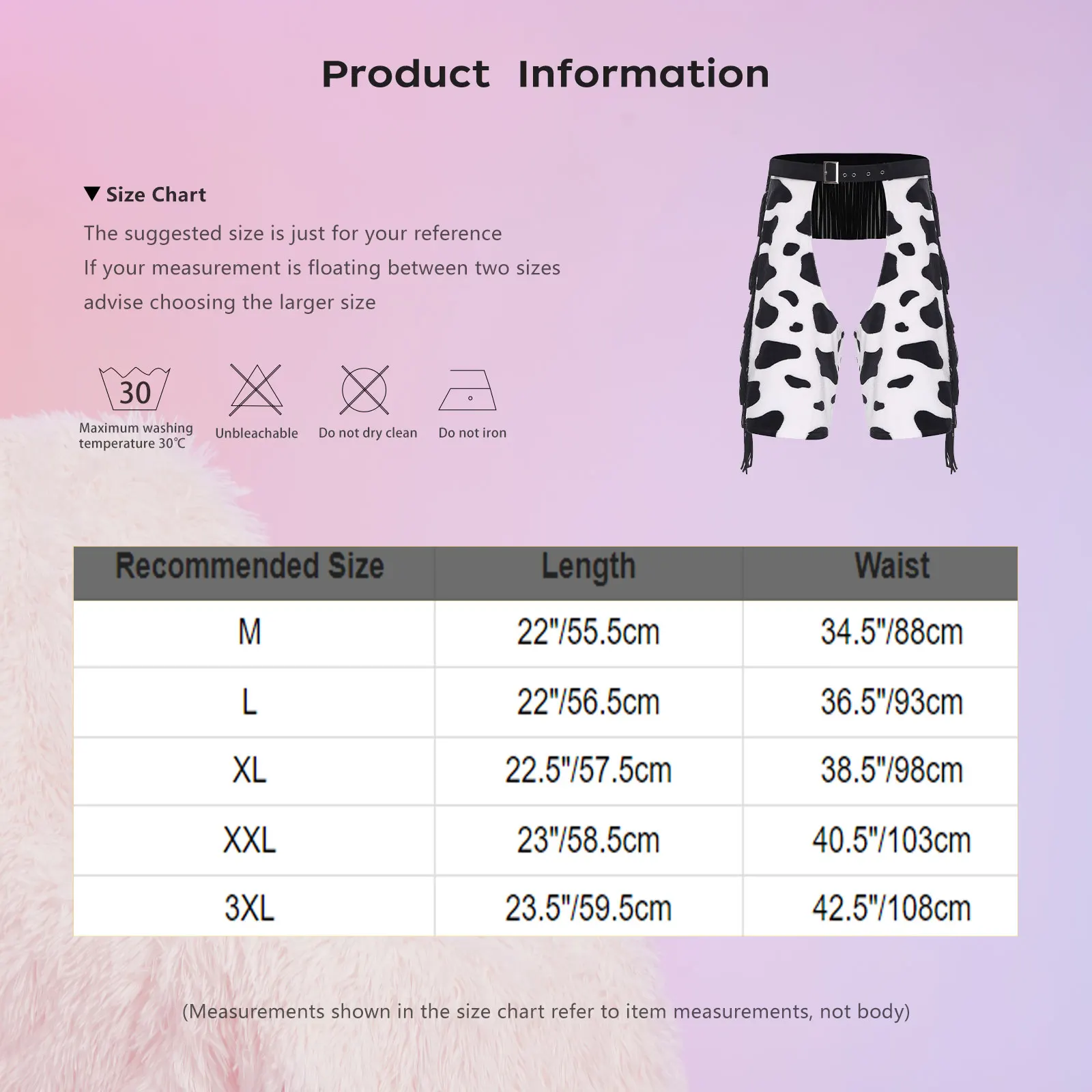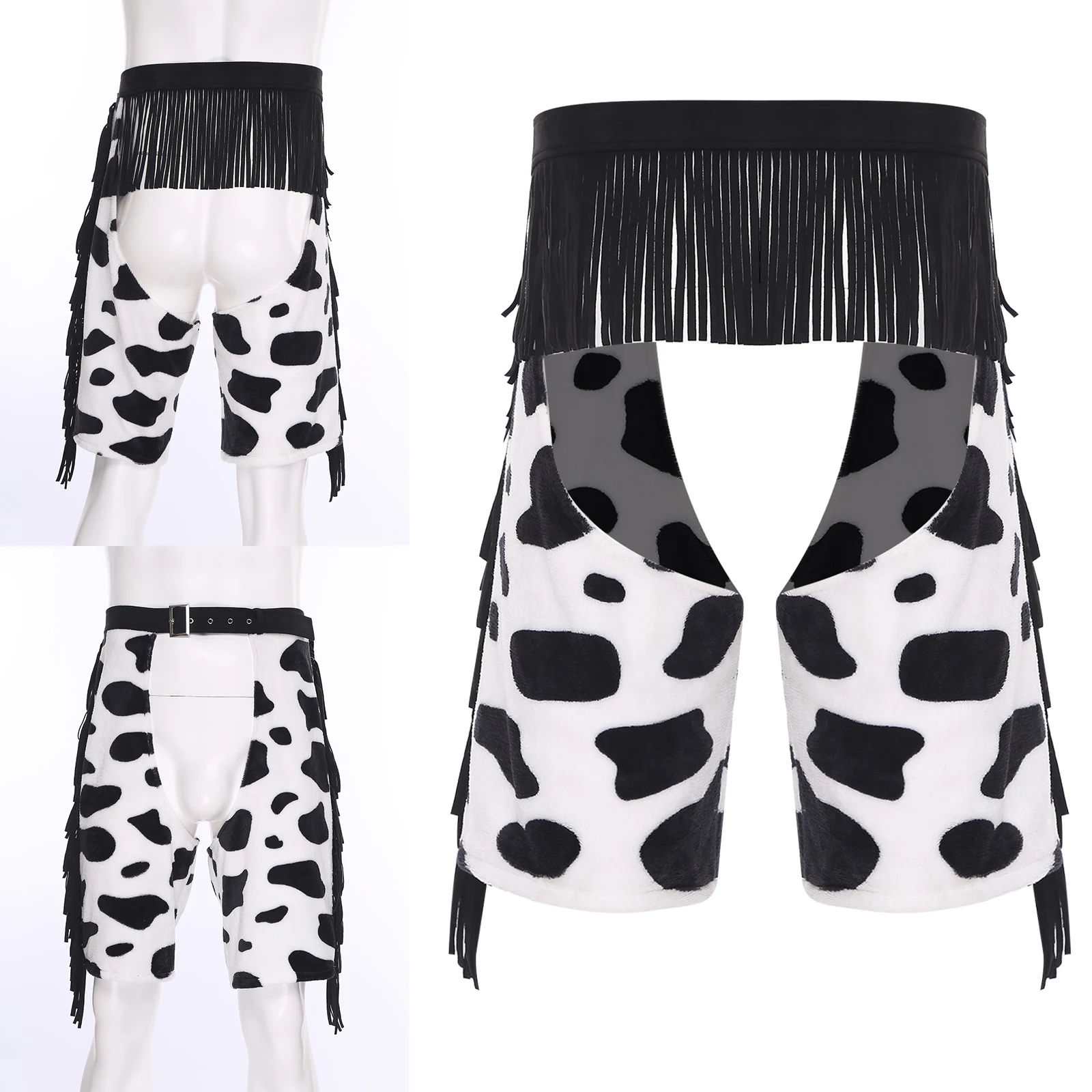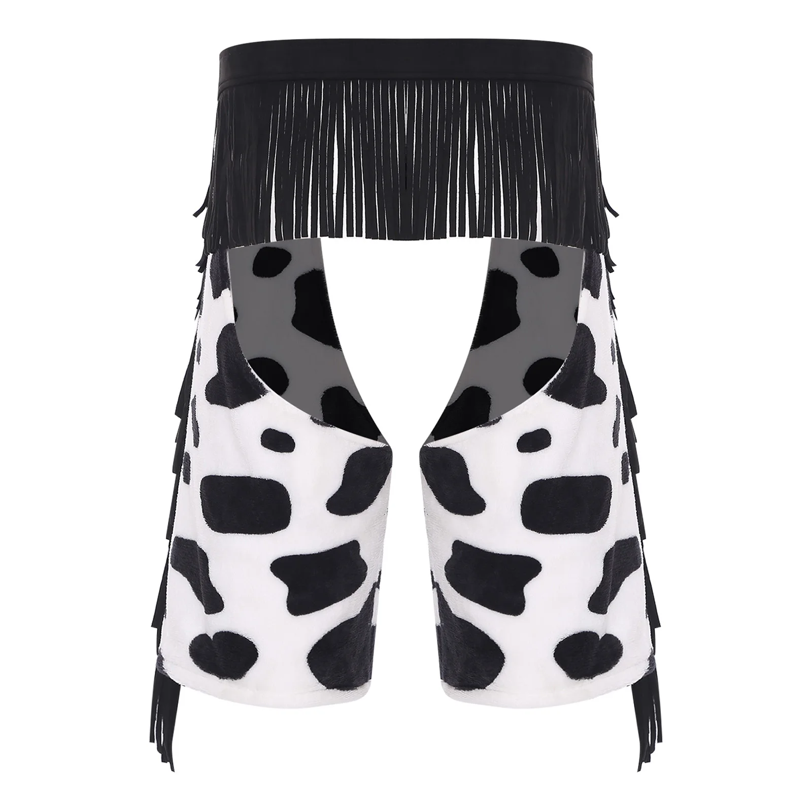 Mens Vintage Cowboy Chaps Halloween Cosplay Costume Cow Spot Tassel Fringe Print Flannel Hollow-out Crotch Shorts Raves Party