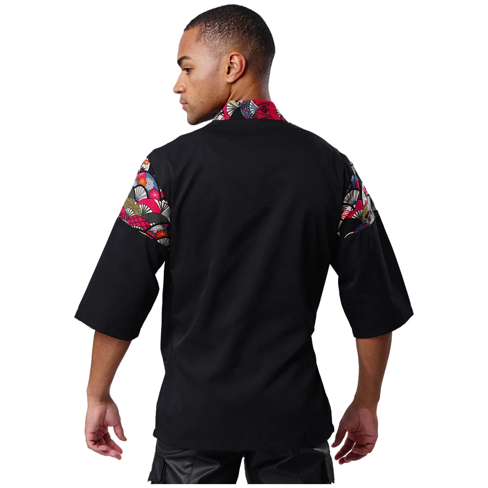 Mens Womens Japanese Sushi Chef Coat Traditional Floral Printed Lace-up Kimono Jackets Japanese Cuisine Restaurant Cook Workwear