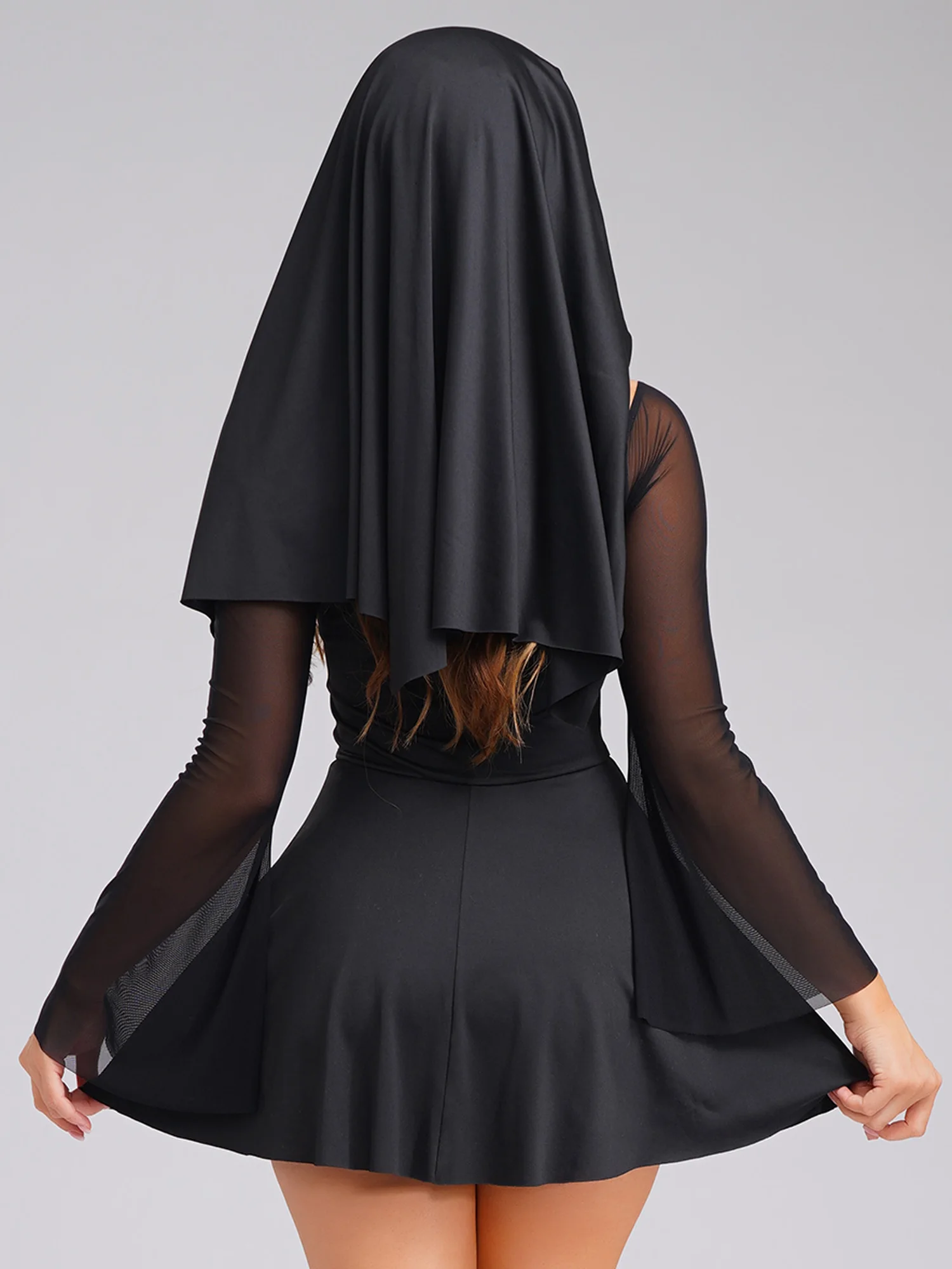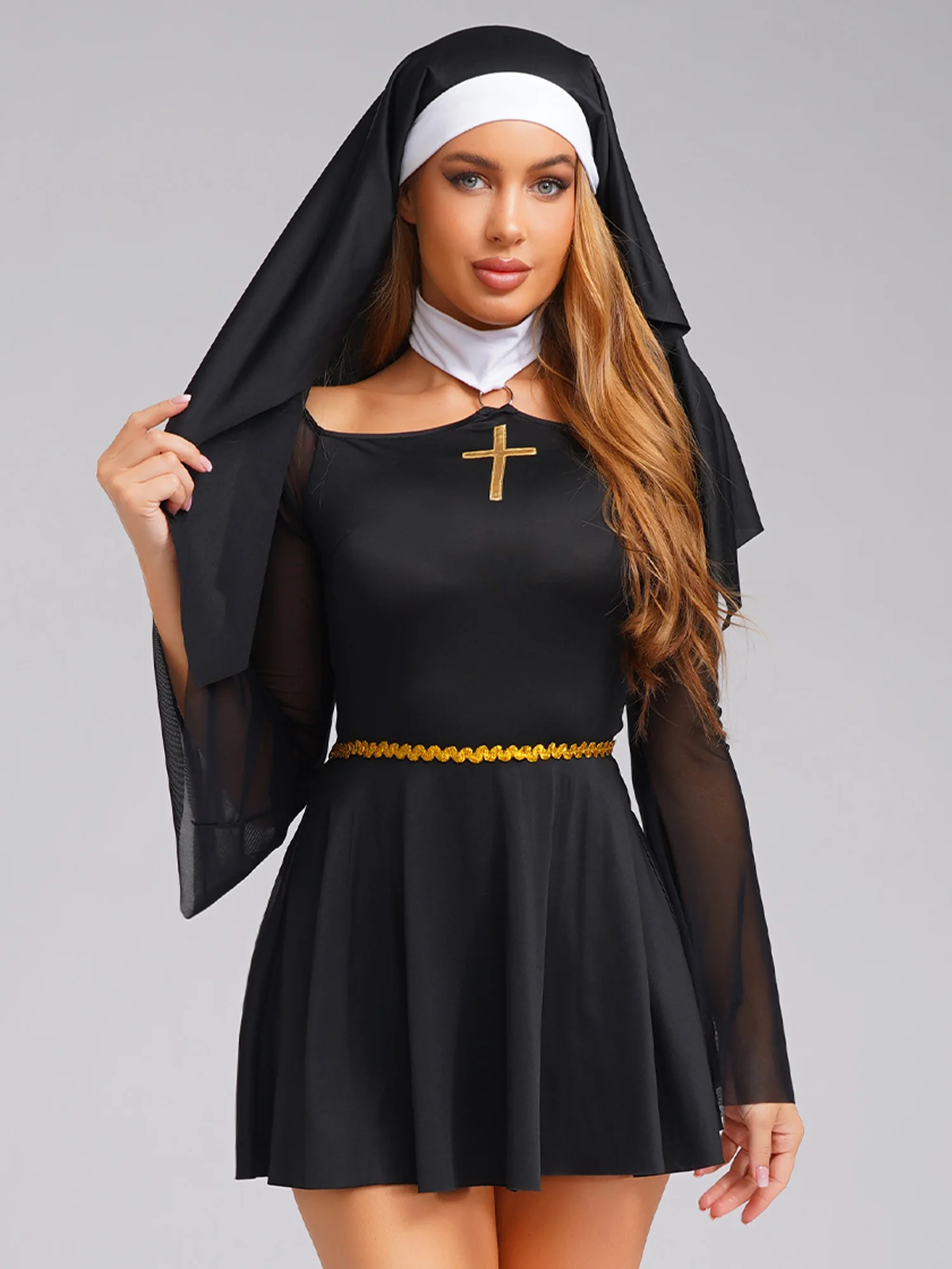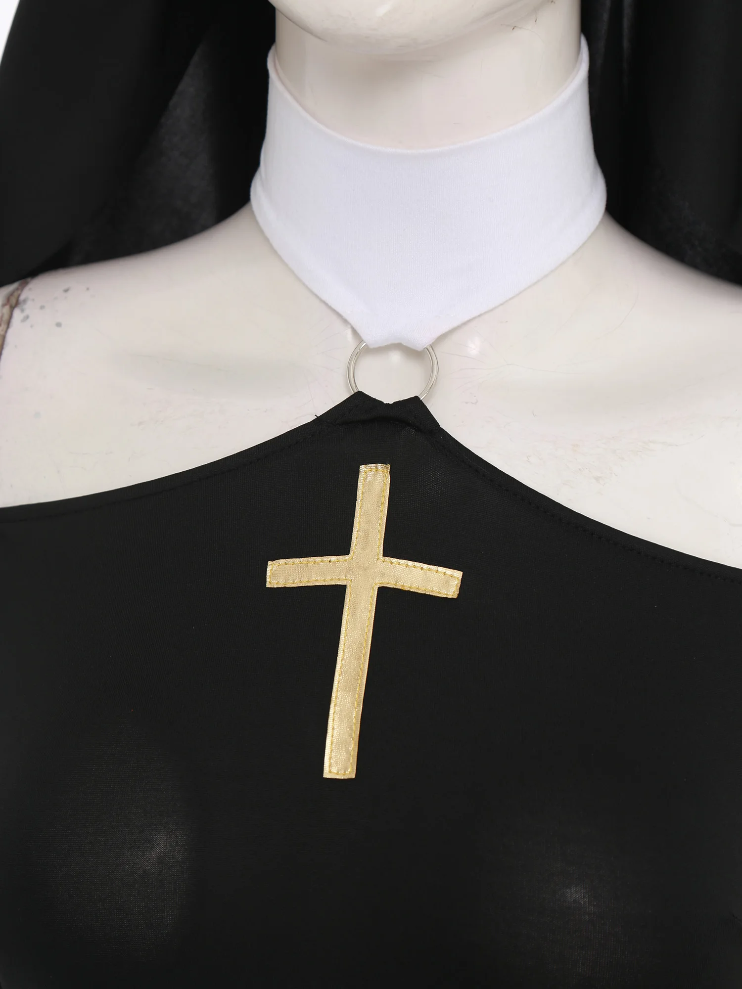 The mesh long-sleeve details give an edgy and mysterious vibe. Gold cross patchwork at the chest is a clear element of nun.