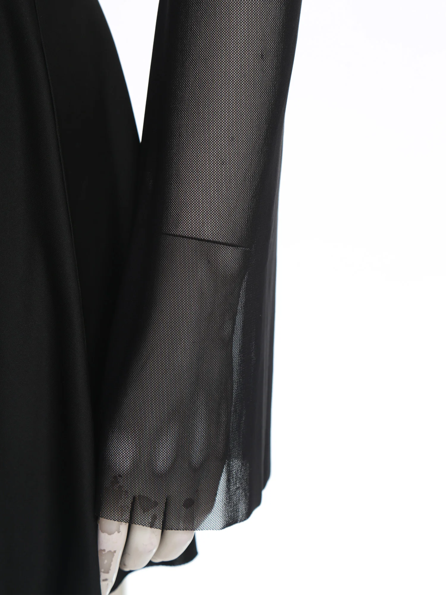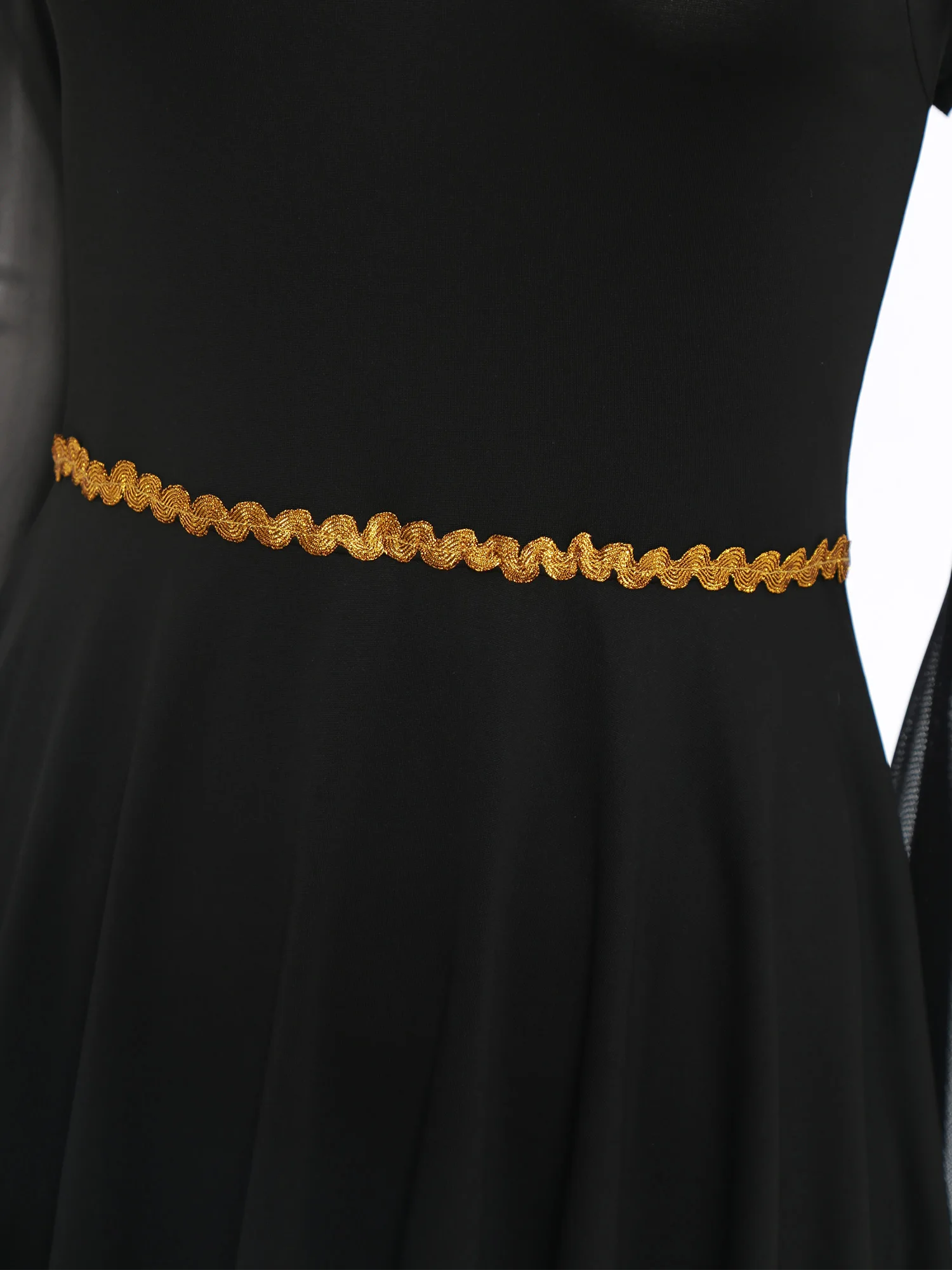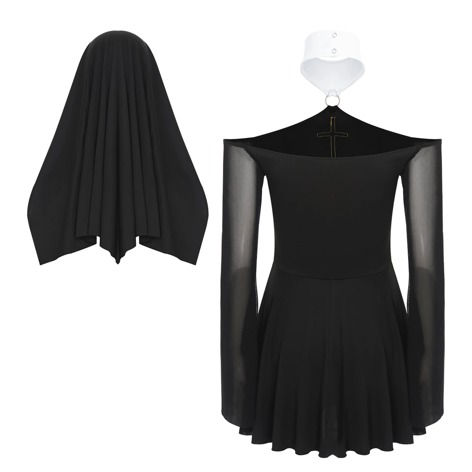 The mesh long-sleeve details give an edgy and mysterious vibe. Gold cross patchwork at the chest is a clear element of nun.
