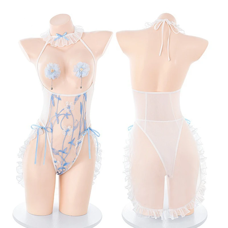 Sexy Embroidery Flower Bodysuit Women Mesh See Through Underwear Fairy Uniform Role Play Outfits Lingerie Cute Girl Nightwear