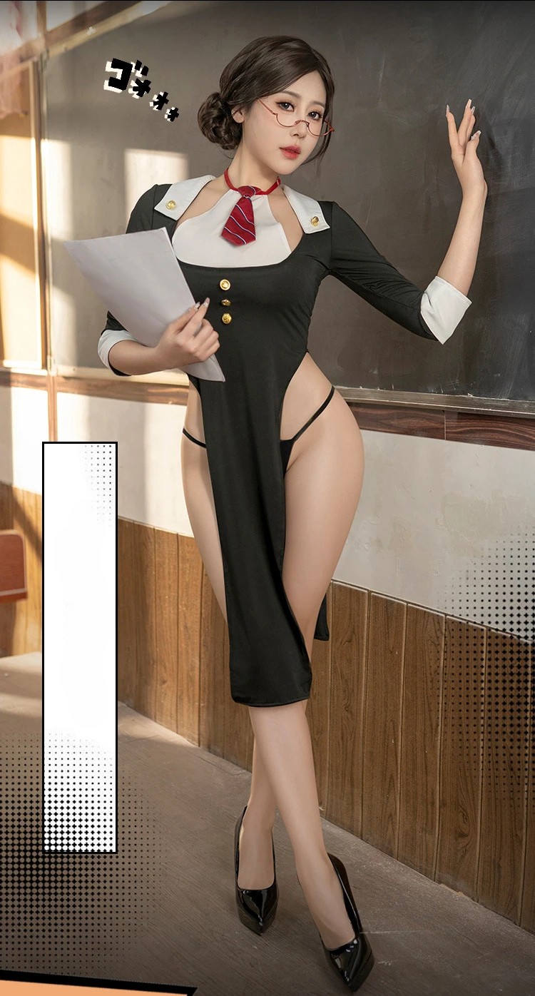 Sexy Private Teacher Uniform Cosplay Costume High Slit Dress Hollow See Through Nightdress Women Underwear Roleplay Outfits