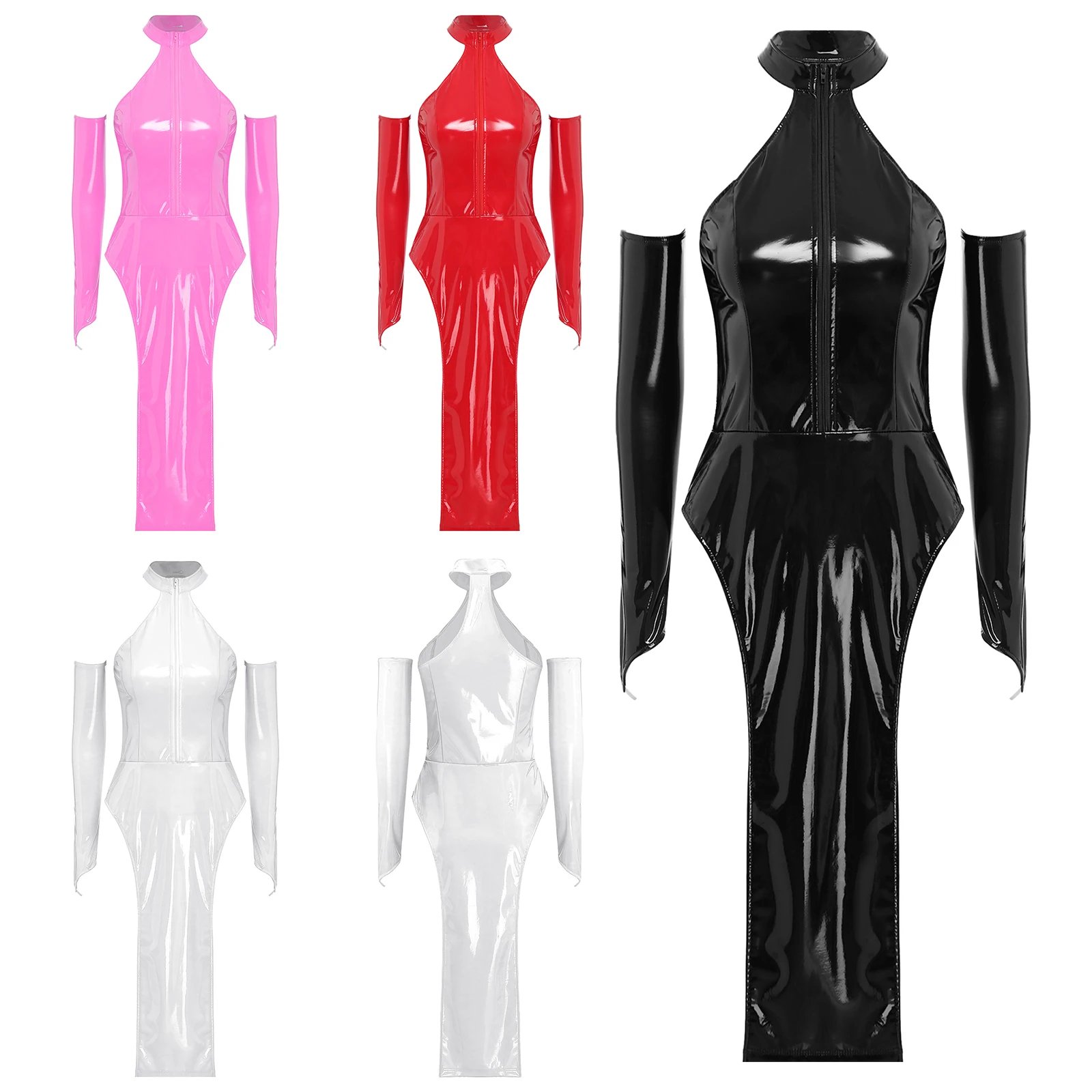 Sexy Womens Wet Look Patent Leather Latex Dress with Removable Sleeves Halter High Slit Bodycon Tights Dress Clubwear Nightwear
