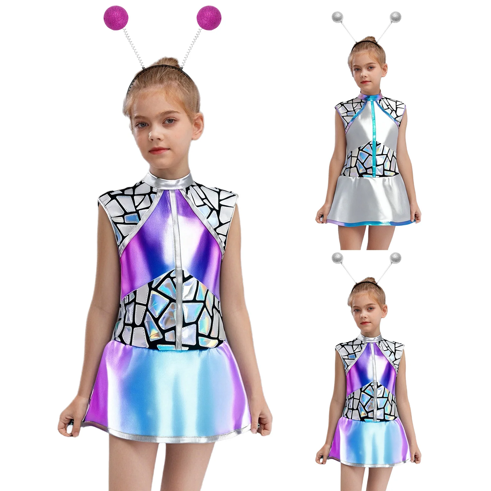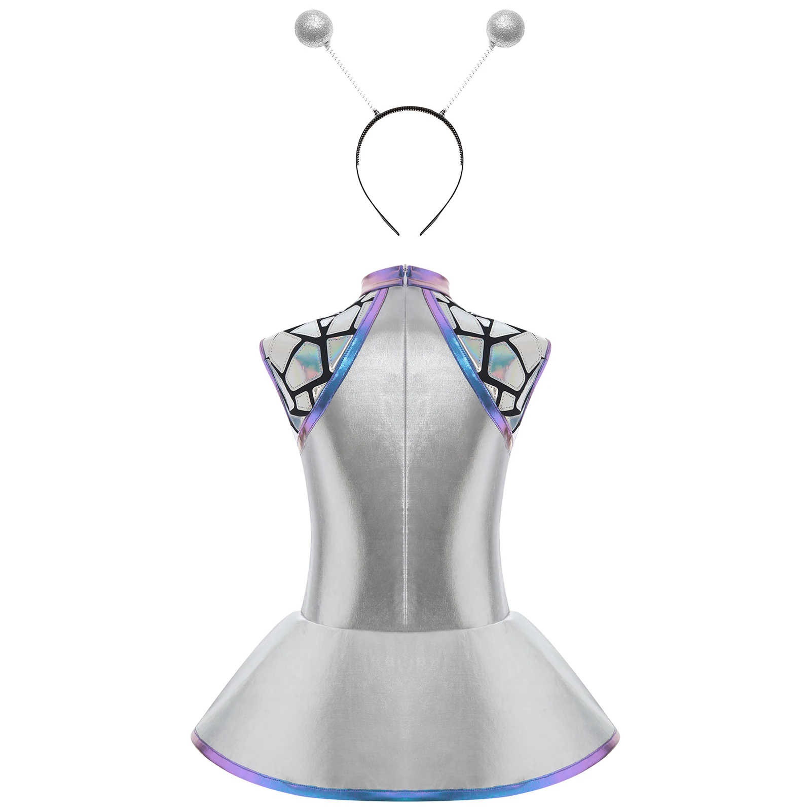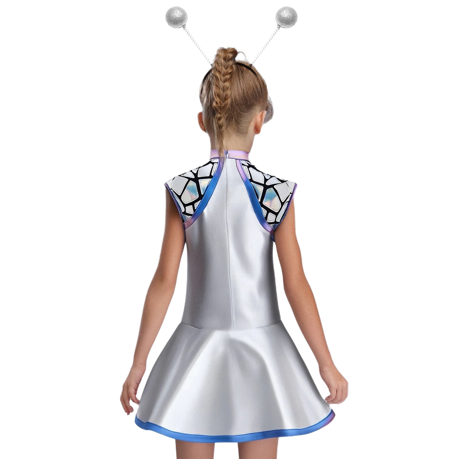 Teen Girls Alien Role Play Costume Outer Space Cosplay Set Metallic Shiny A-lined Dress and Hair Hoop Halloween Space Man Outfit
