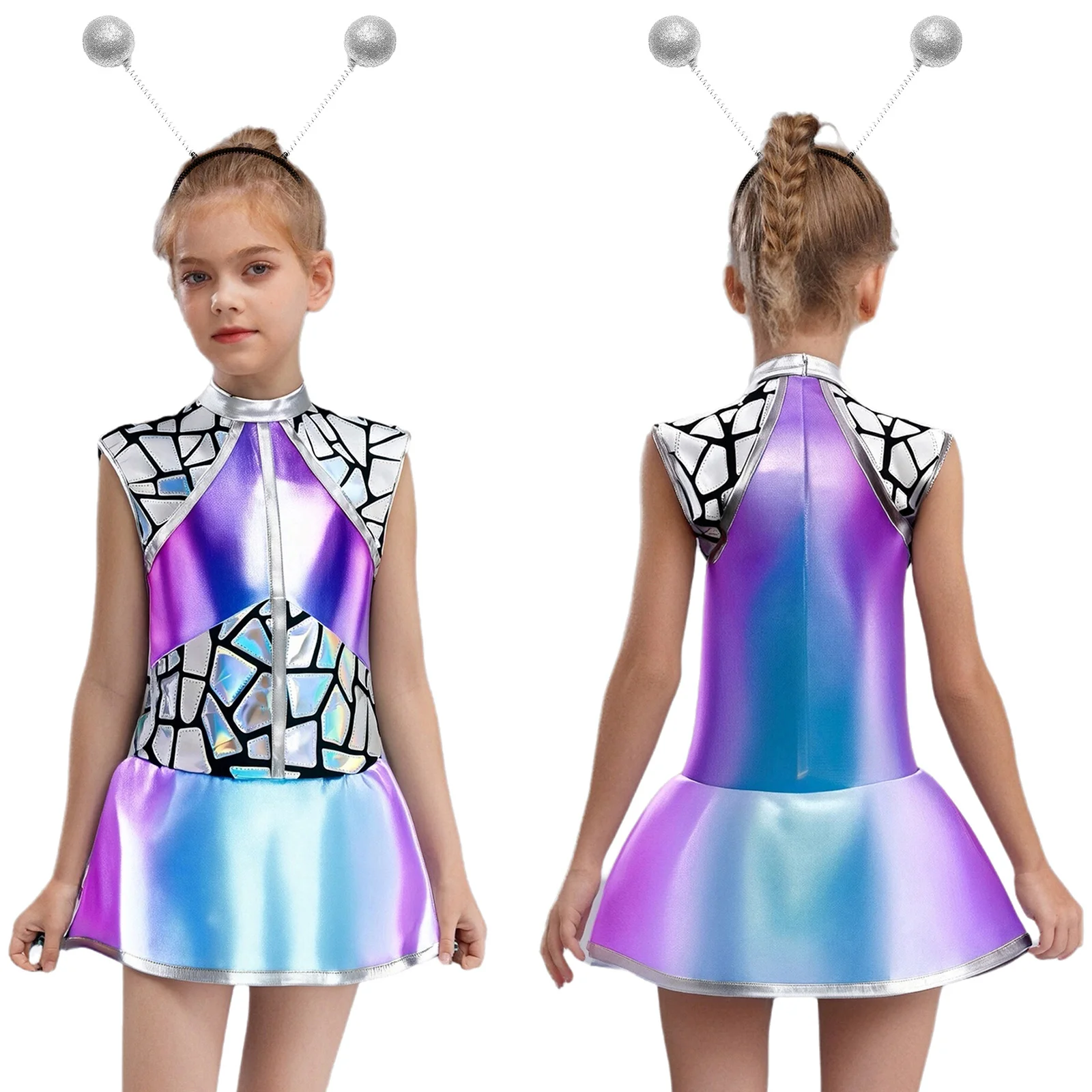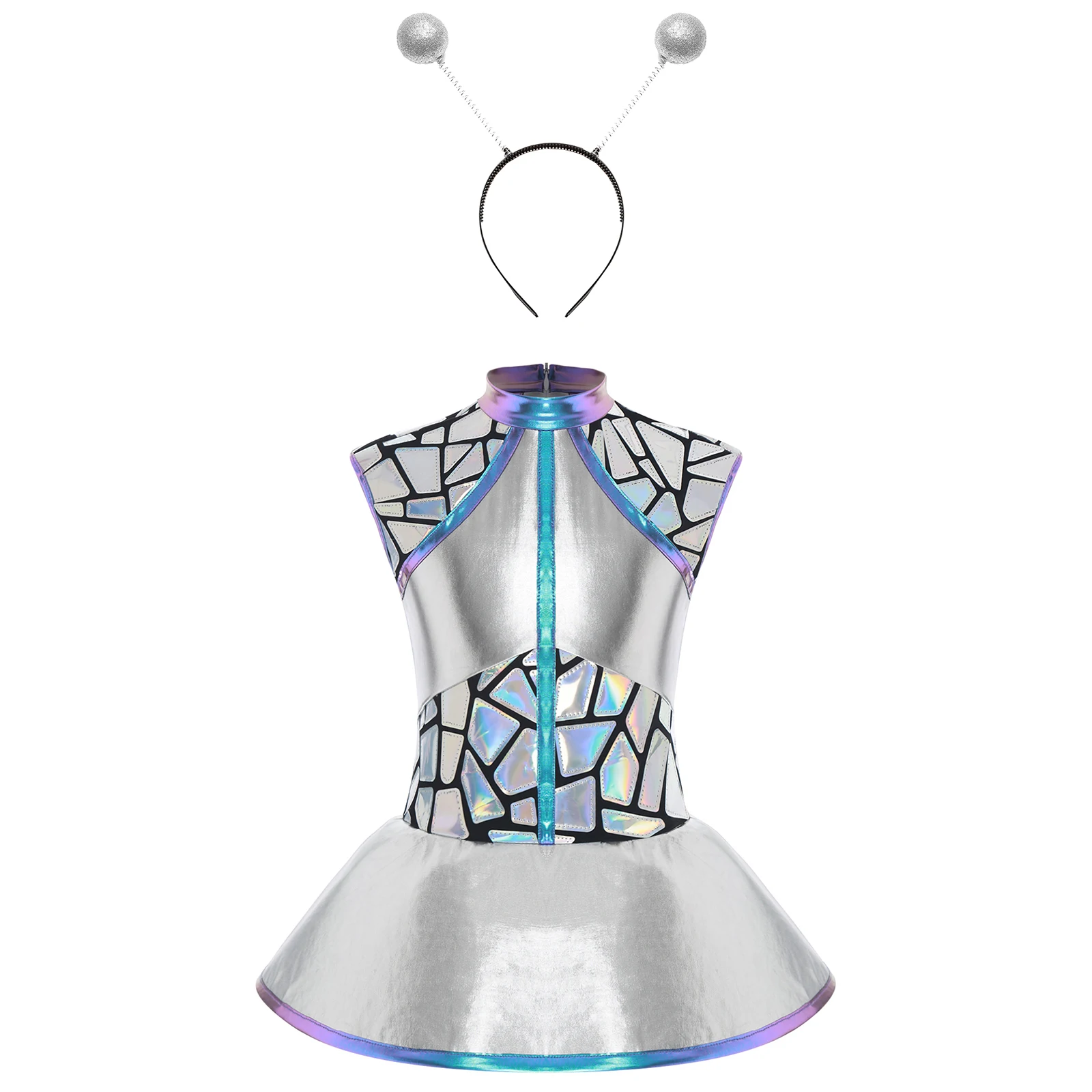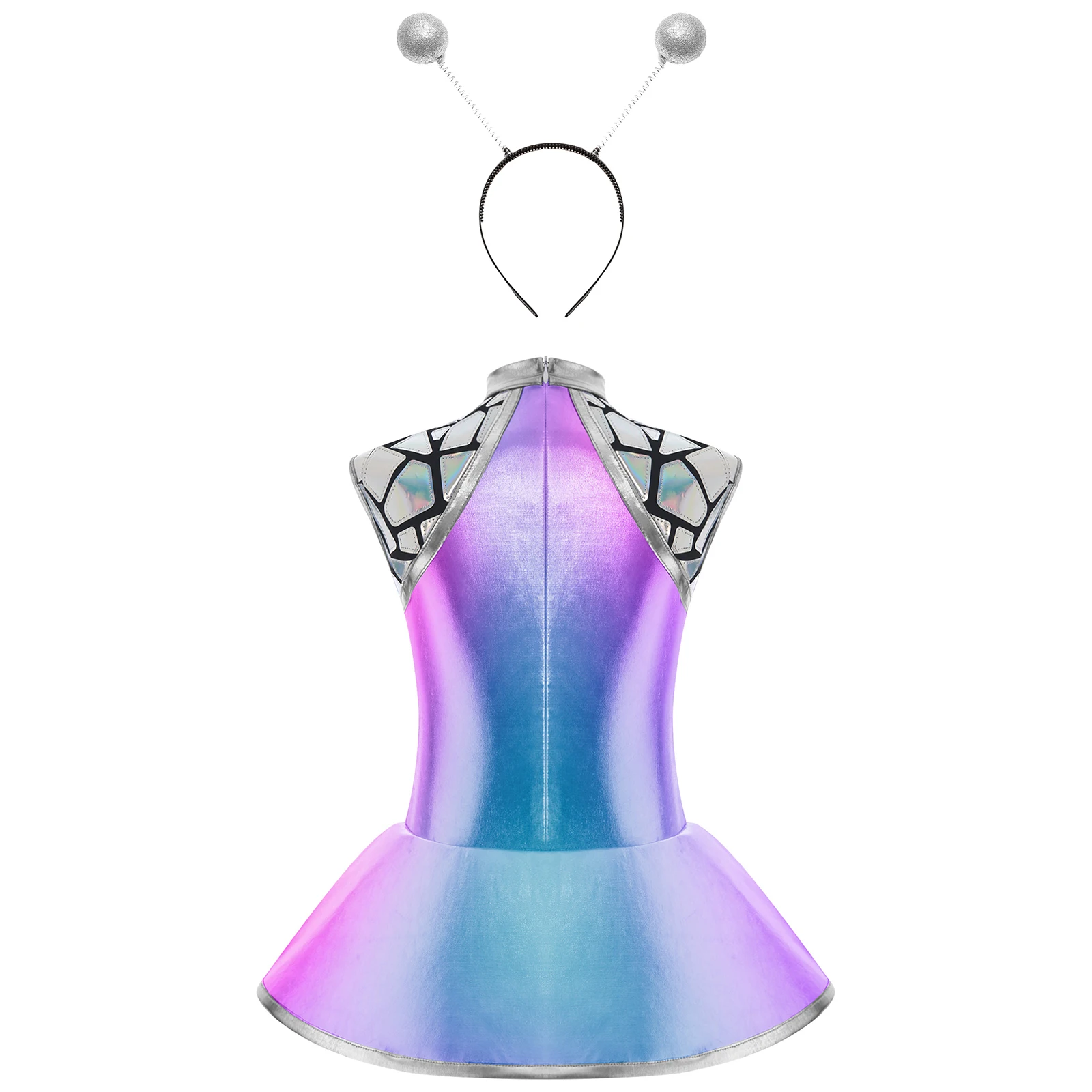 Teen Girls Alien Role Play Costume Outer Space Cosplay Set Metallic Shiny A-lined Dress and Hair Hoop Halloween Space Man Outfit