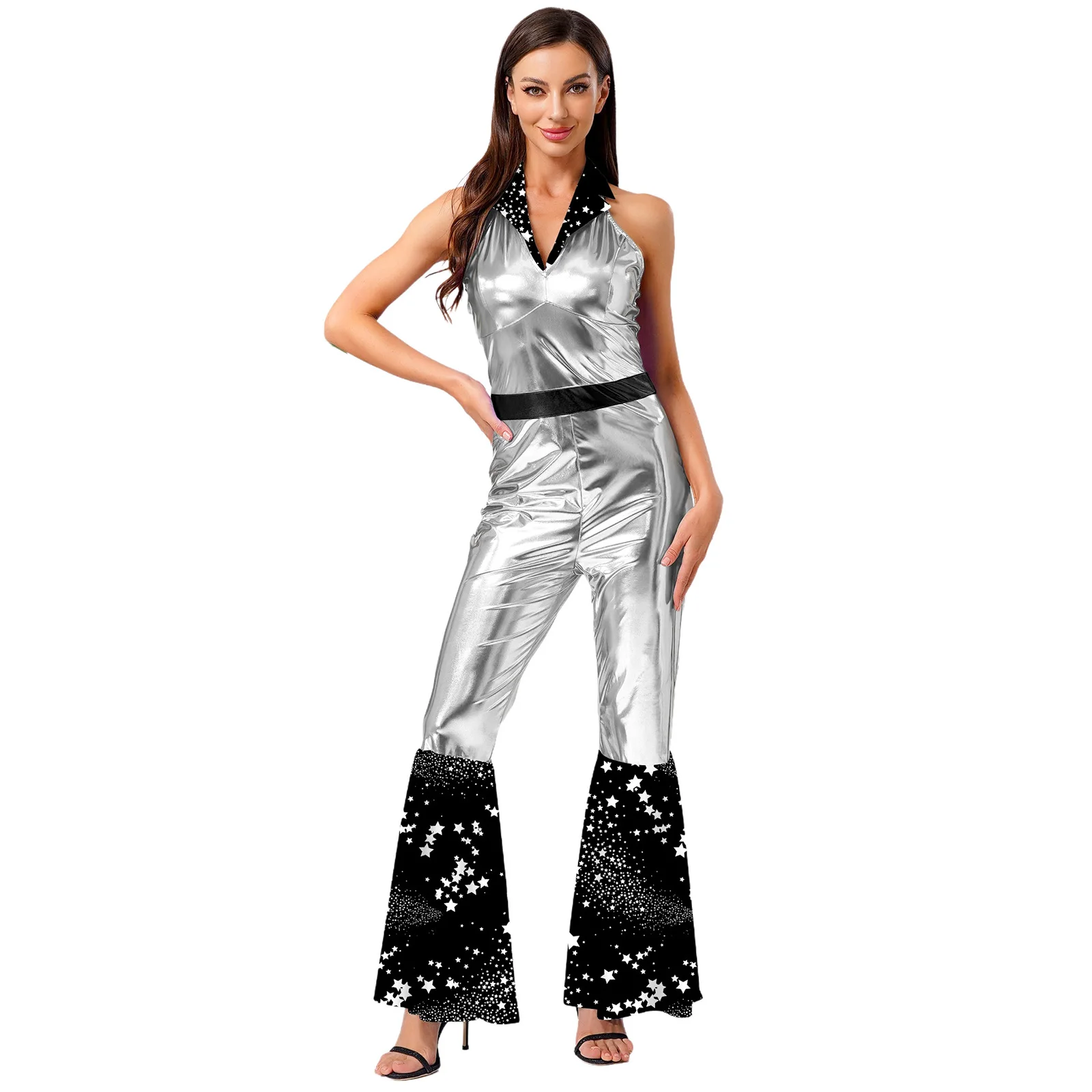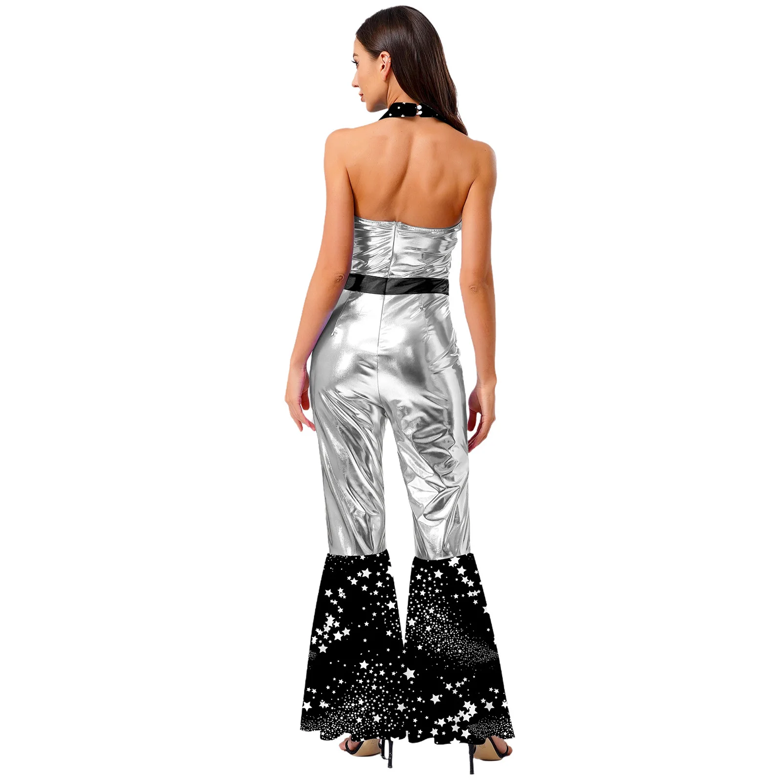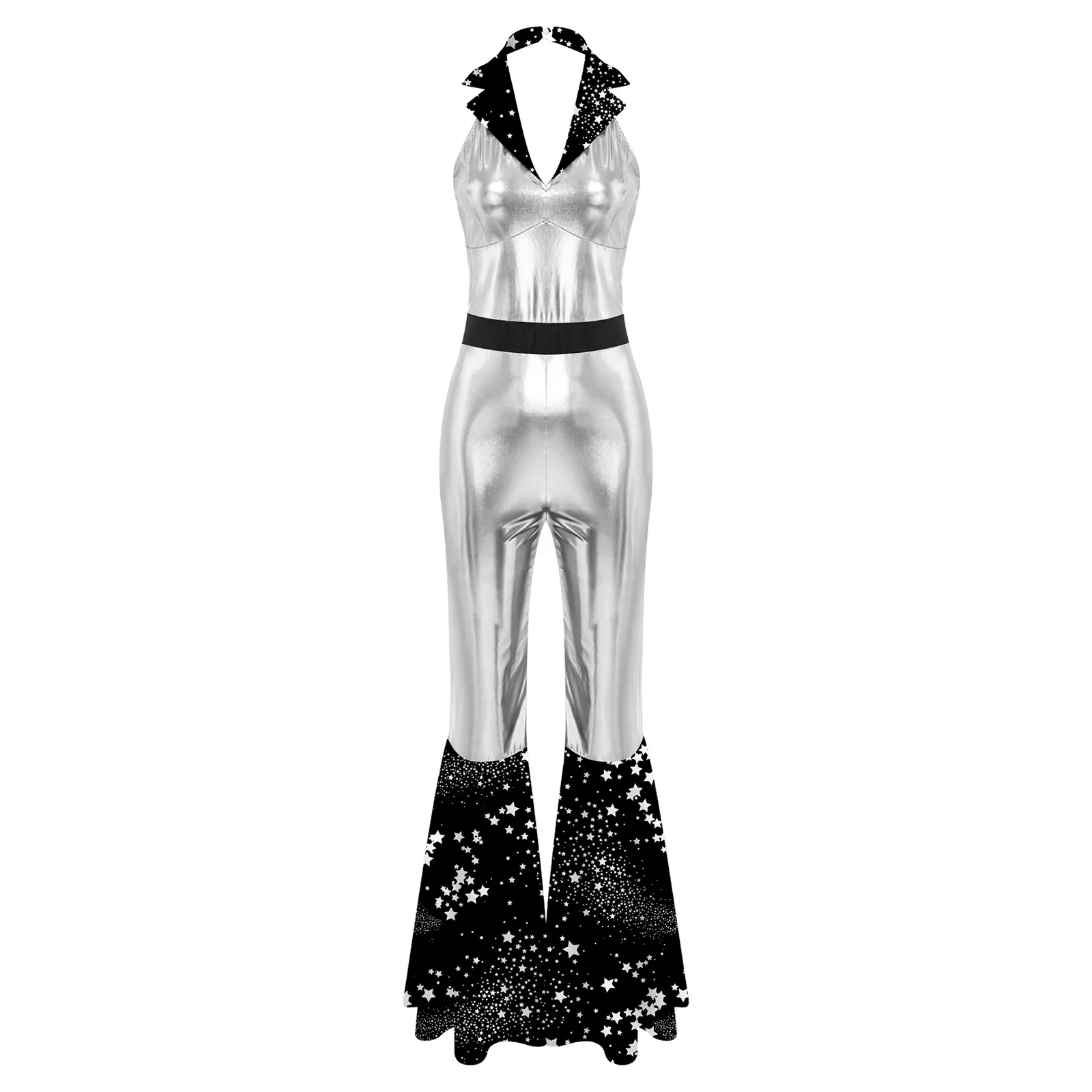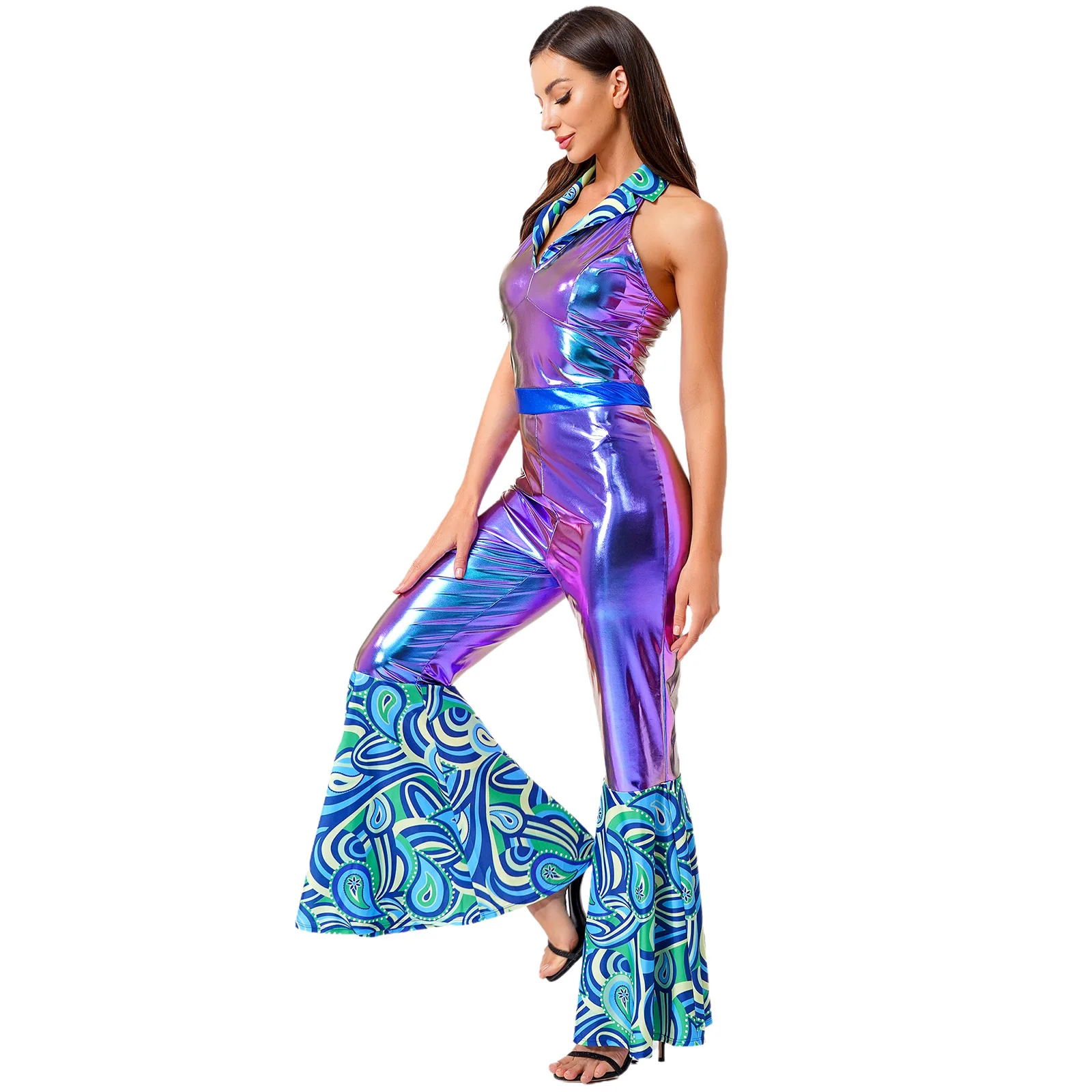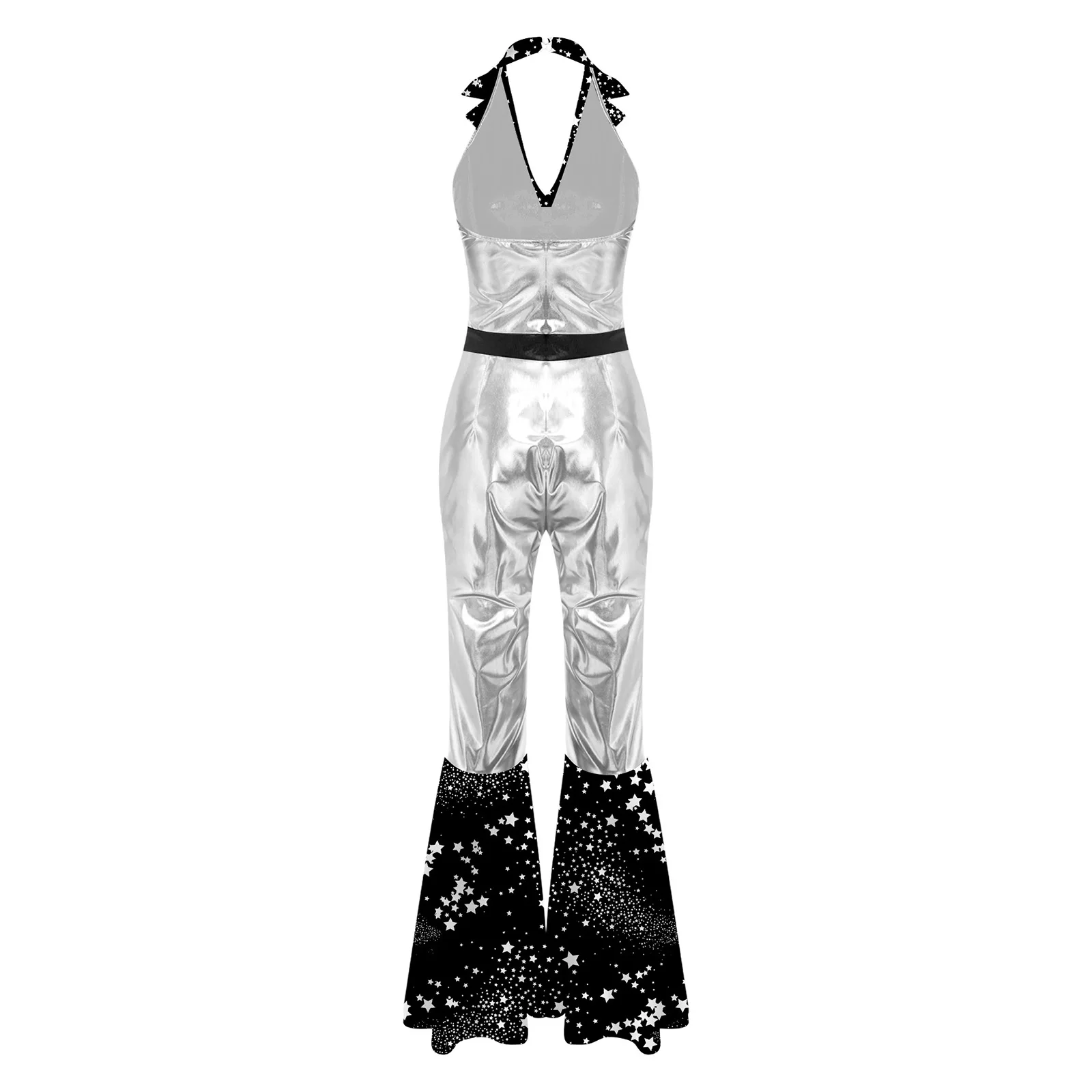 The flared design of the jumpsuit is both fashionable and flattering, suitable for themed parties, nightclubs, masquerades, and dancing events.