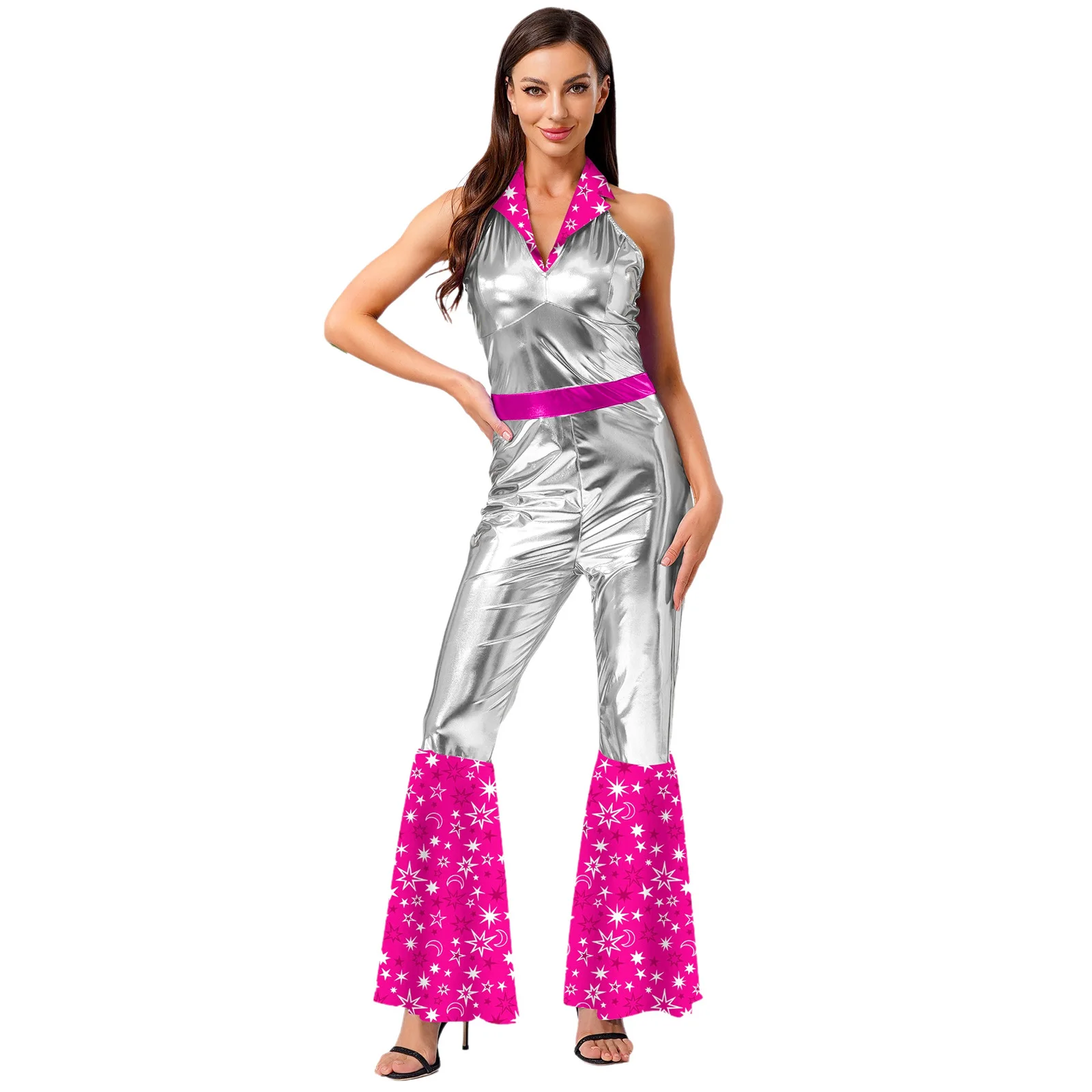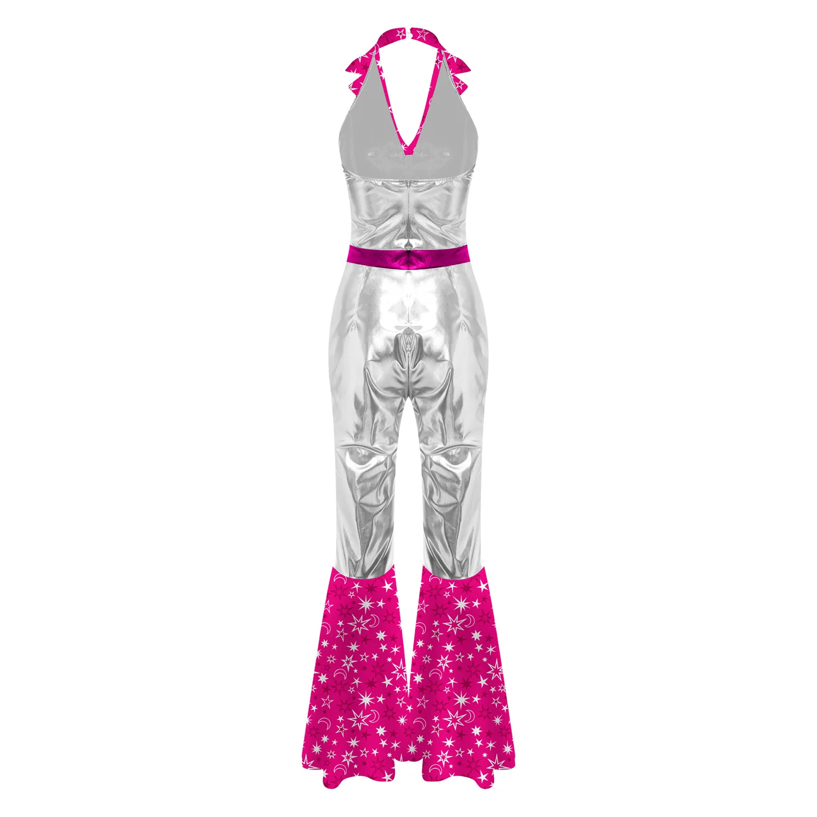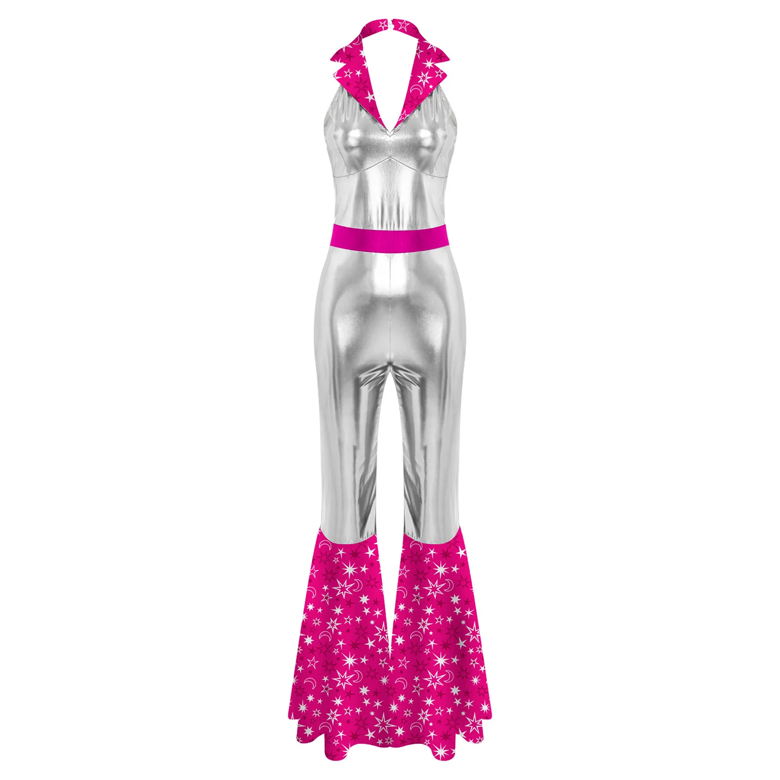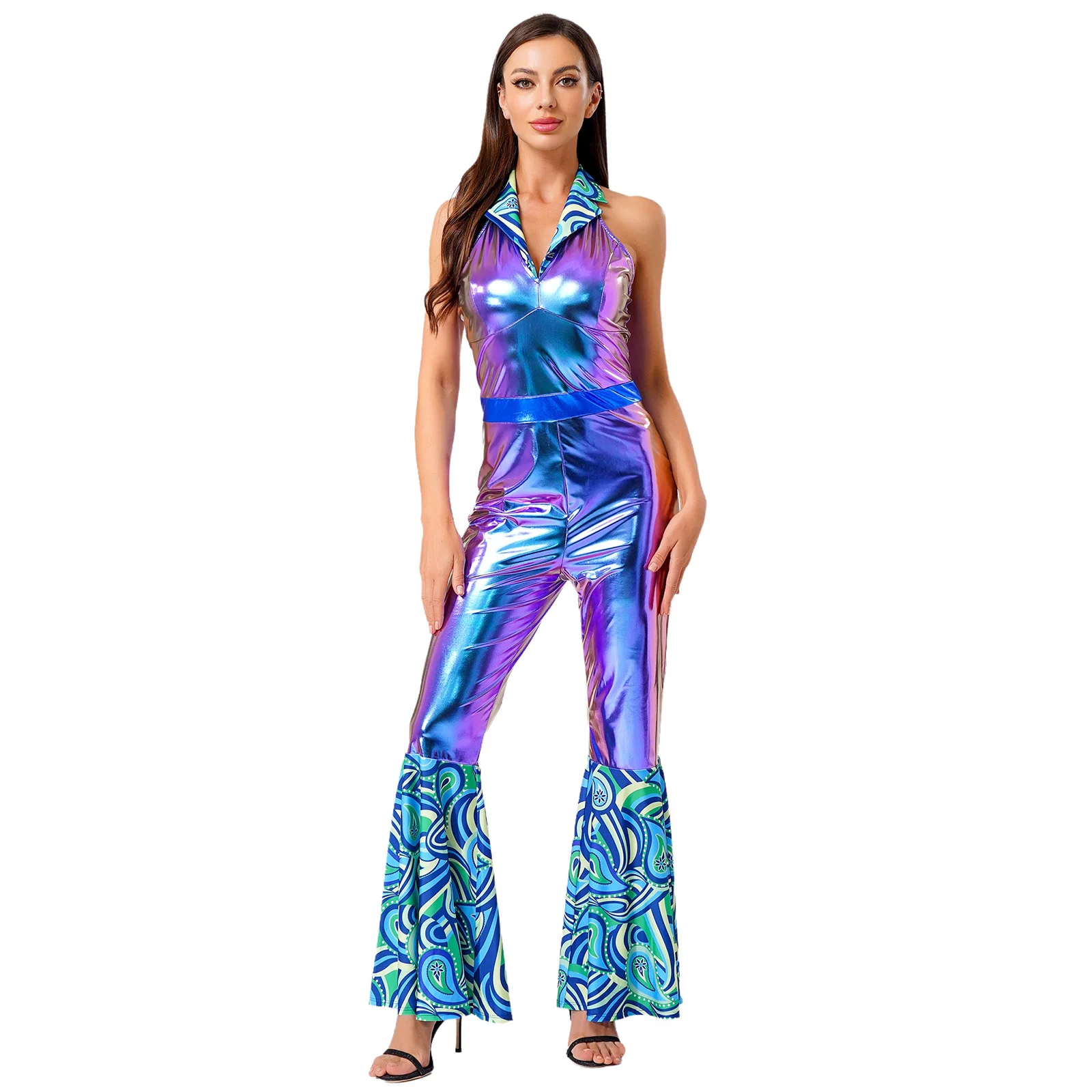 The flared design of the jumpsuit is both fashionable and flattering, suitable for themed parties, nightclubs, masquerades, and dancing events.