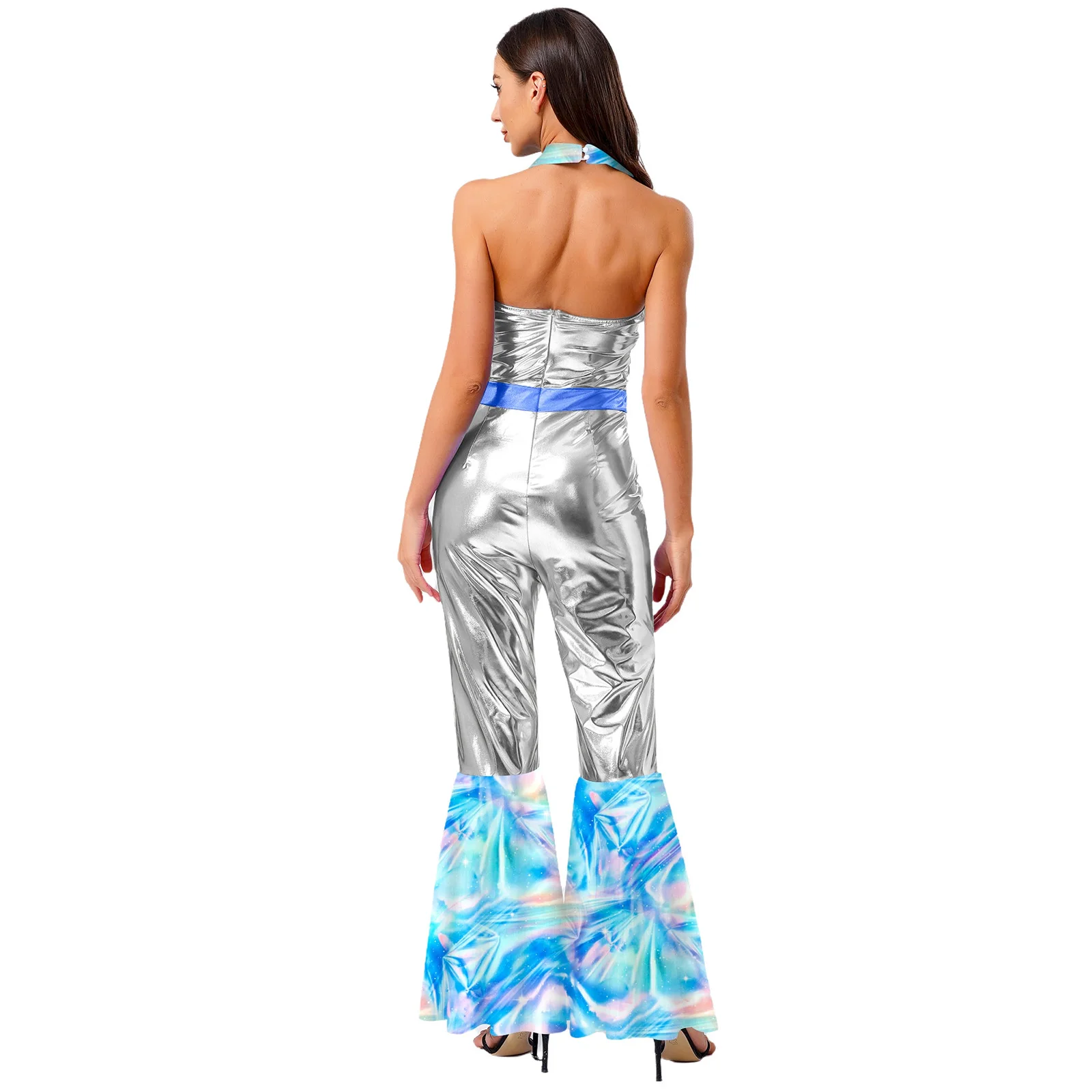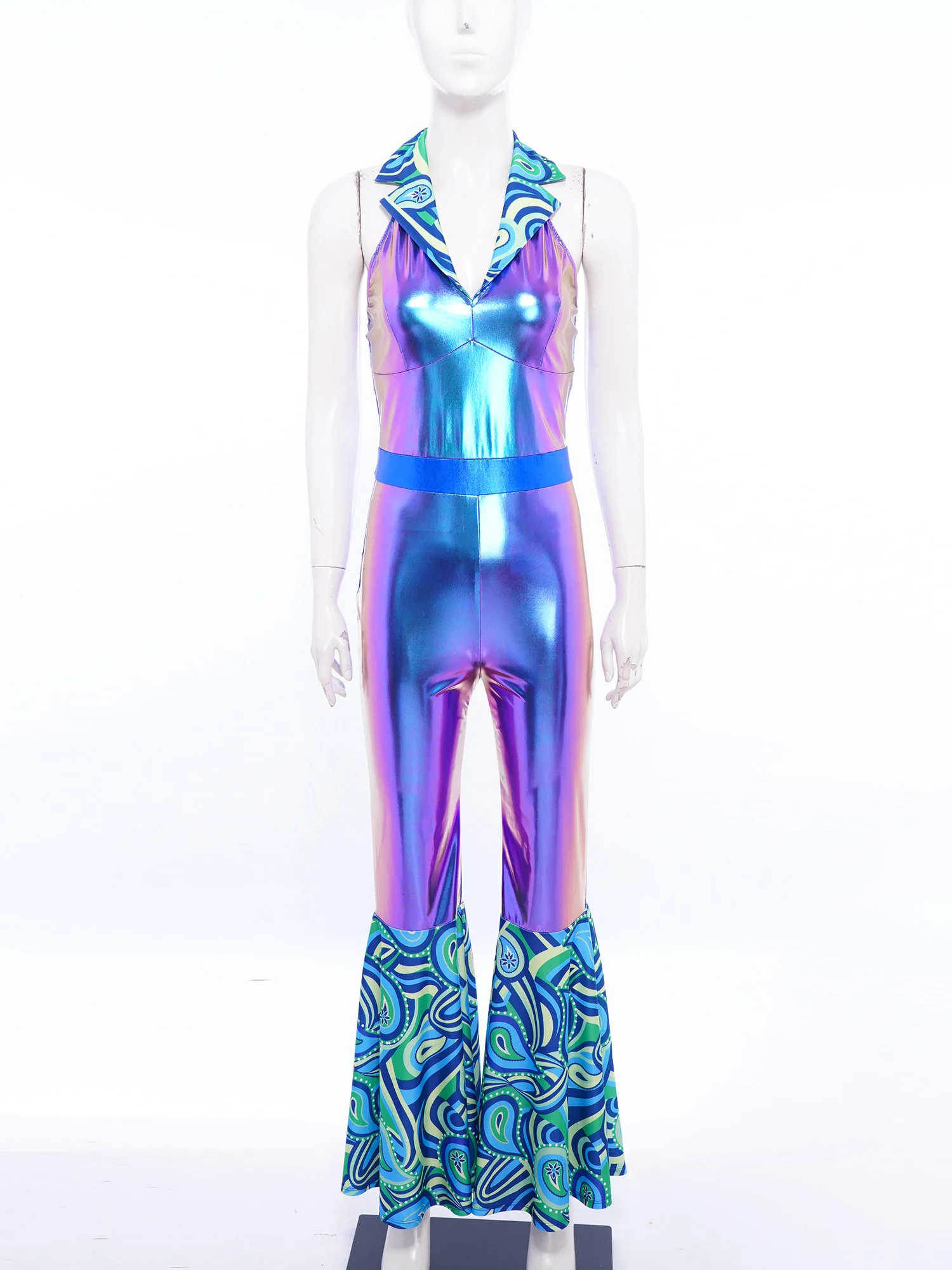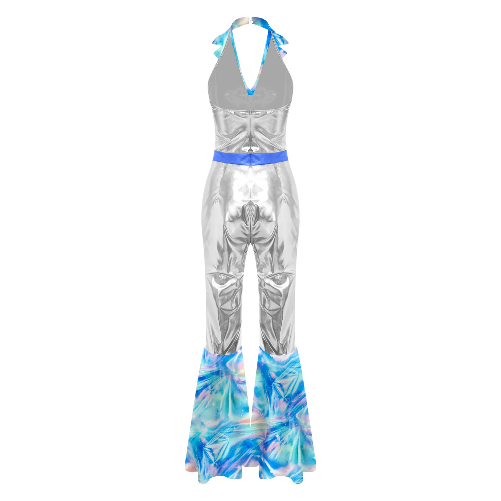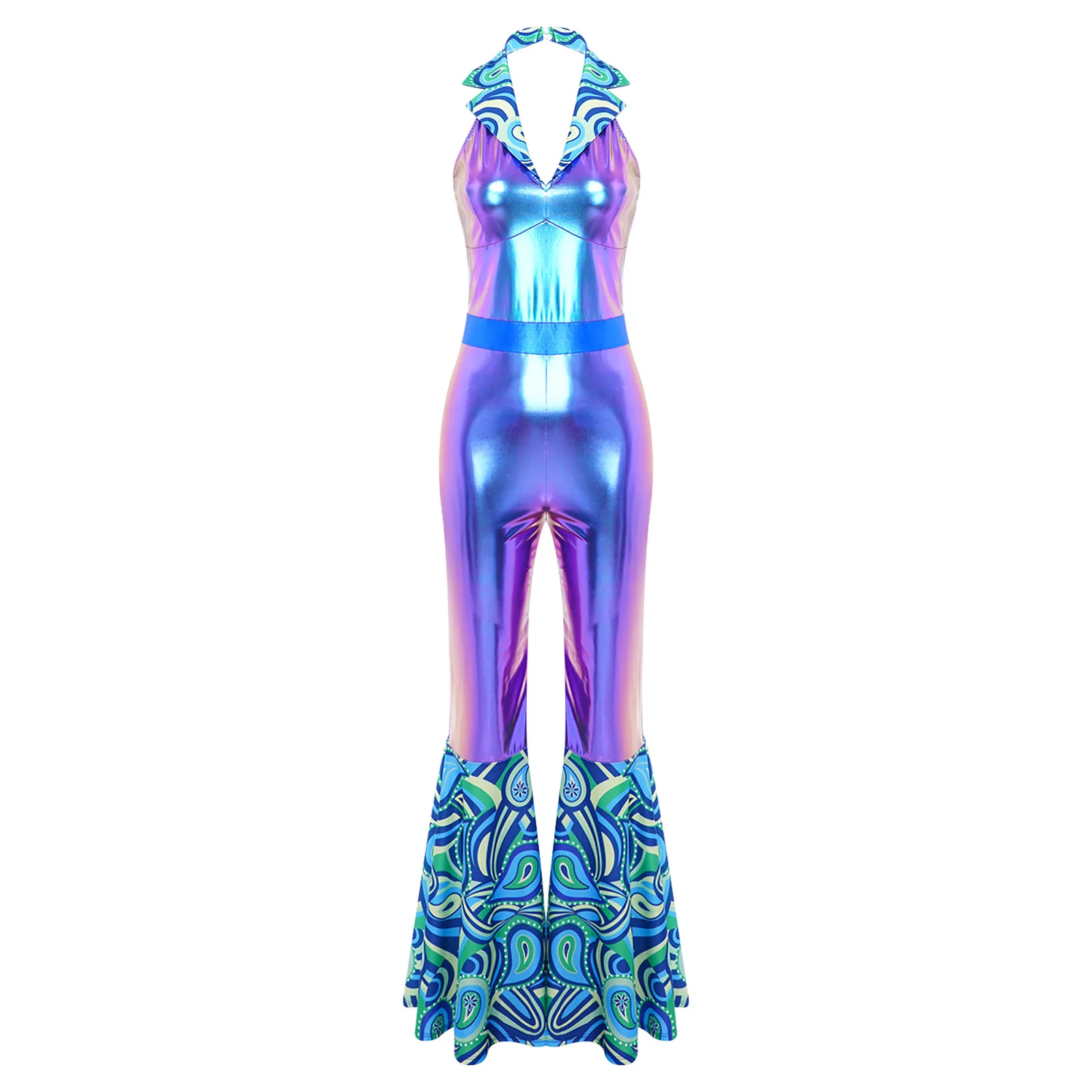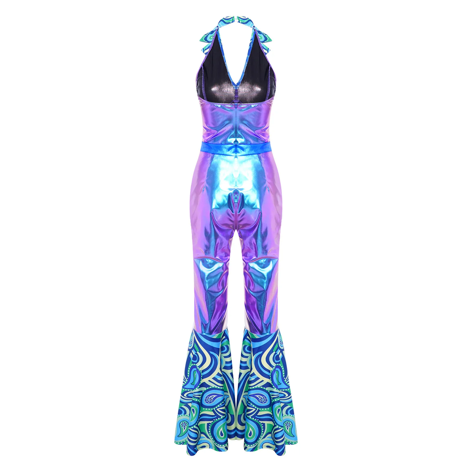 The flared design of the jumpsuit is both fashionable and flattering, suitable for themed parties, nightclubs, masquerades, and dancing events.