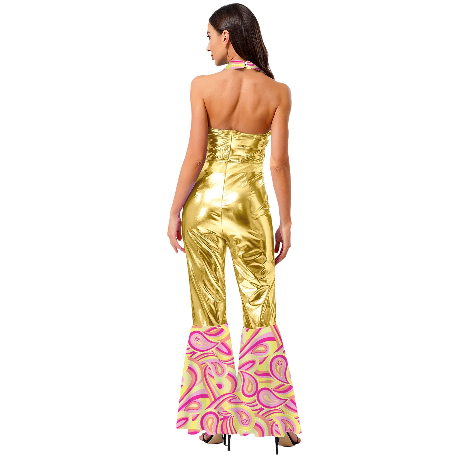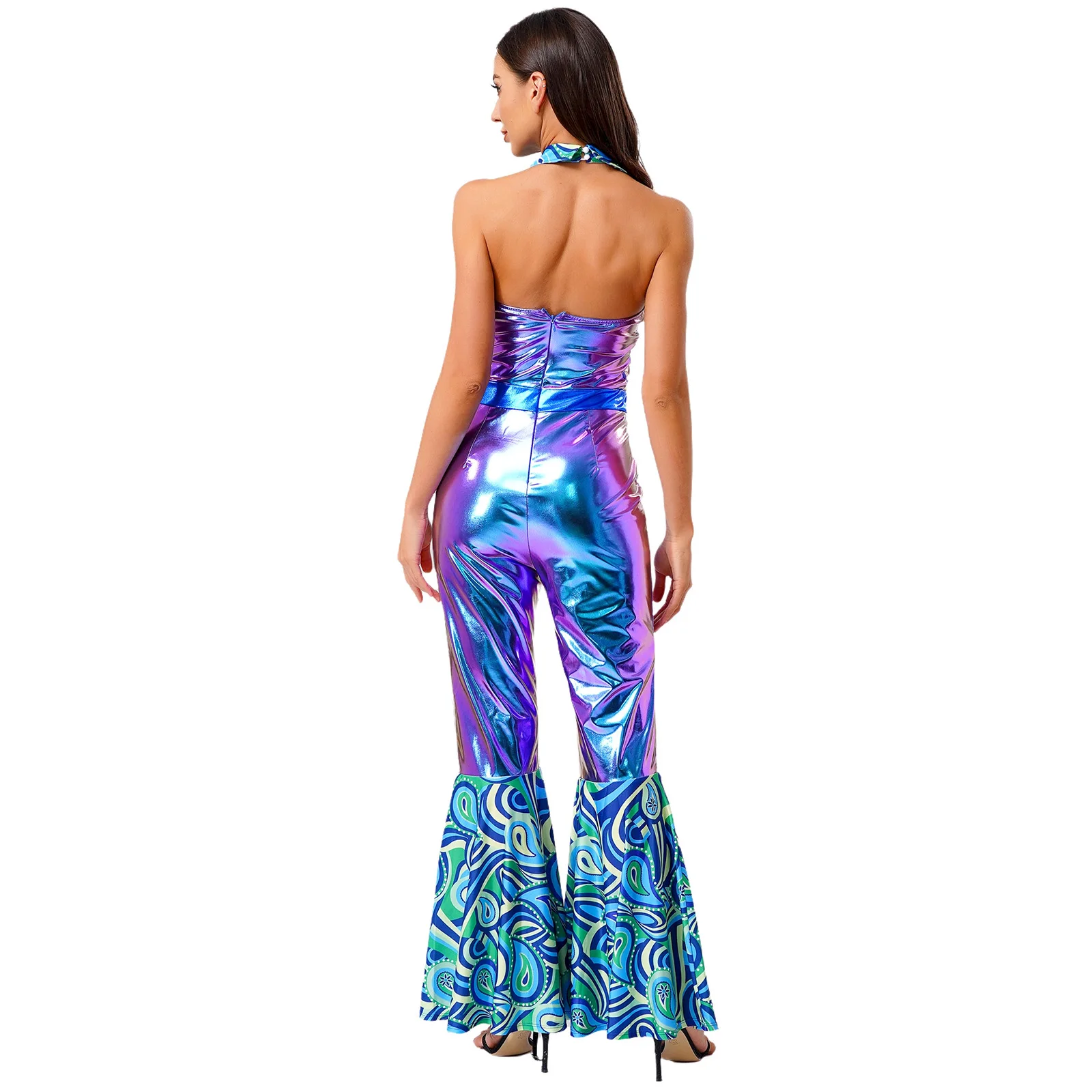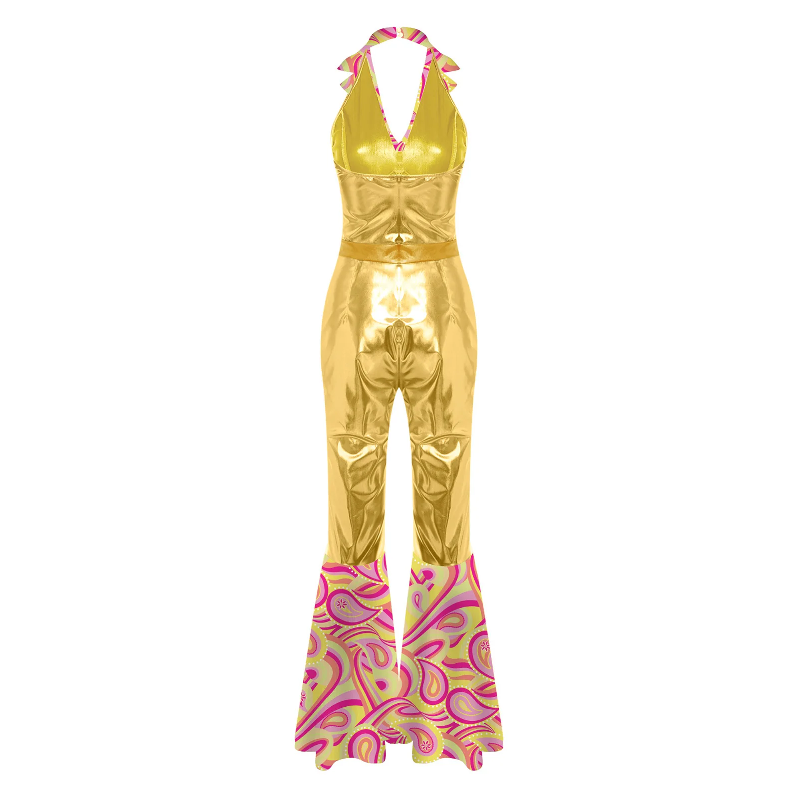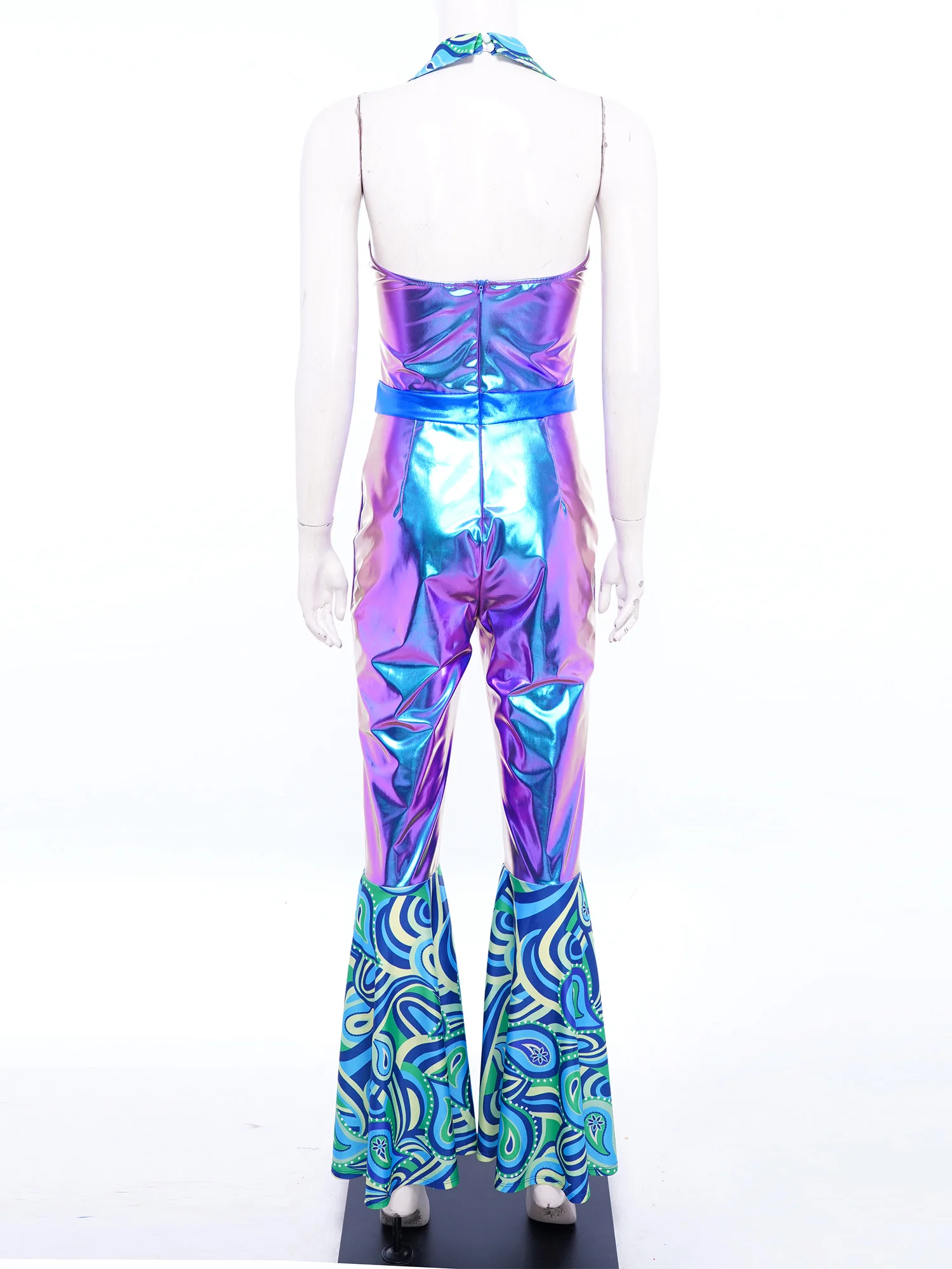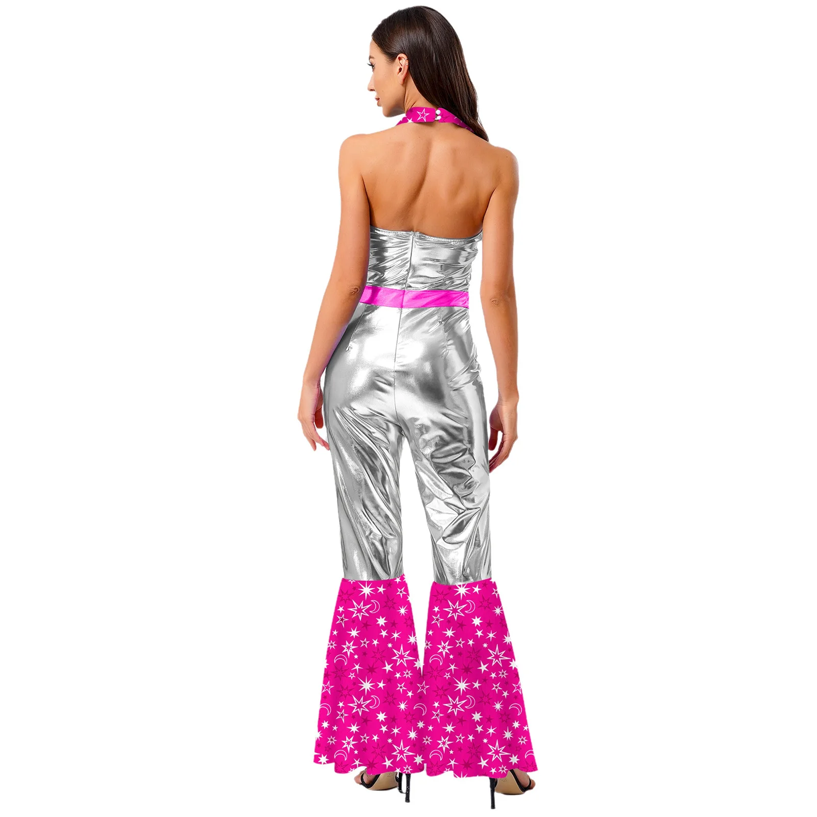 The flared design of the jumpsuit is both fashionable and flattering, suitable for themed parties, nightclubs, masquerades, and dancing events.