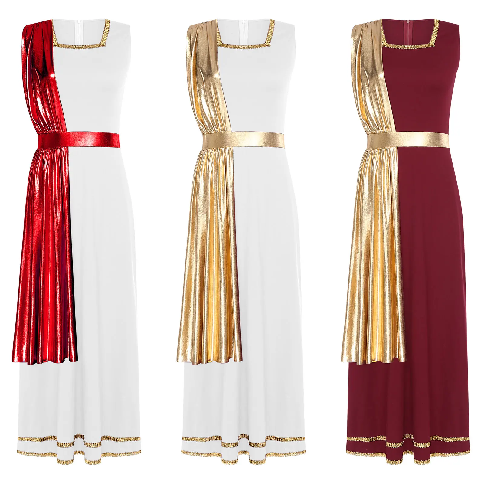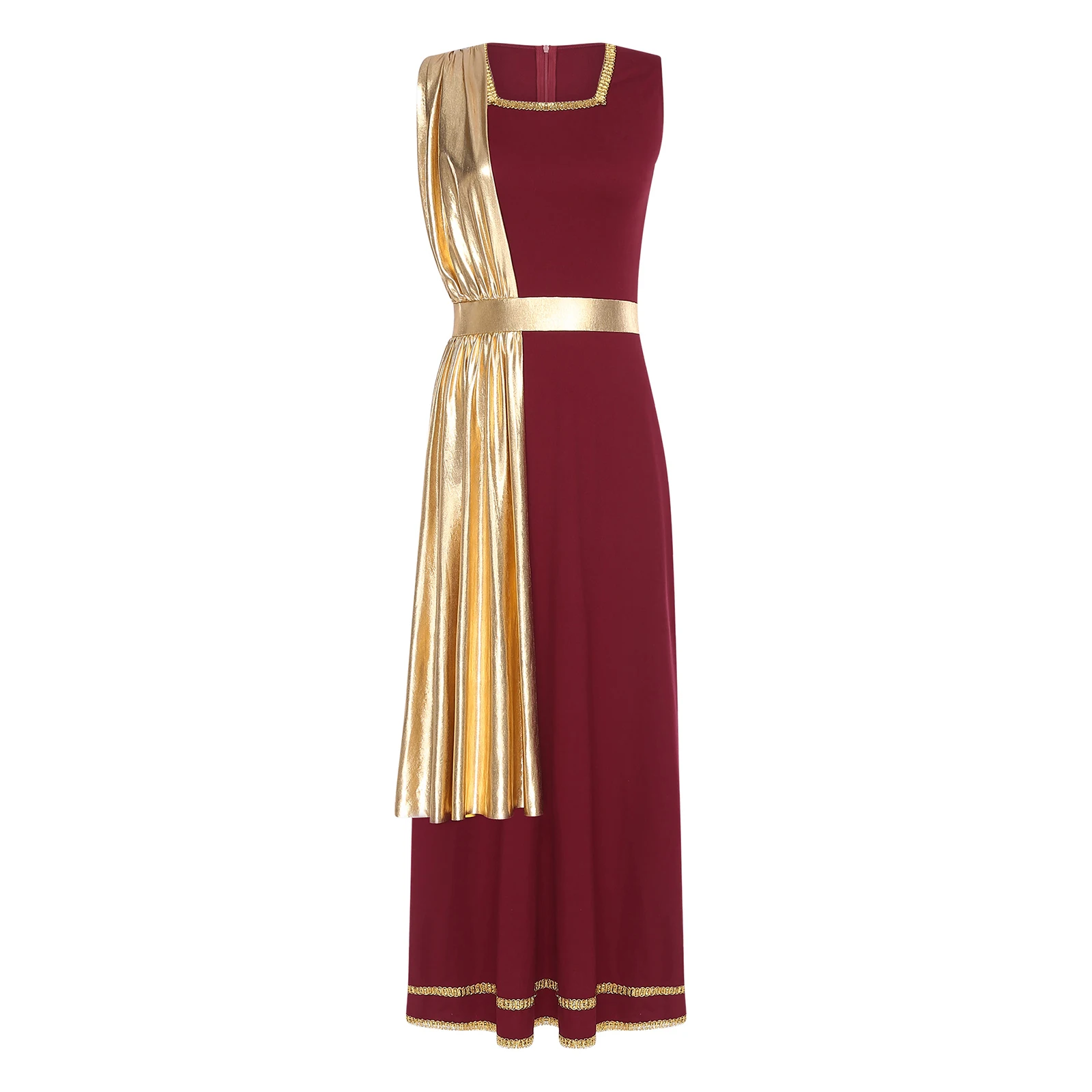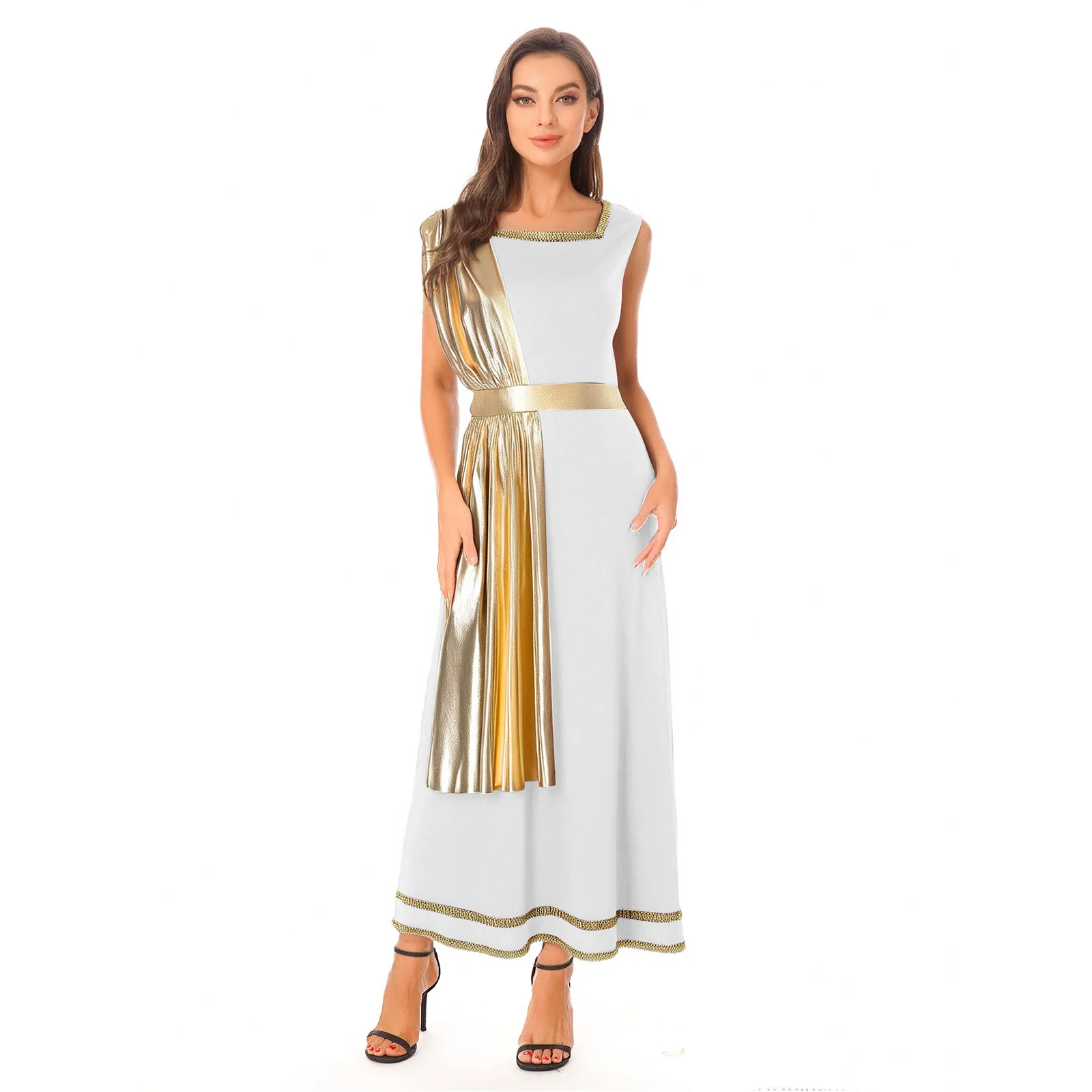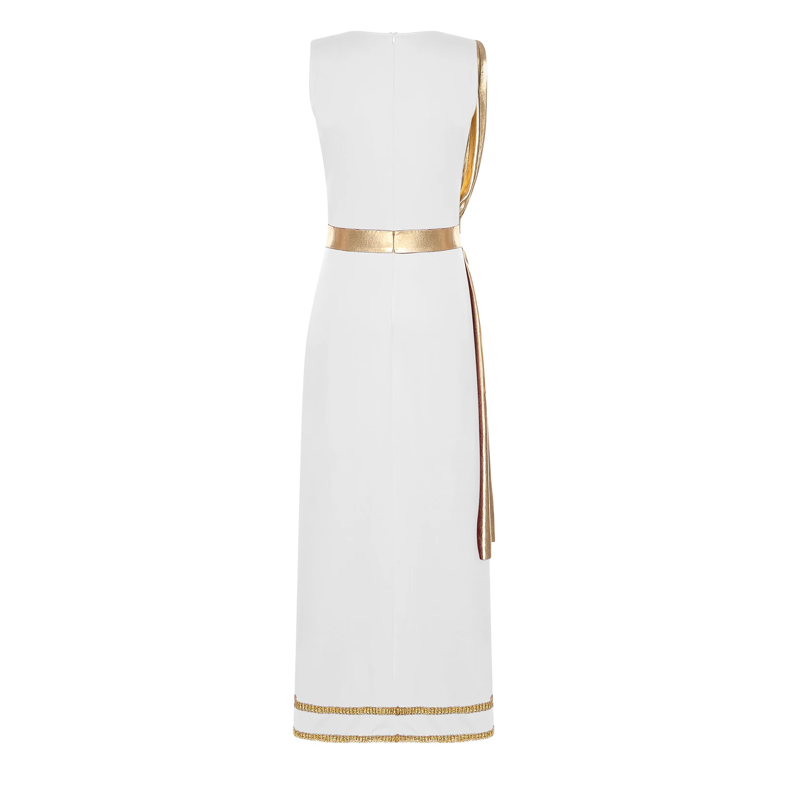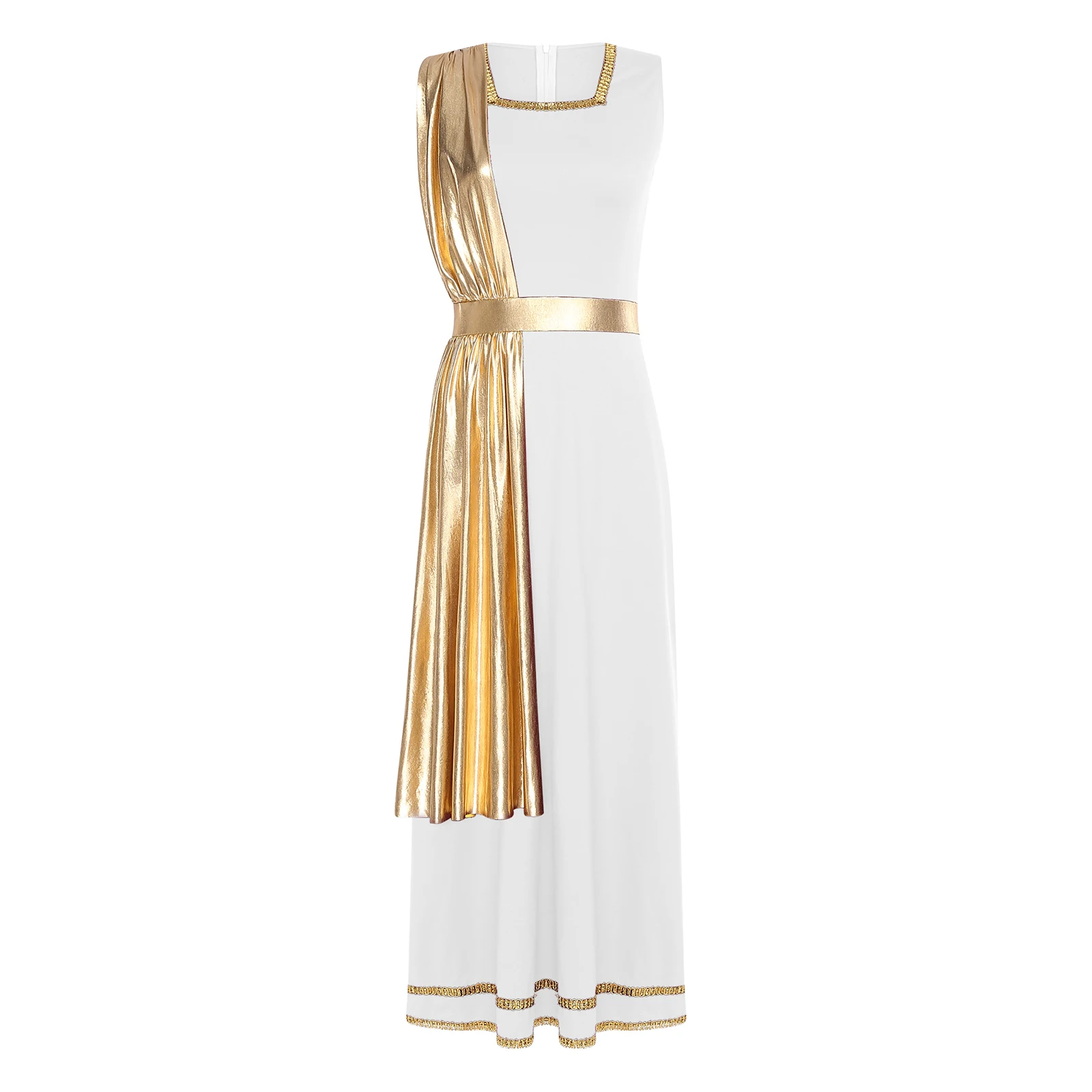 Women Ancient Greek Roman Tunic Robe Toga Square Neck Sleeveless Gold Trim Drape Patchwork Long Dress for Halloween Cosplay