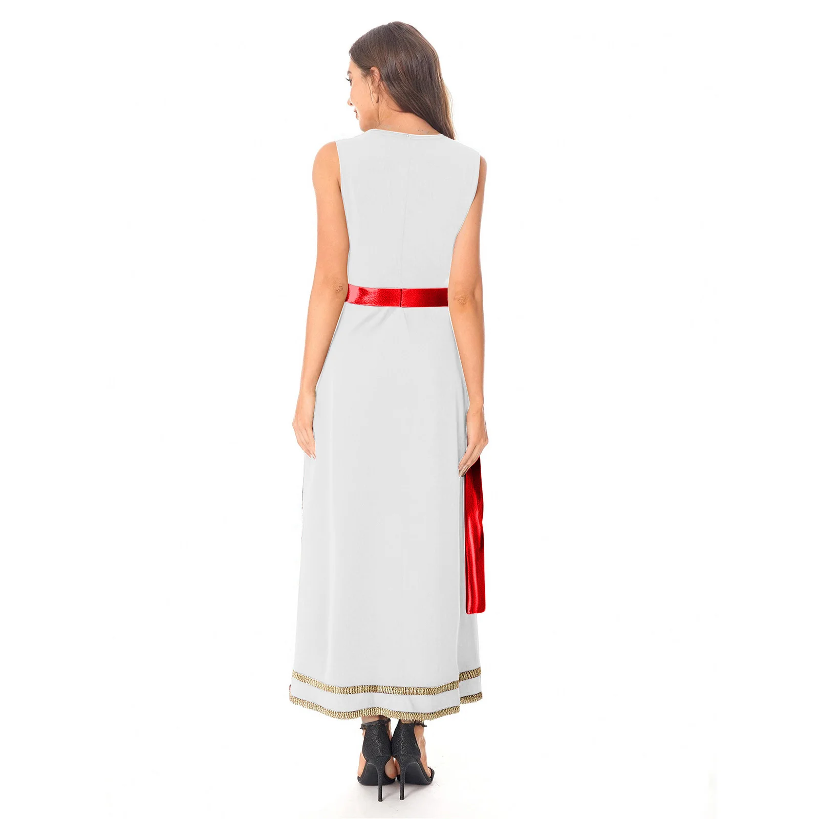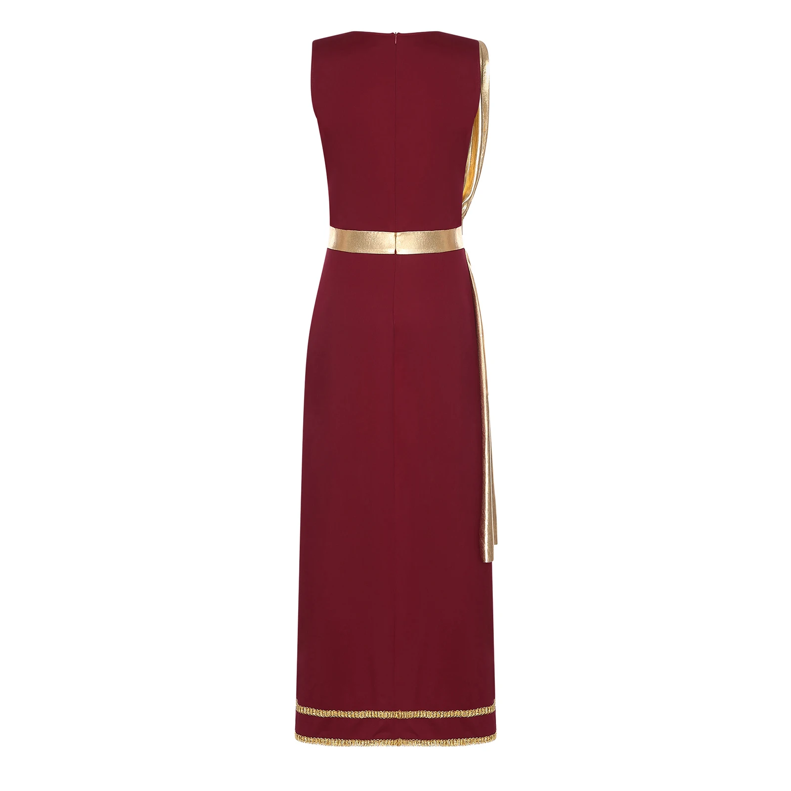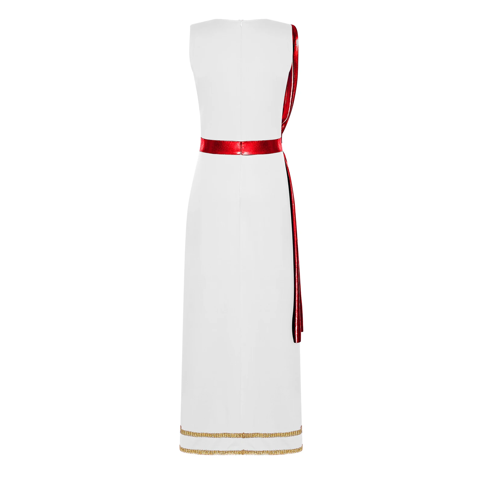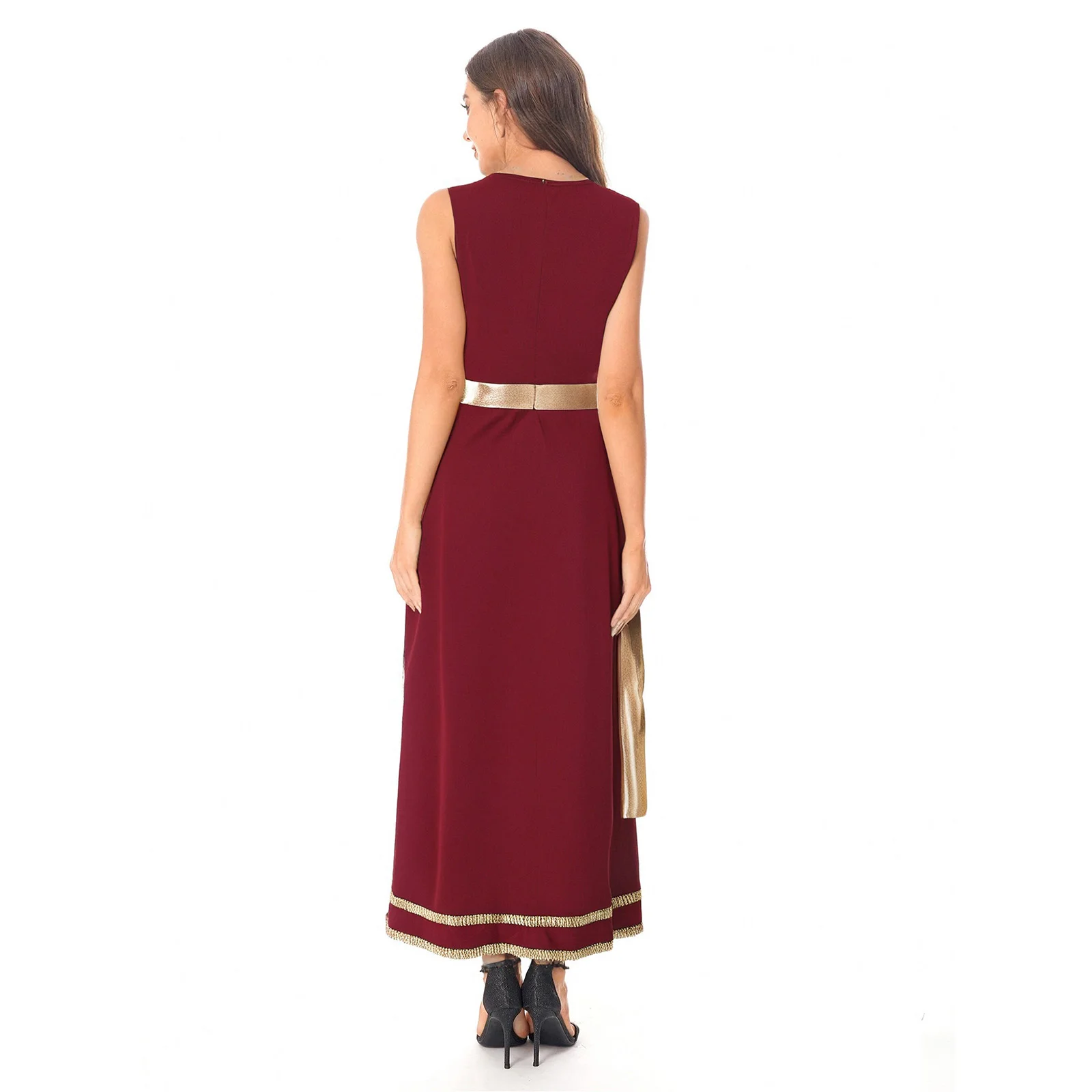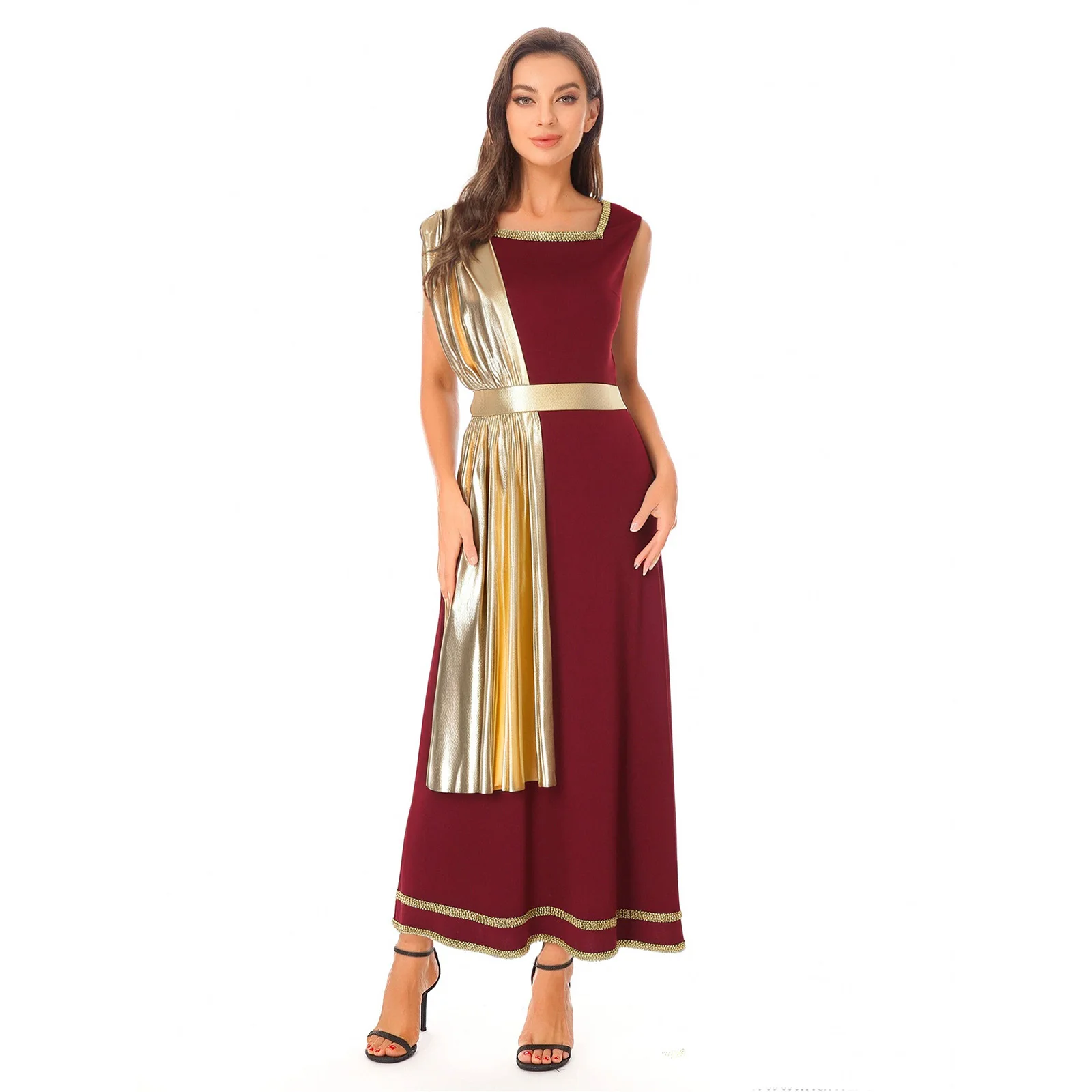 Women Ancient Greek Roman Tunic Robe Toga Square Neck Sleeveless Gold Trim Drape Patchwork Long Dress for Halloween Cosplay