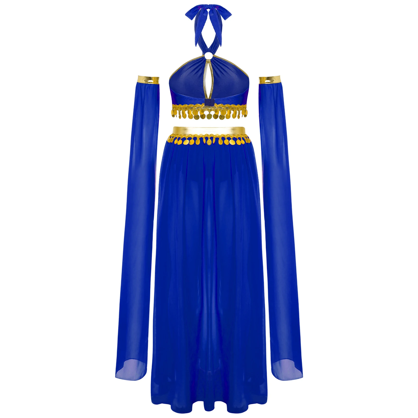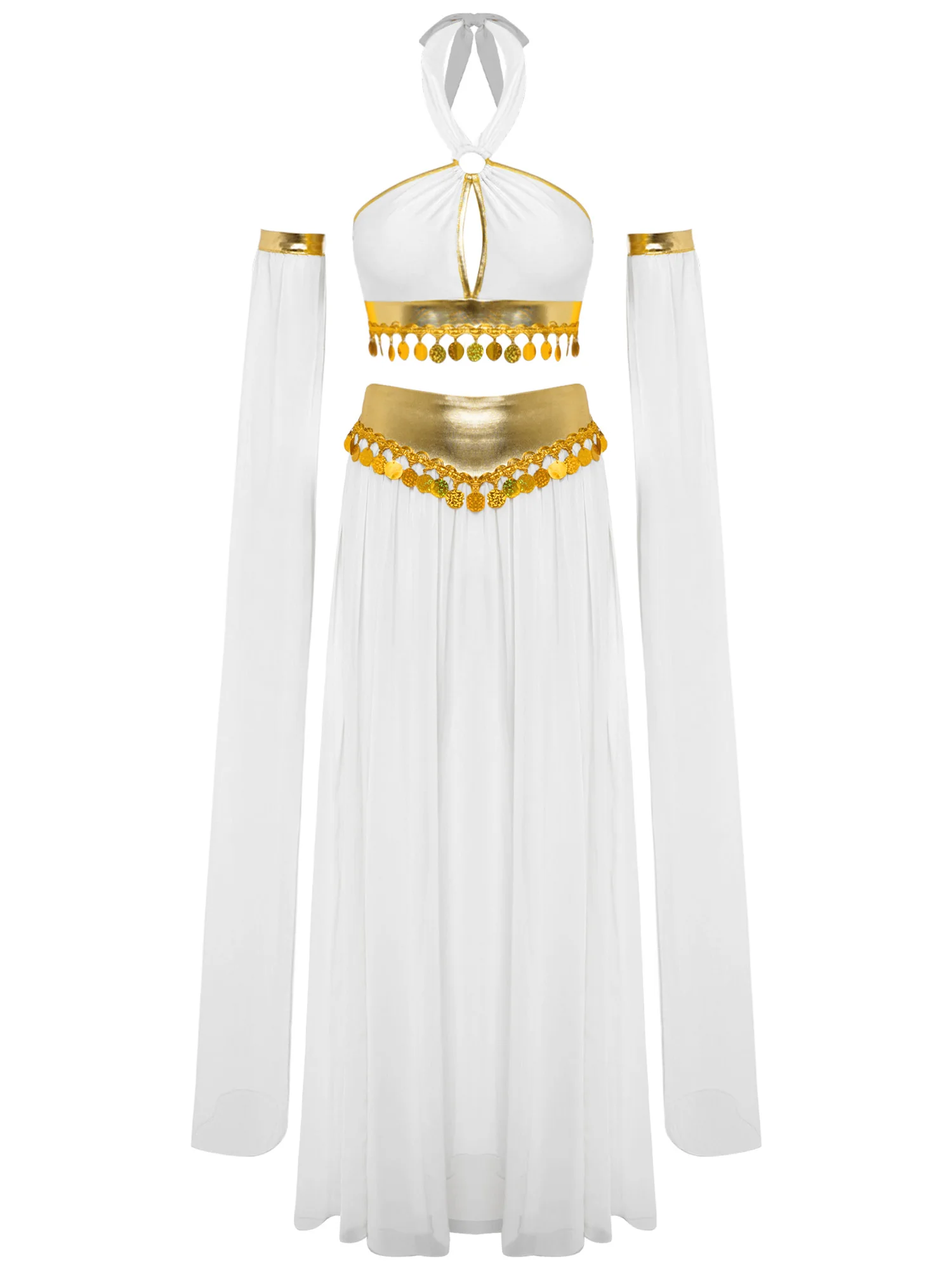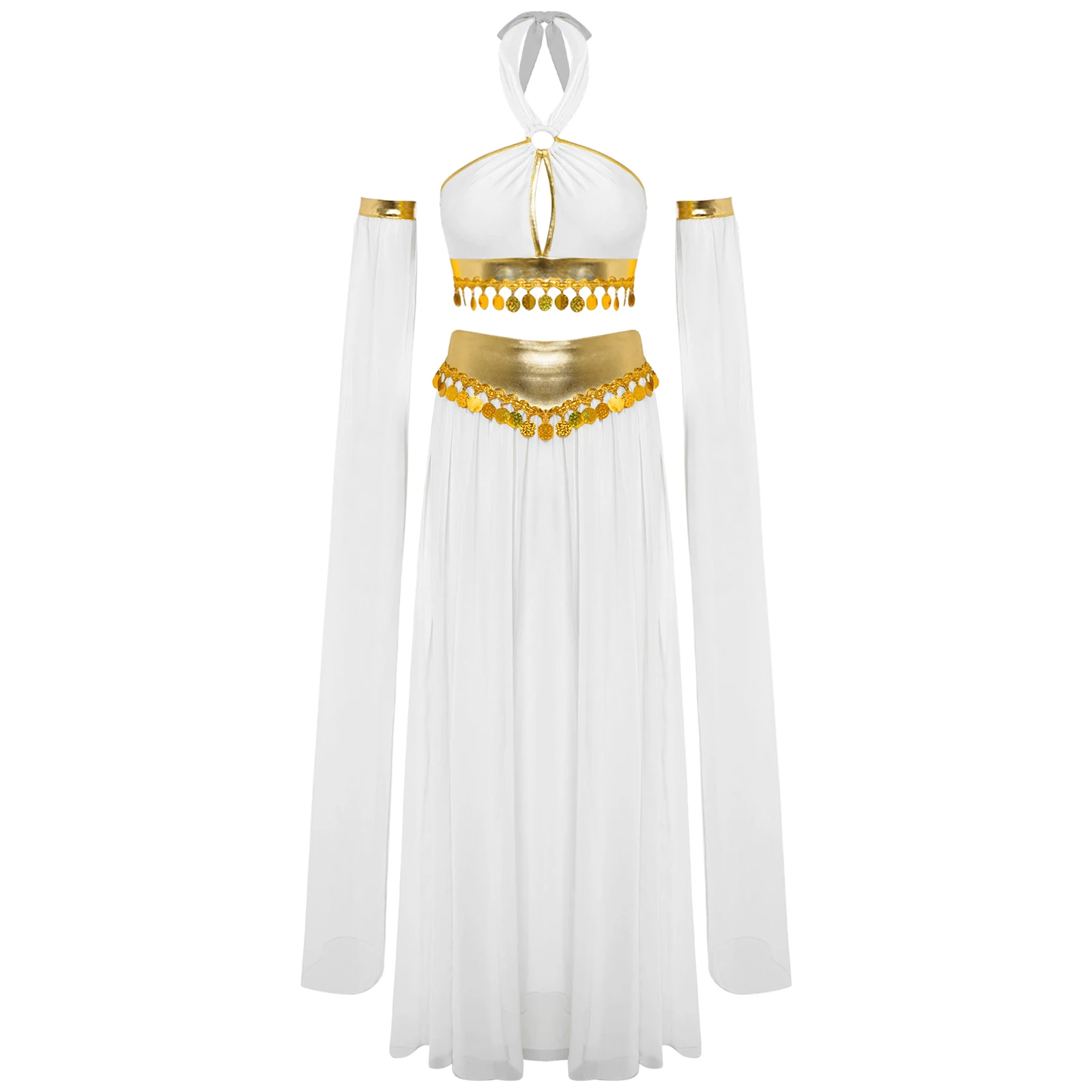 Women Cleopatra Cosplay Costume Ancient Rome Egyptian Dresses Crop Top and Split Skirt Sleeves Set for Halloween Role Play Party
