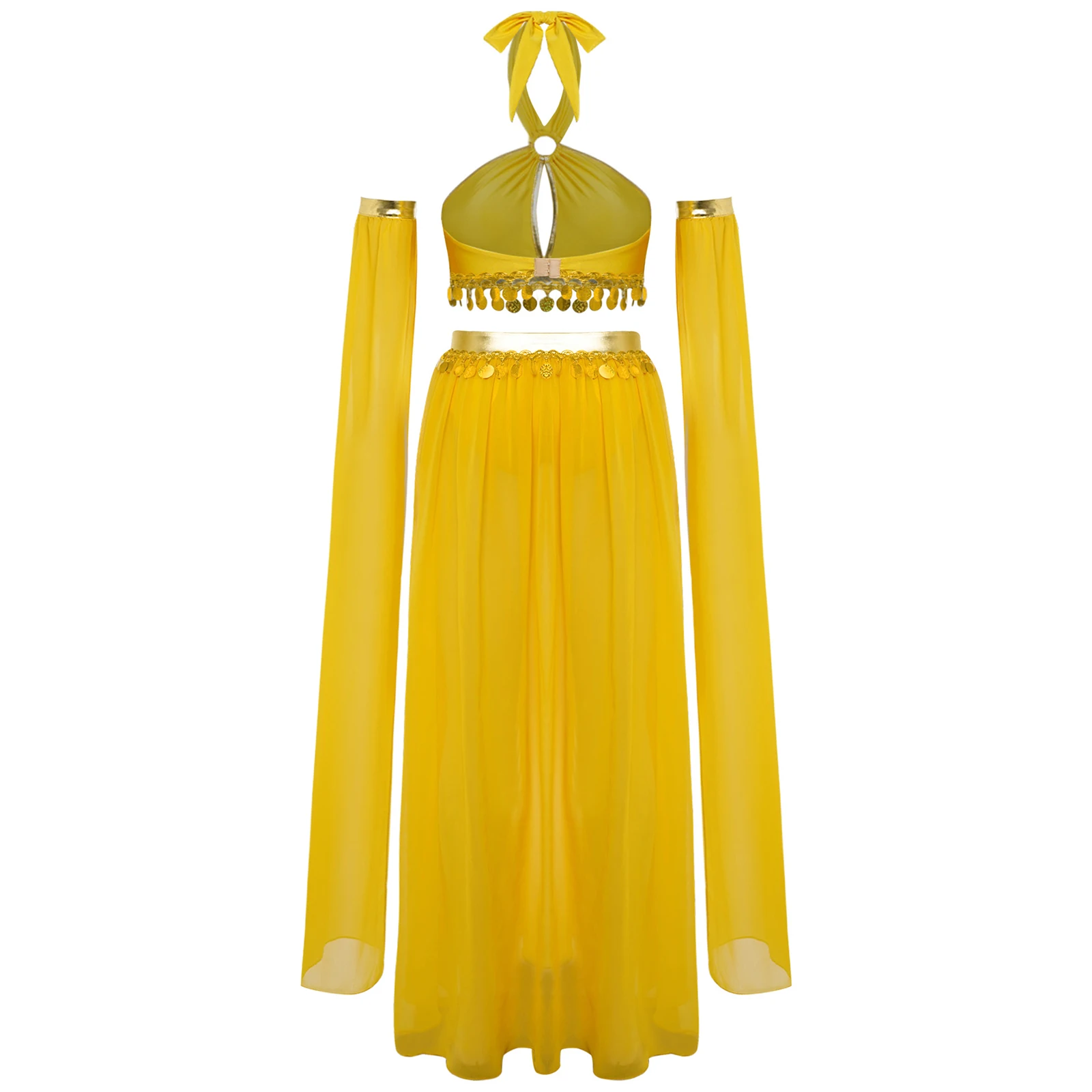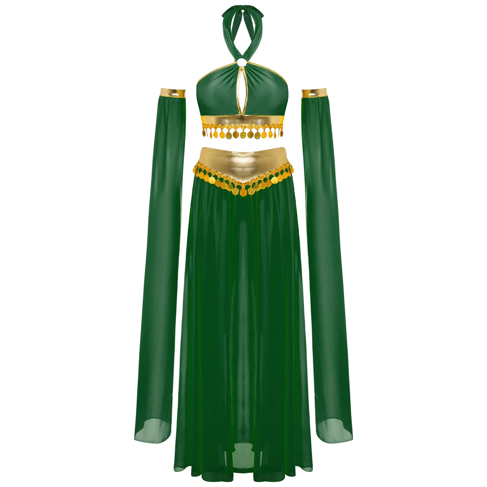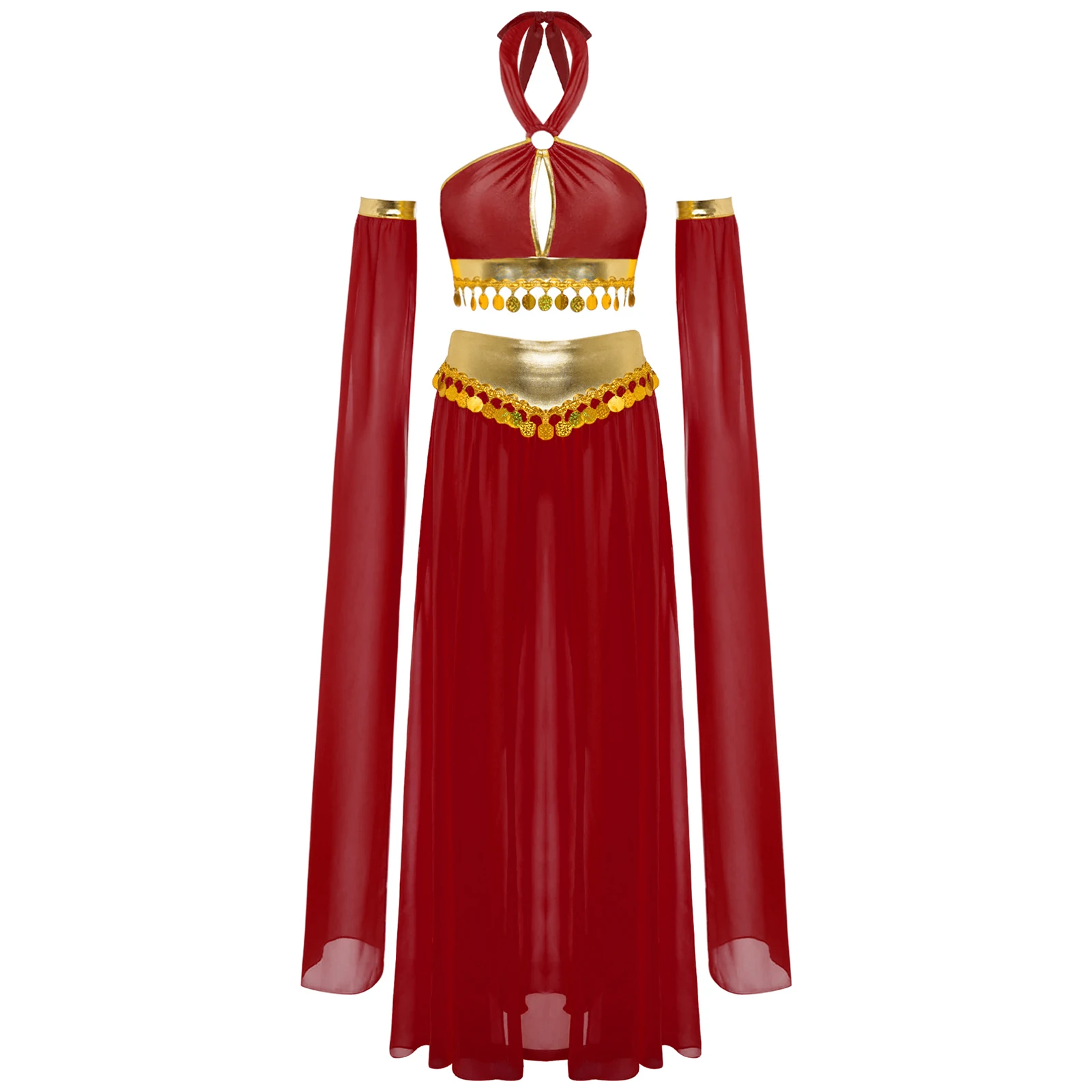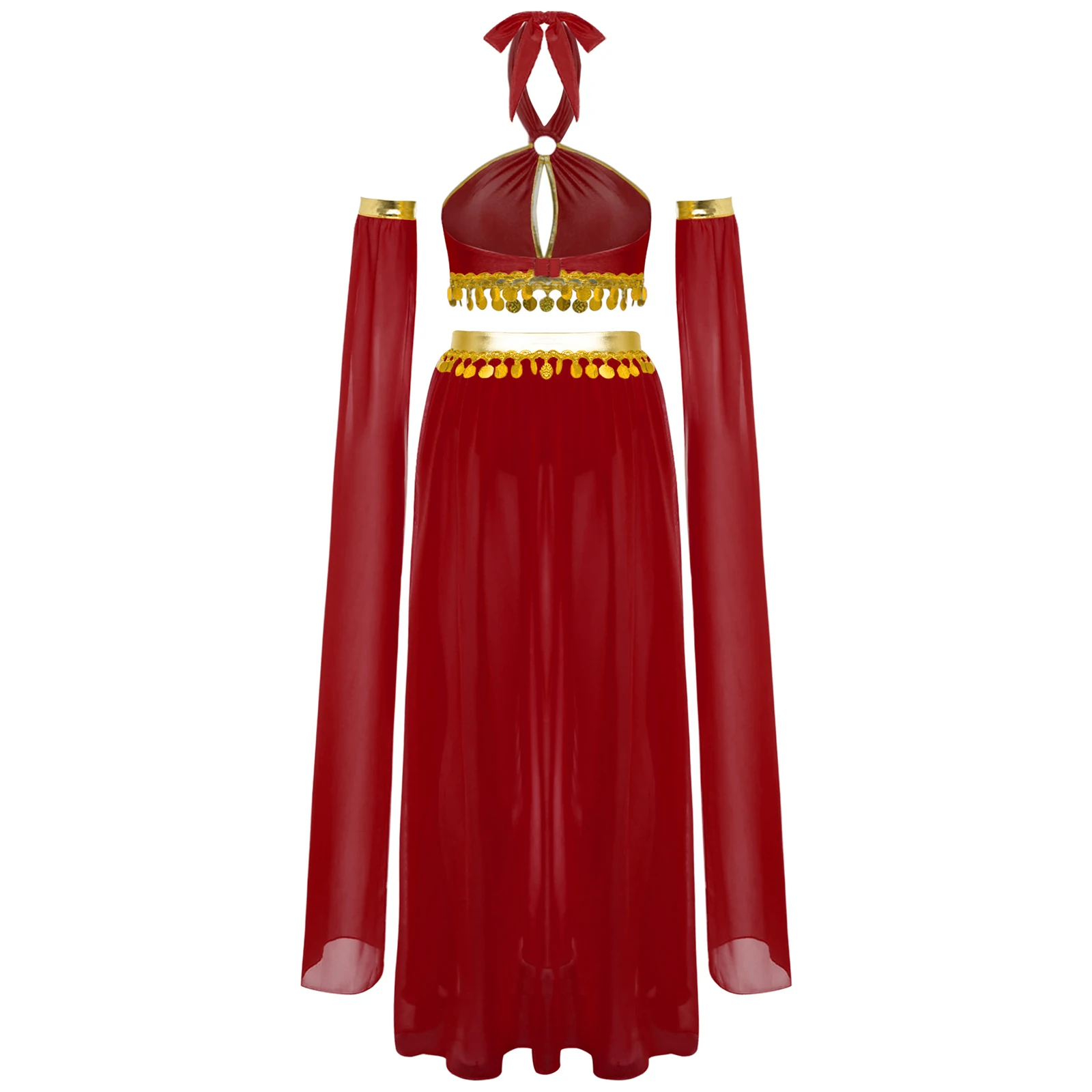 Women Cleopatra Cosplay Costume Ancient Rome Egyptian Dresses Crop Top and Split Skirt Sleeves Set for Halloween Role Play Party