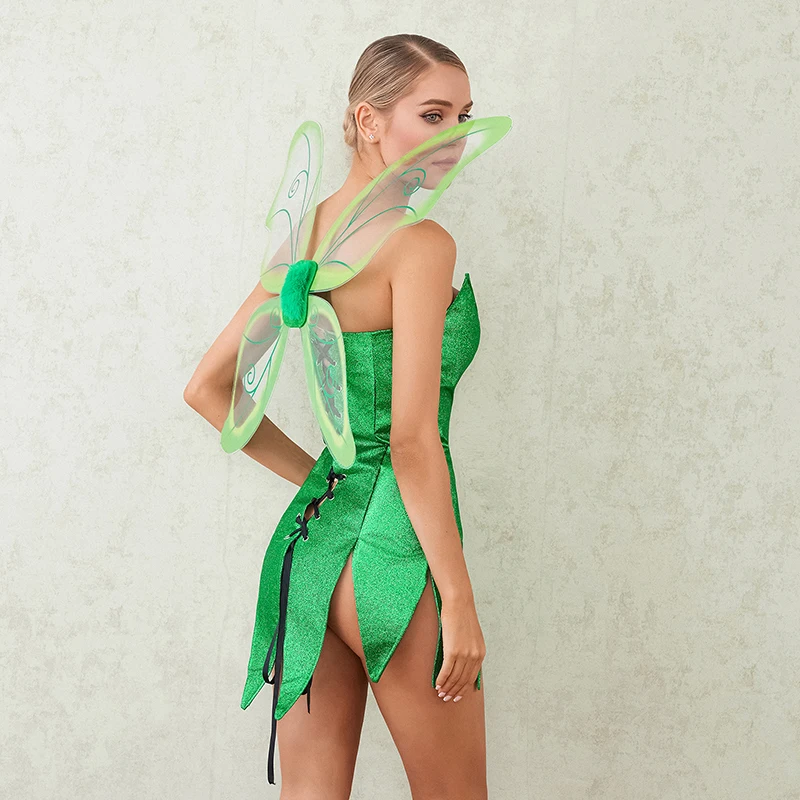 Women 2 Piece Cosplay Costume, Green Fairy Dress with Butterfly Wings Fairy Costume for Themed Party