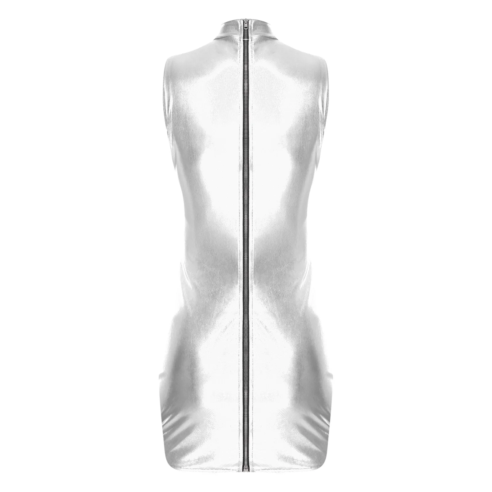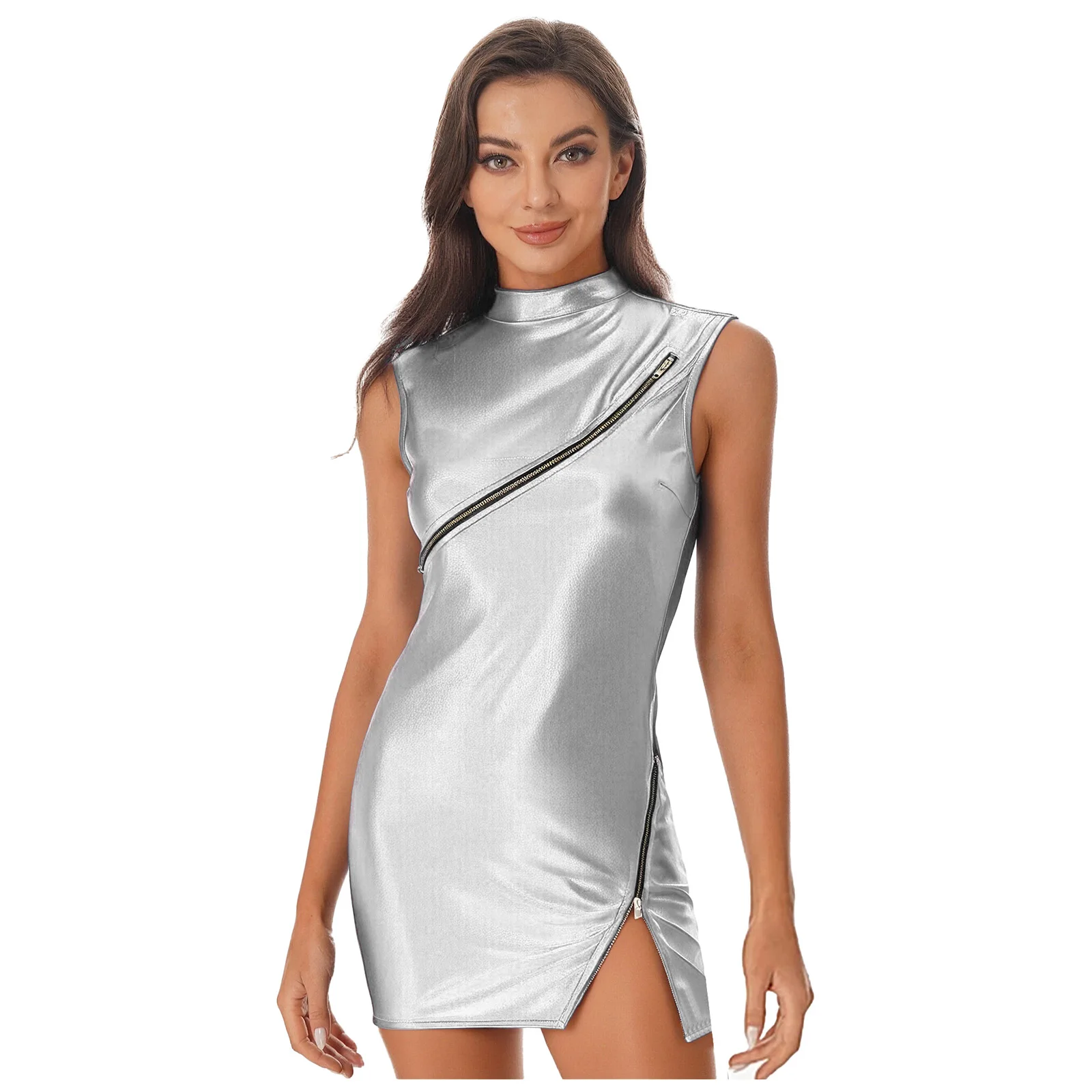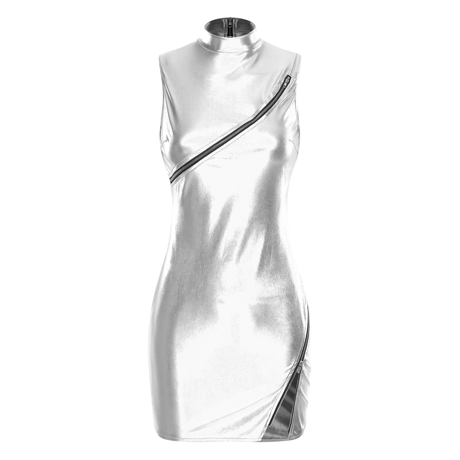 Women Fashion Raves Bodycon Dress Double-end Zippers Sexy Party Club Costumes Metallic Sleeveless Mini Dress Festival Clothes