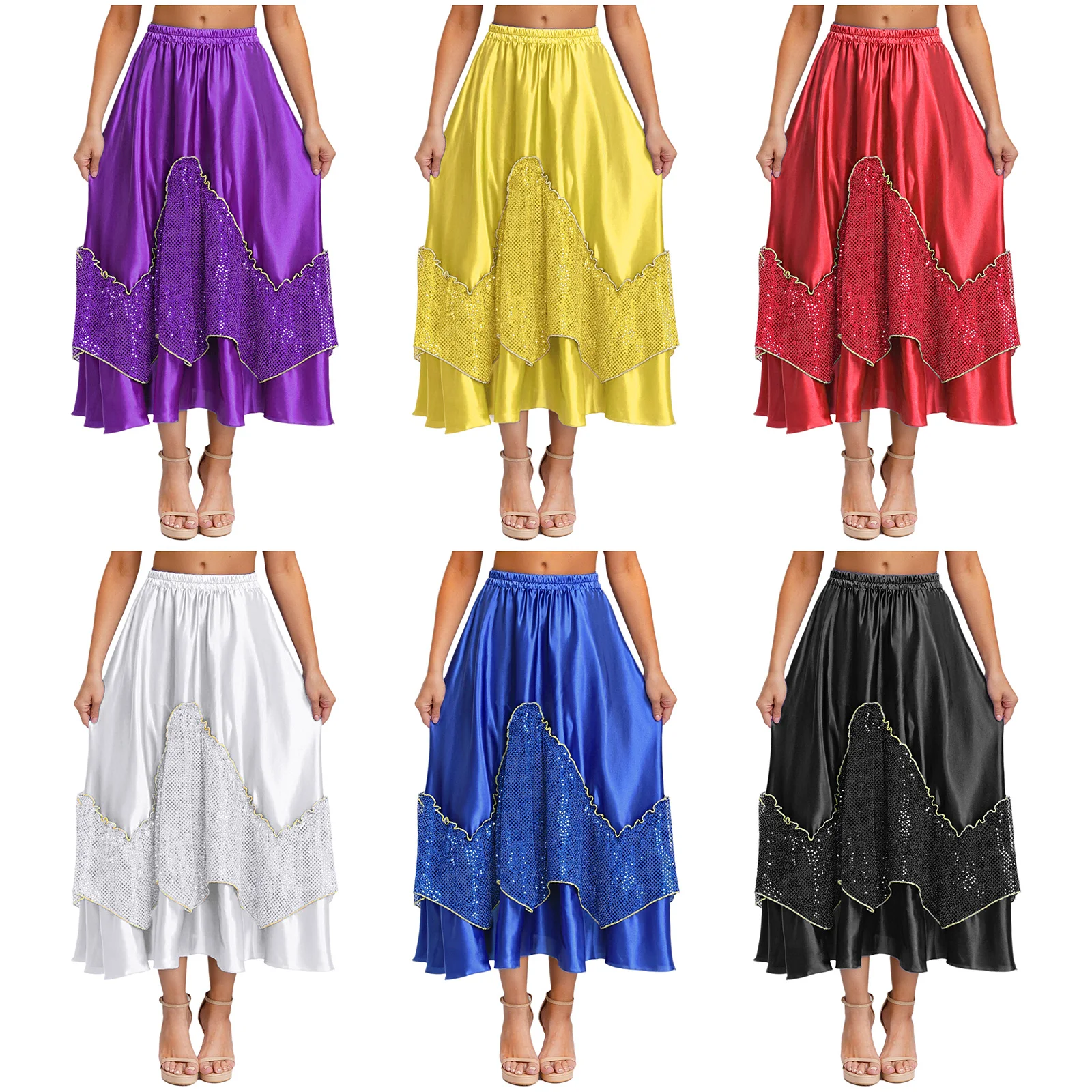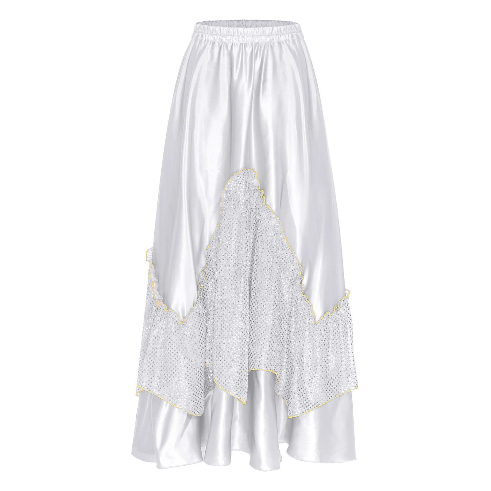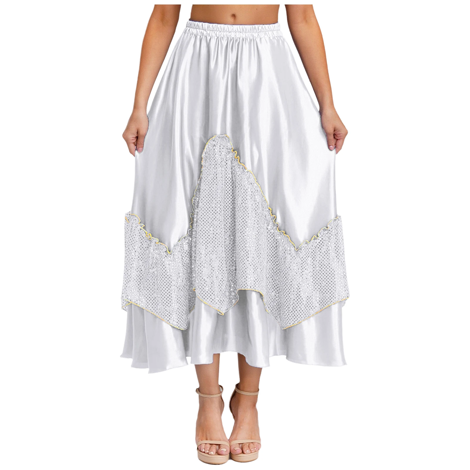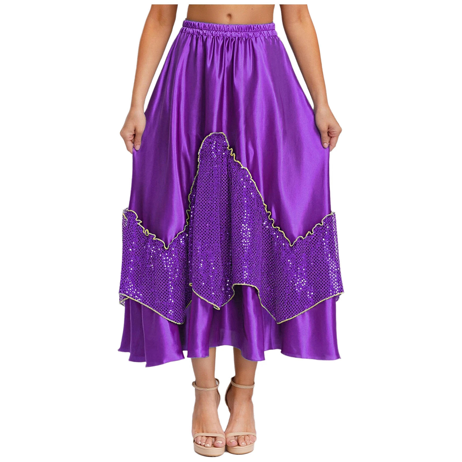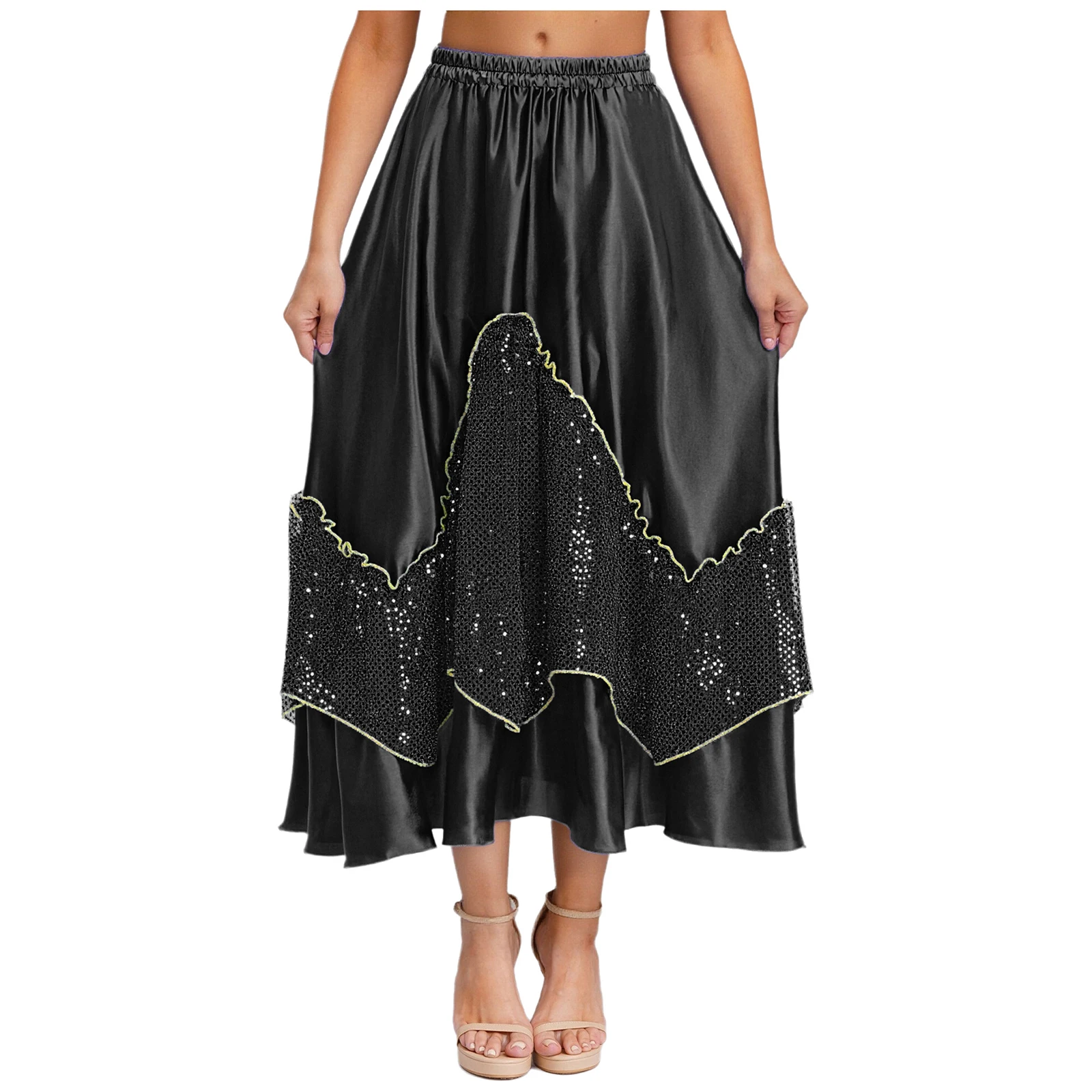 Women Flamenco Spanish Dance Skirts Ballroom Dancewear Shiny Sequin Patchwork Big Swing Skirt for Tango Lyrical Dance Costume