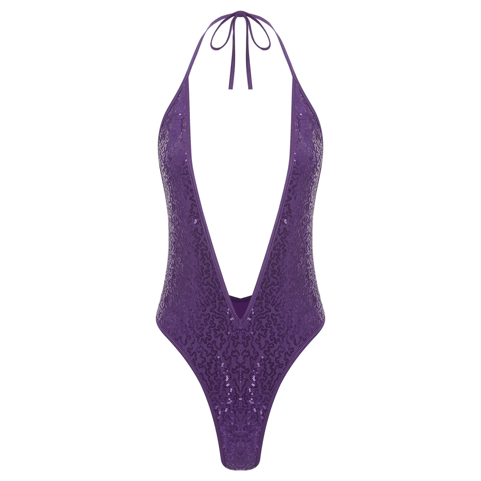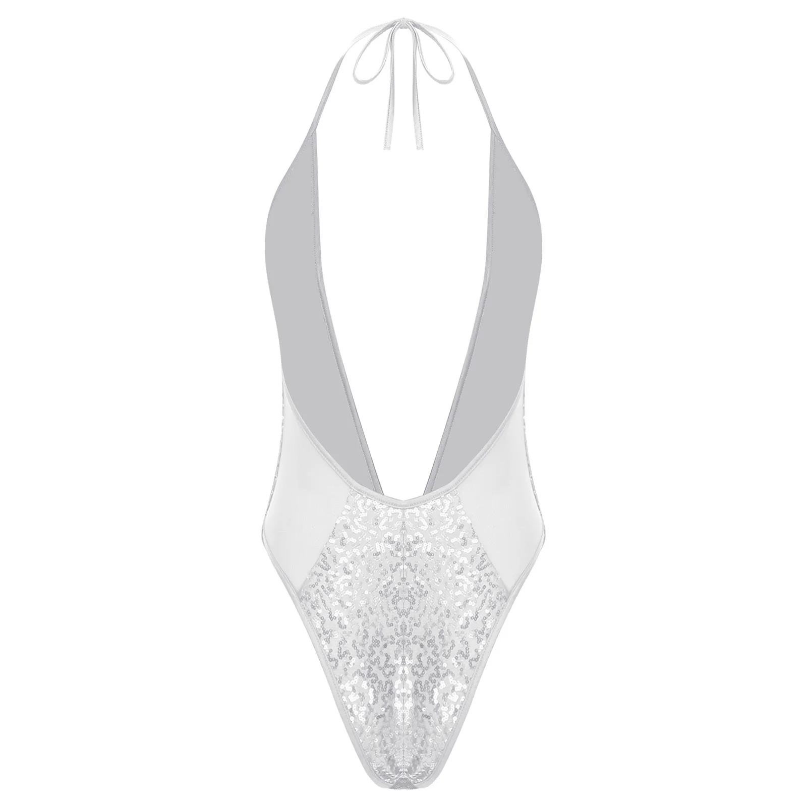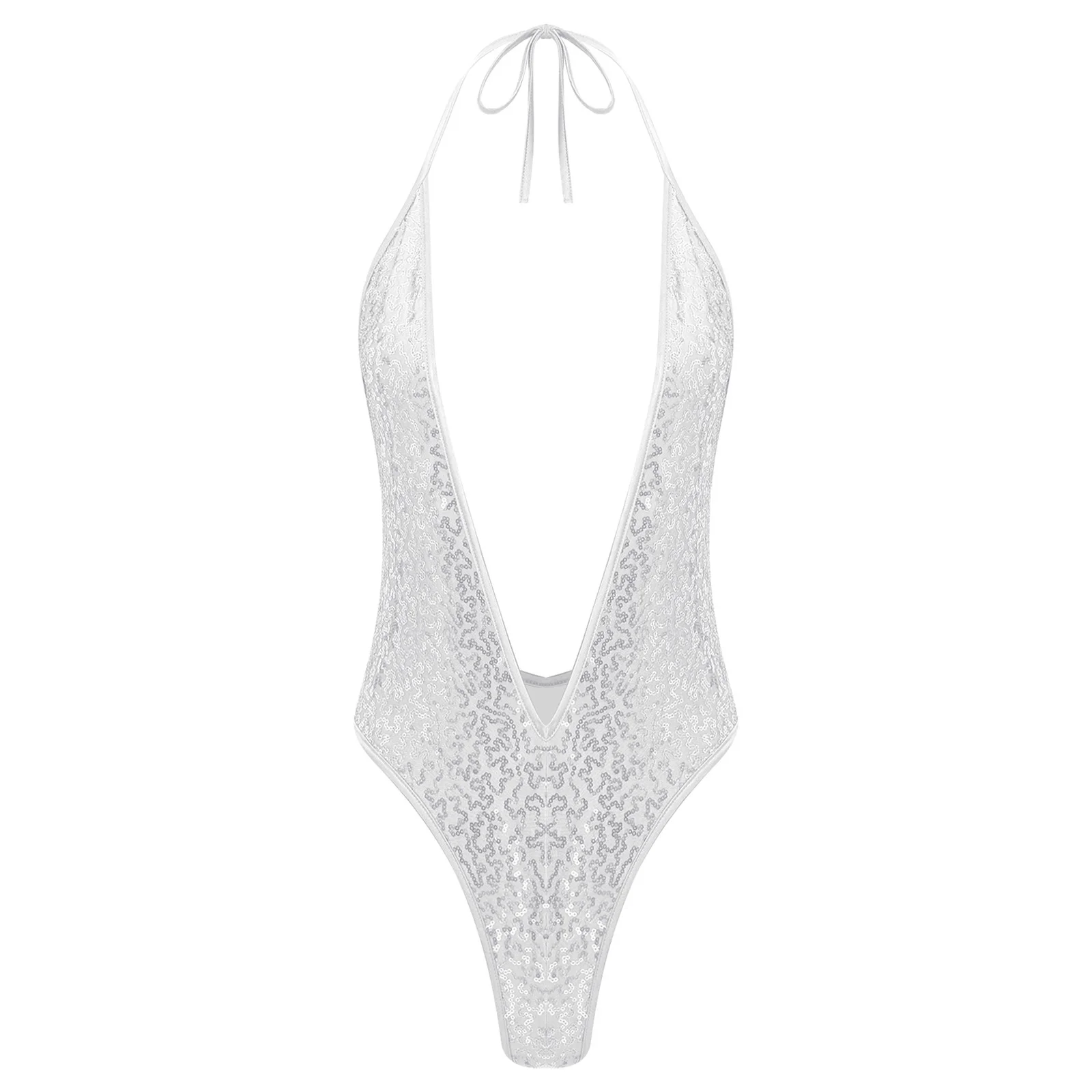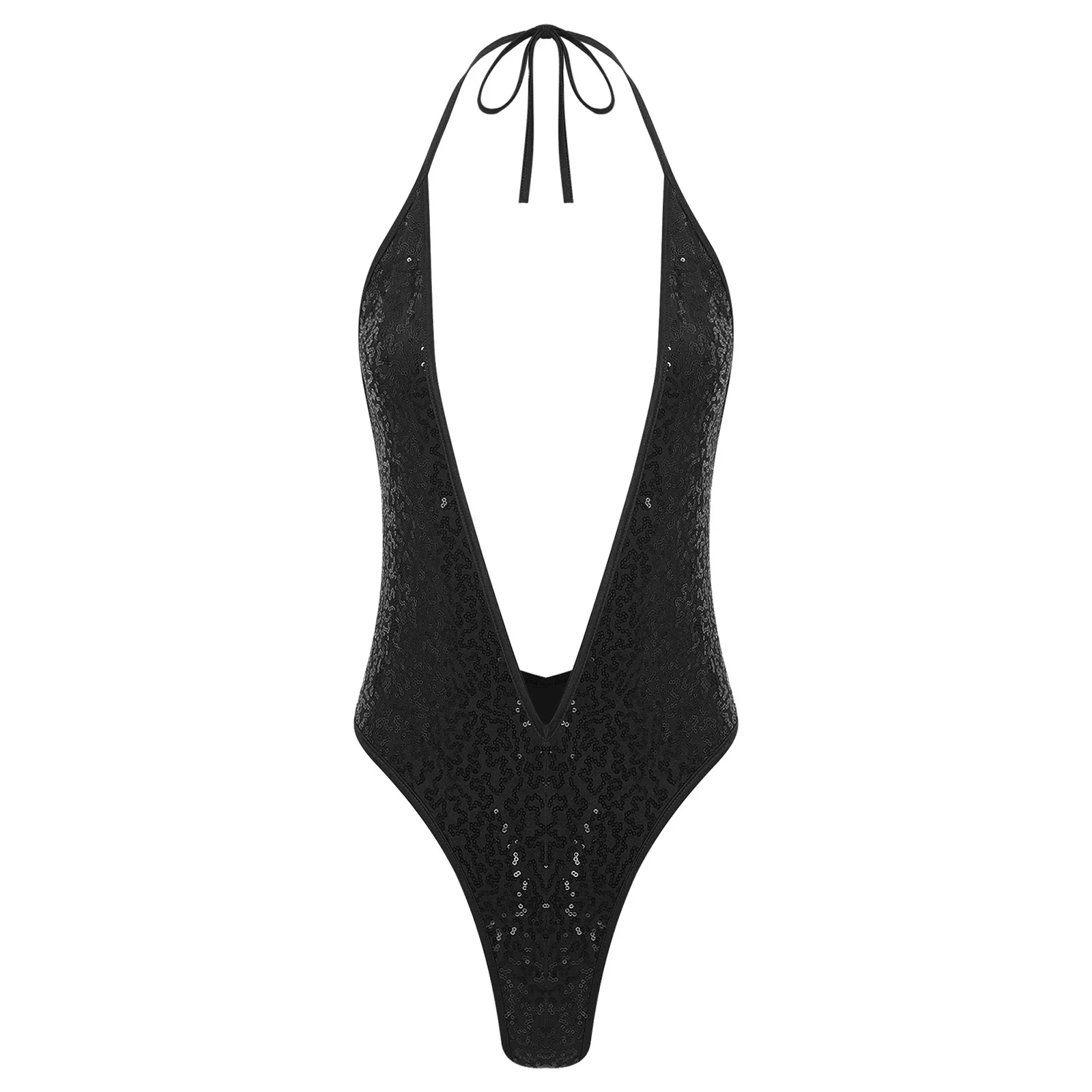 Women Glittery Sequined Bodysuit Swimwear Clubwear Halter Plunging V Neck Backless Leotard Bathing Suit for Beachwear Pool Party