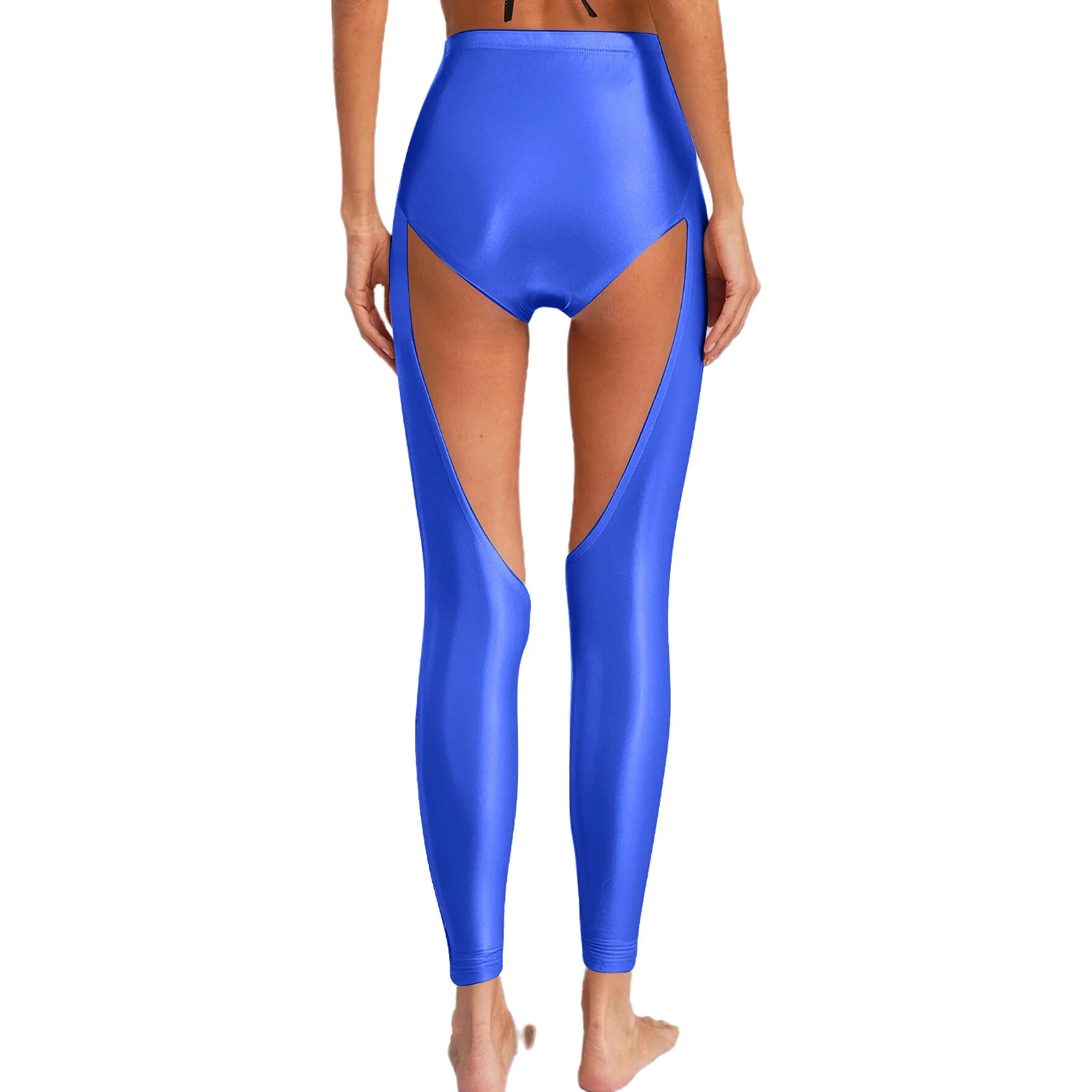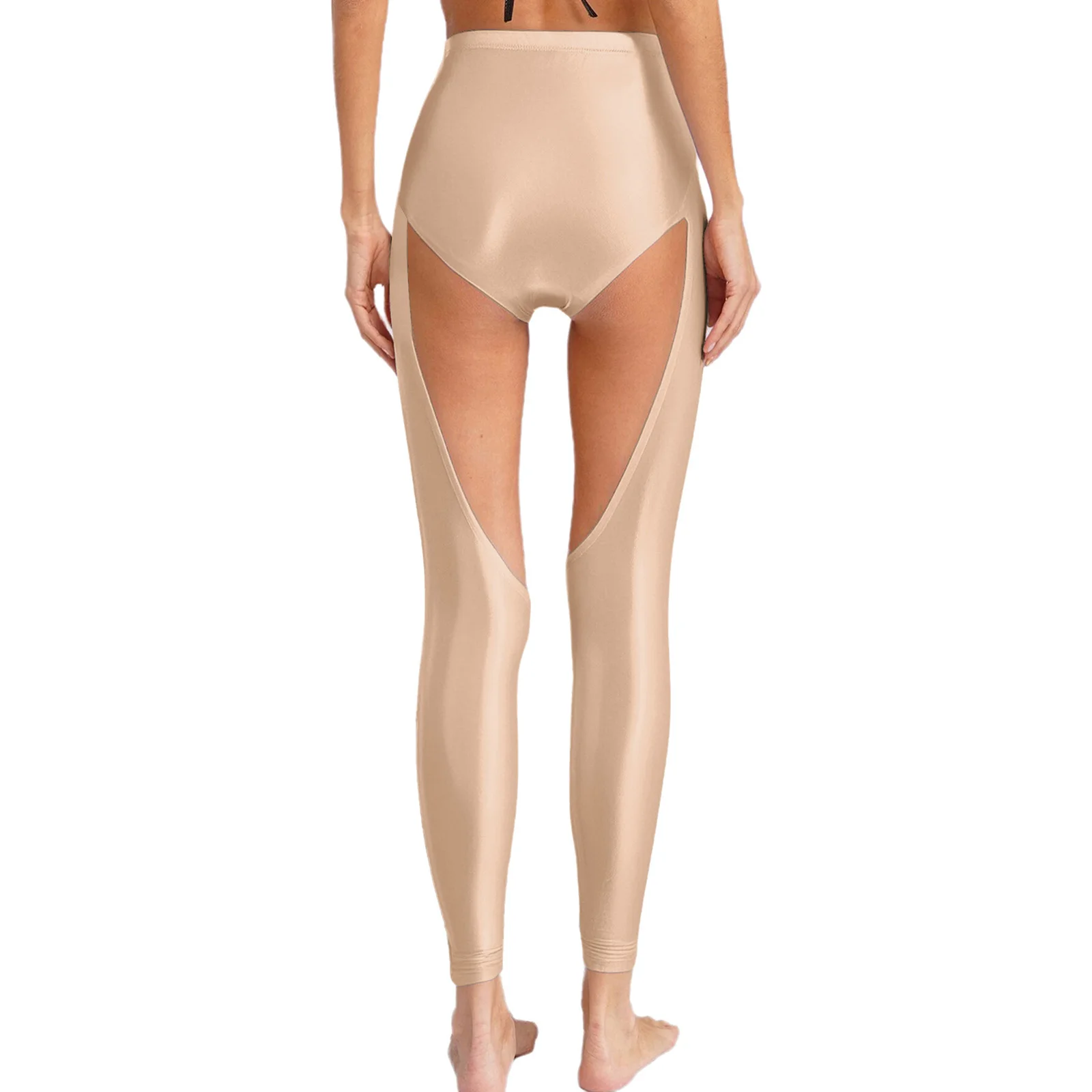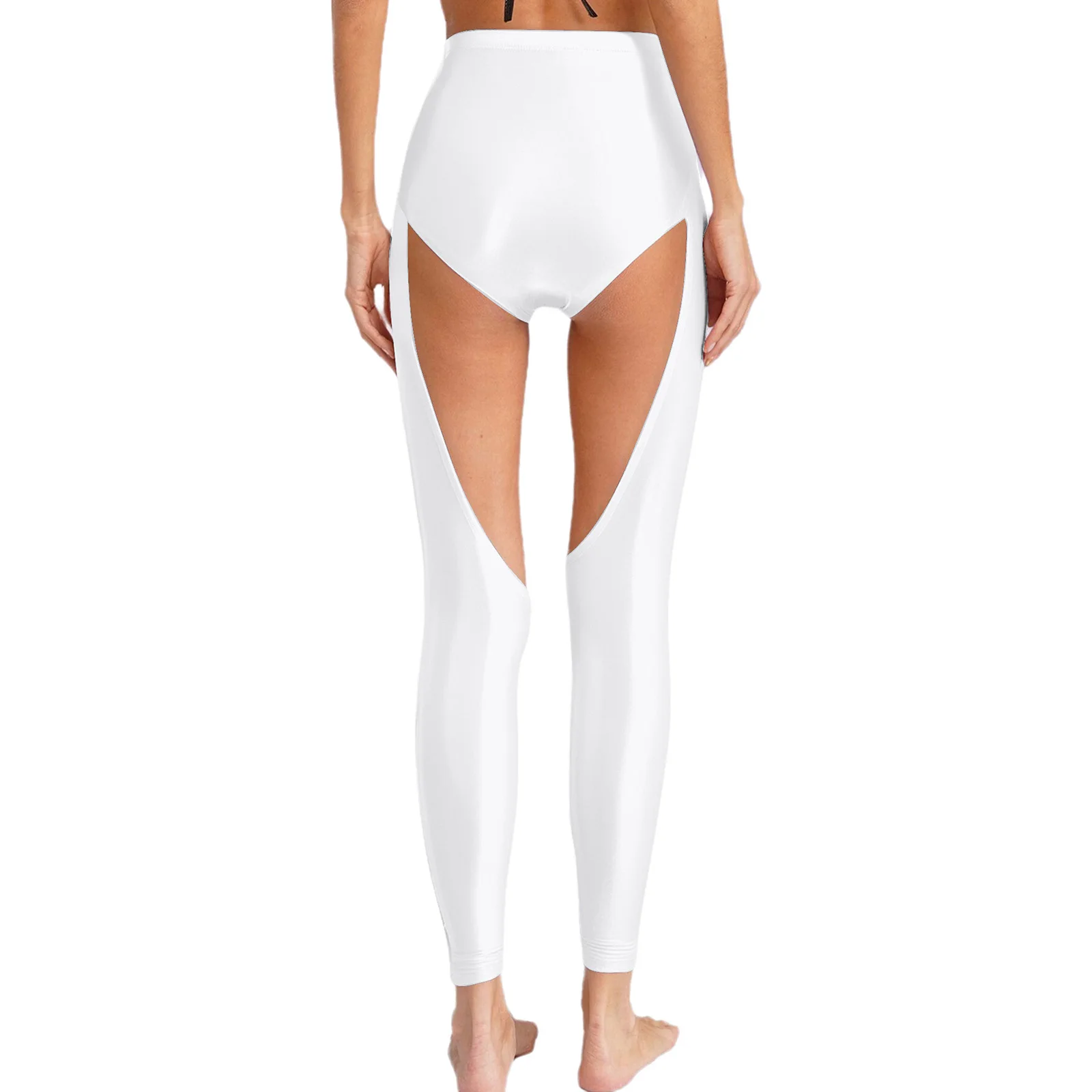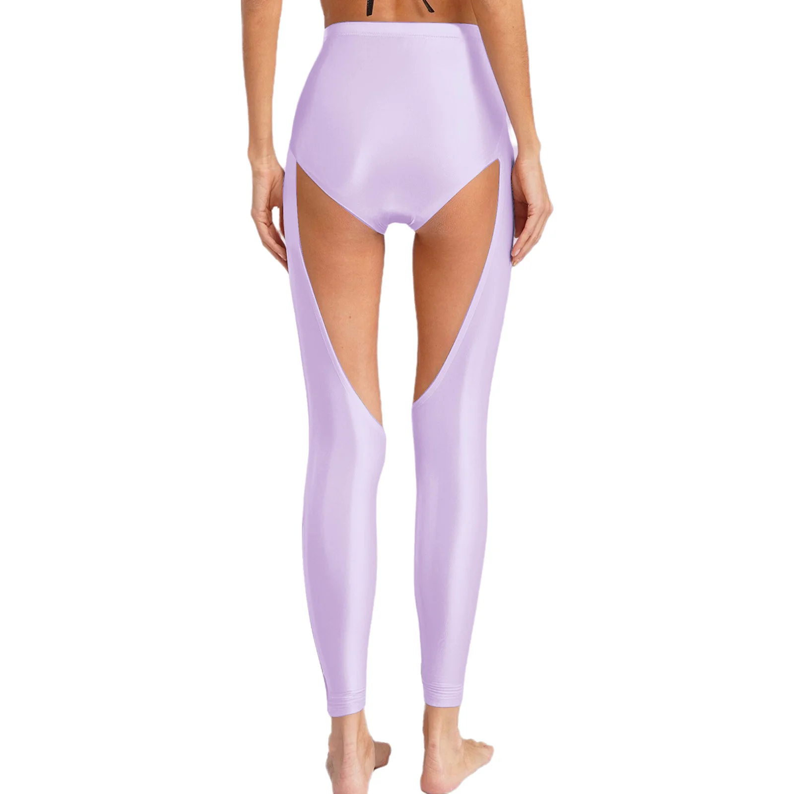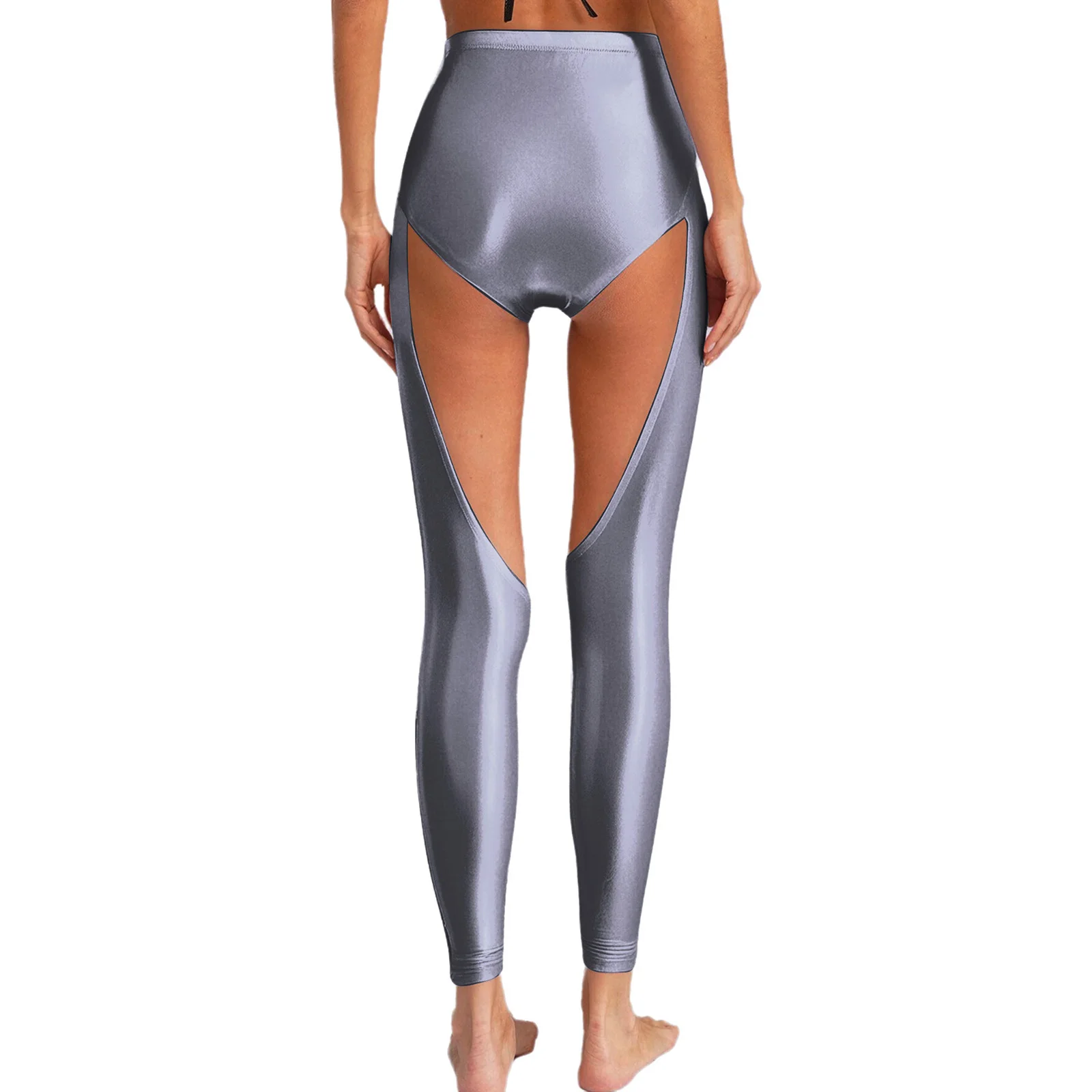 Women Glossy Hollow Out Thigh Leggings Yoga Clubwear Smooth Elastic Waist Cutout Tights Pants for Pilates Workout Gym Sports