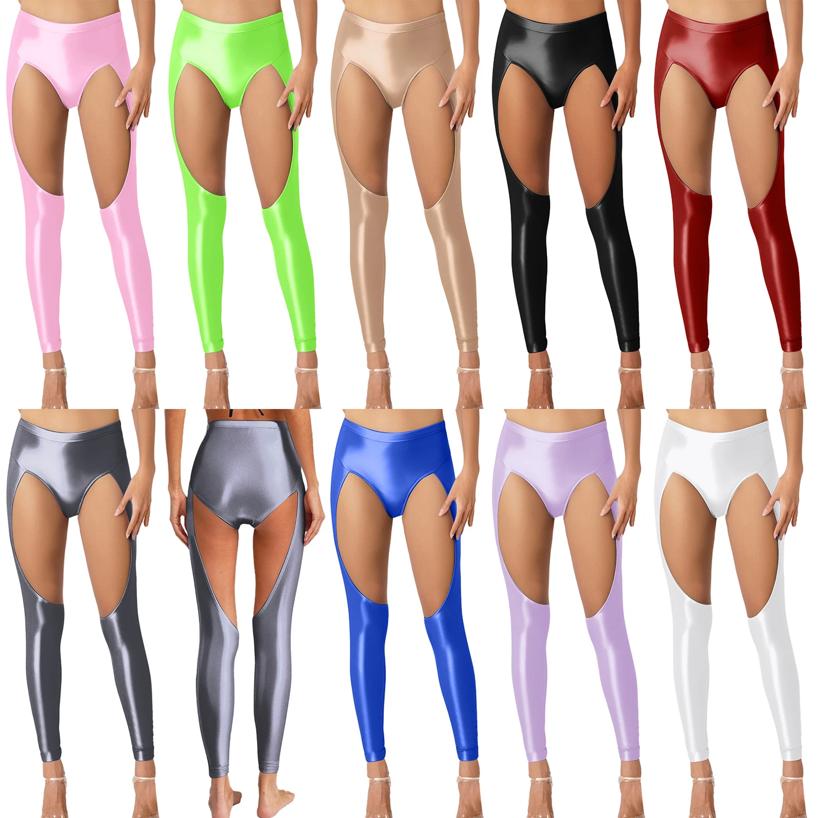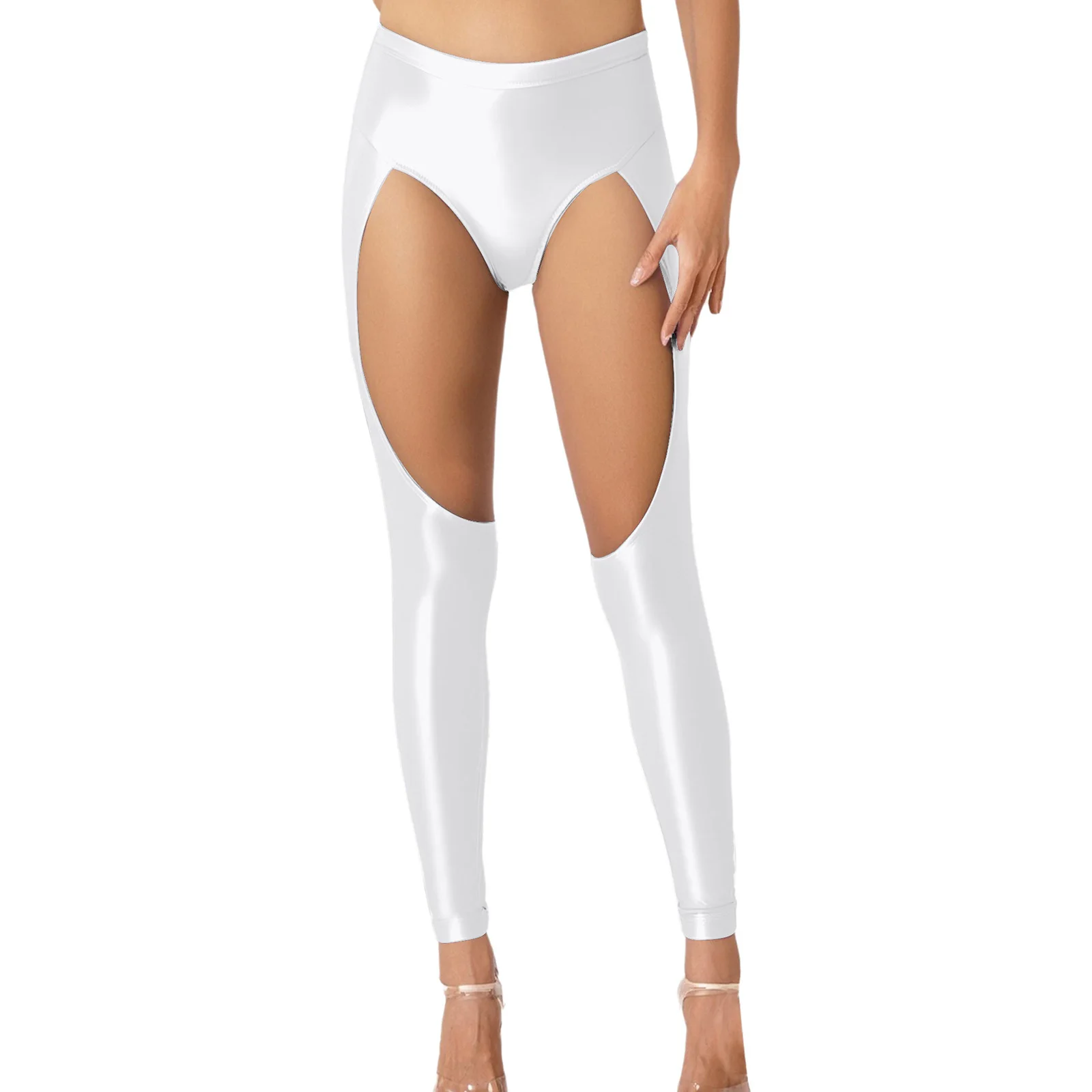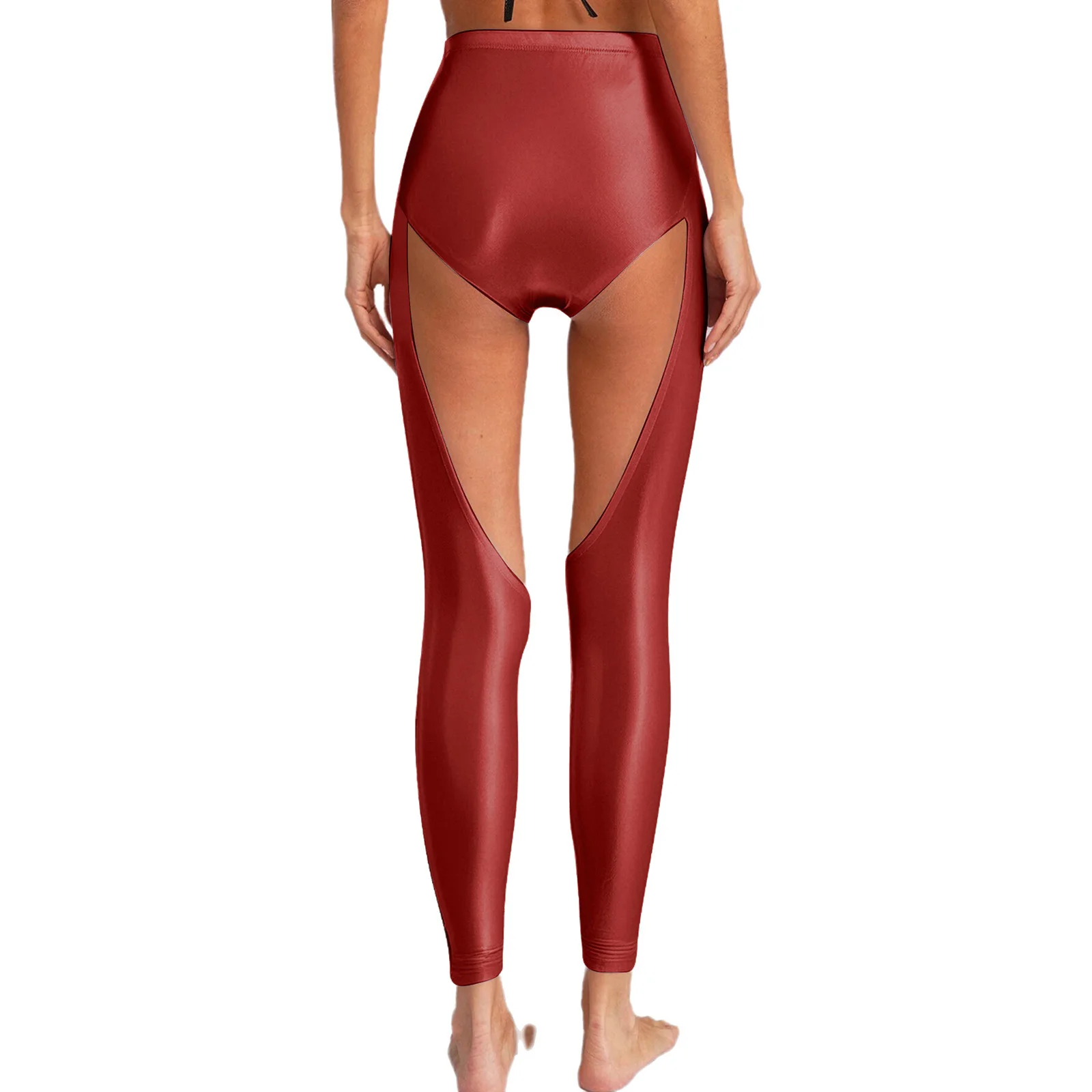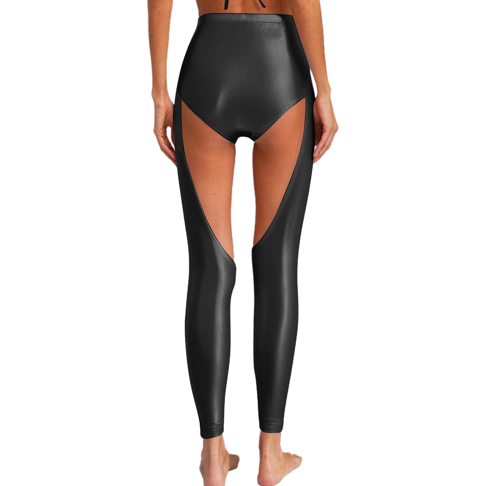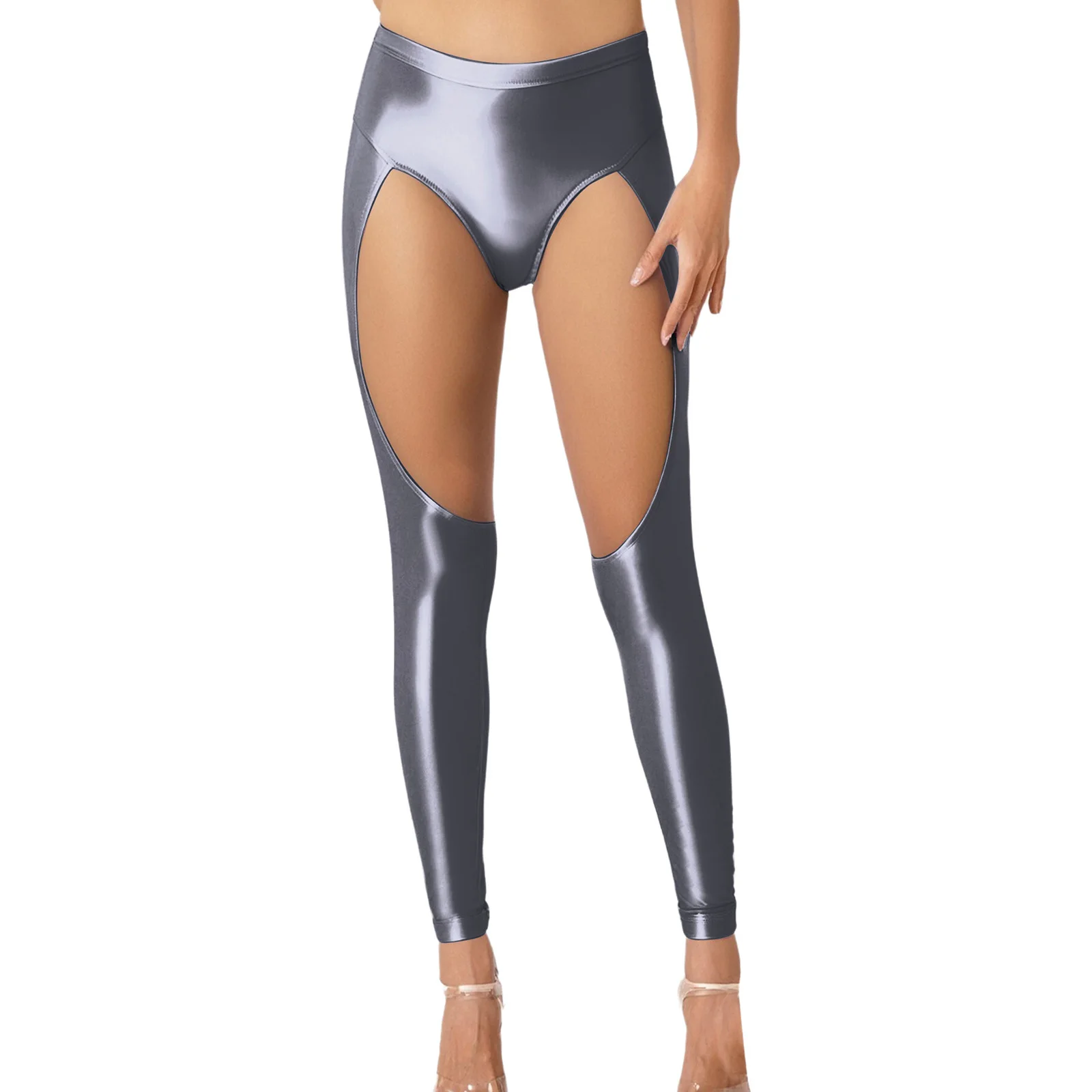 Women Glossy Hollow Out Thigh Leggings Yoga Clubwear Smooth Elastic Waist Cutout Tights Pants for Pilates Workout Gym Sports