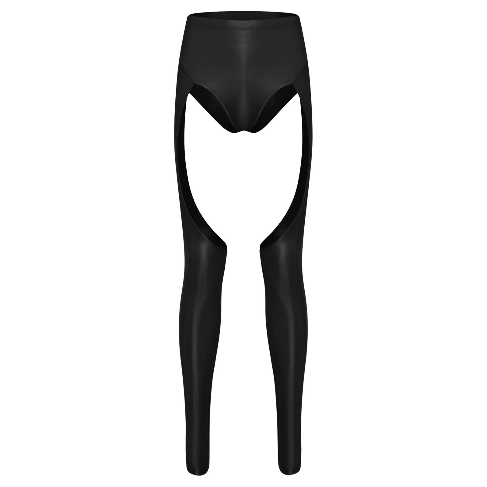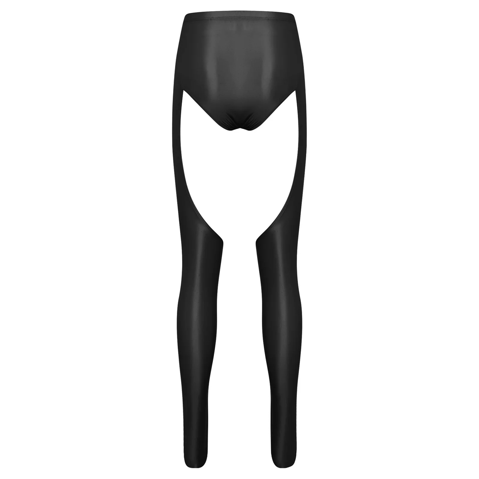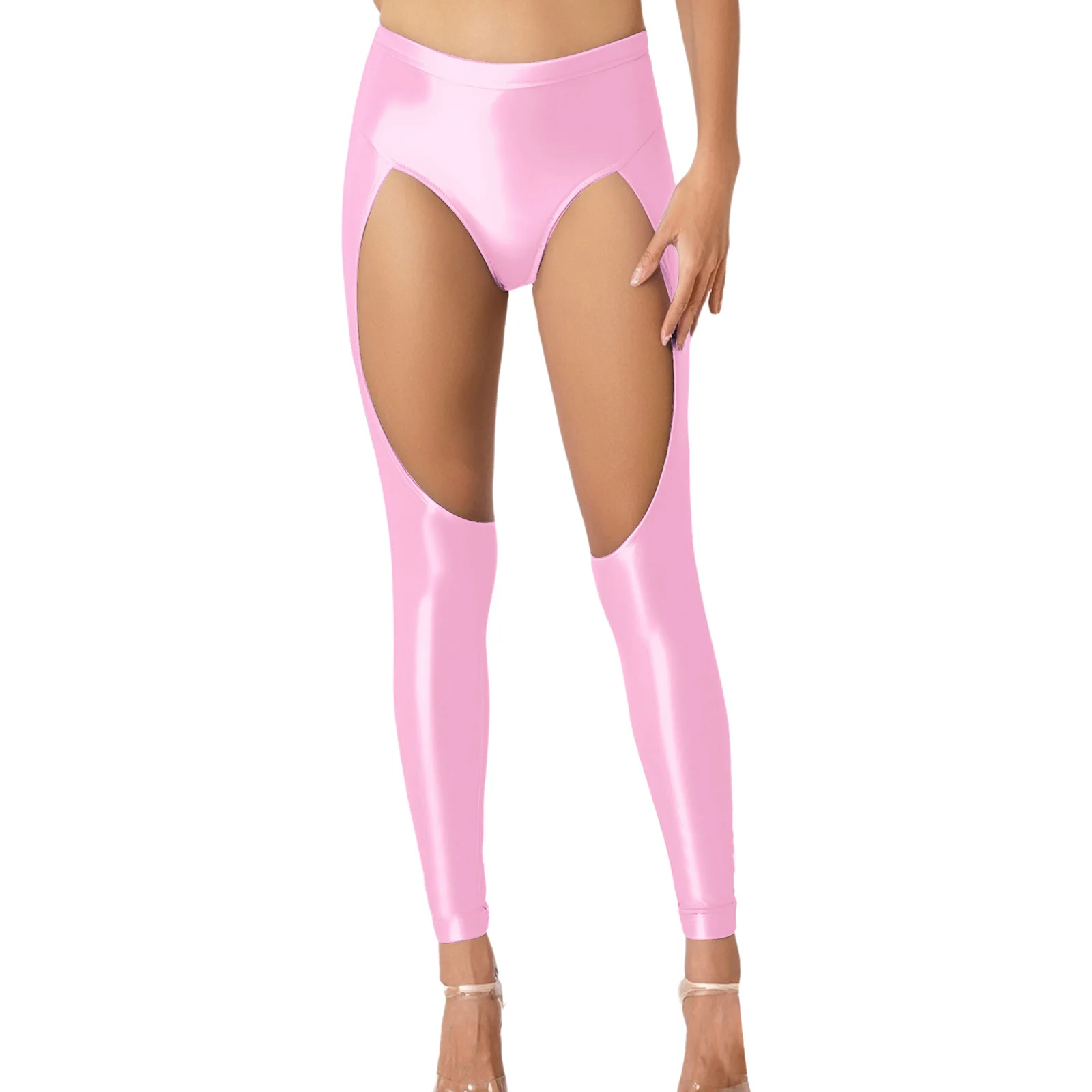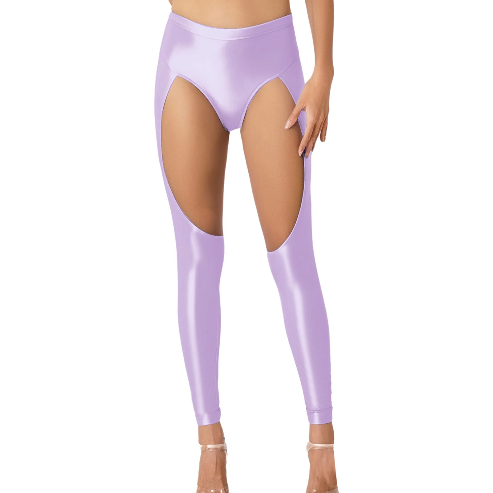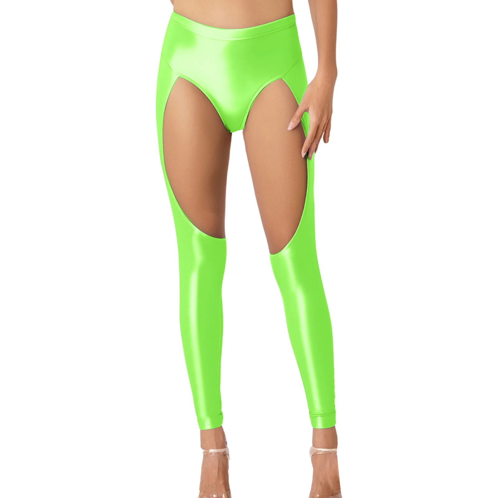 Women Glossy Hollow Out Thigh Leggings Yoga Clubwear Smooth Elastic Waist Cutout Tights Pants for Pilates Workout Gym Sports