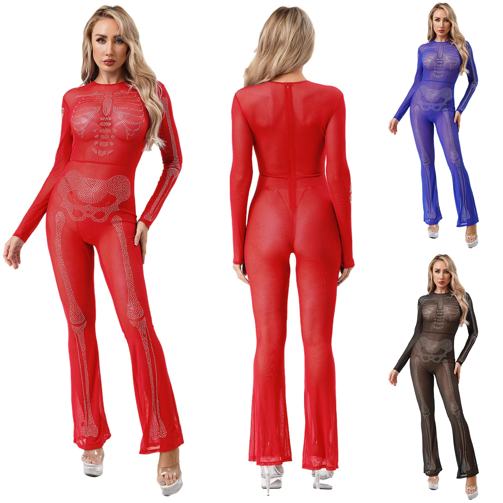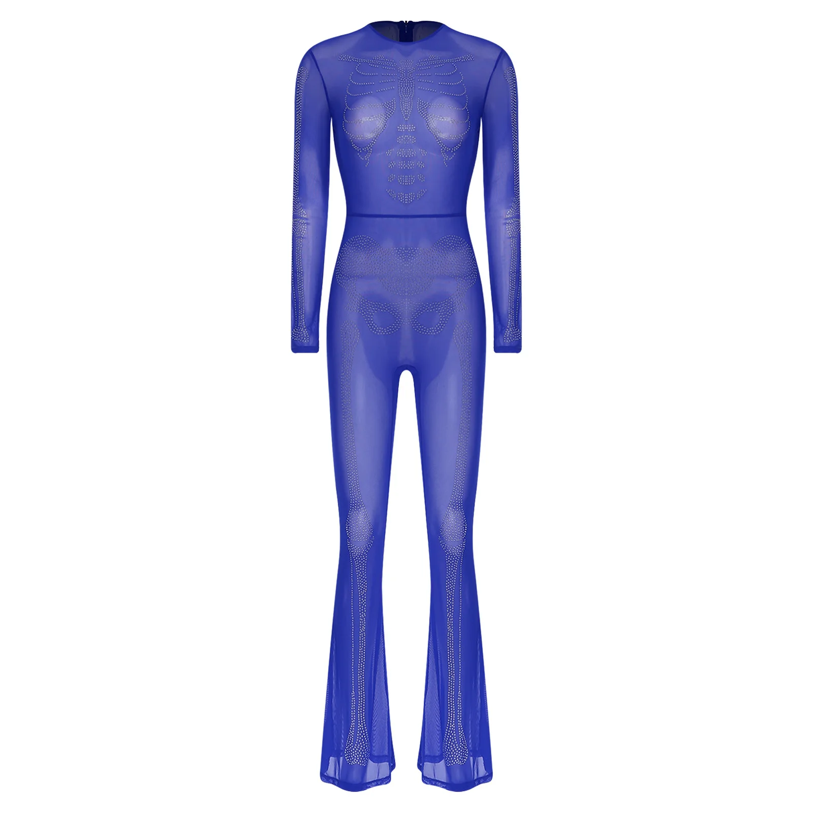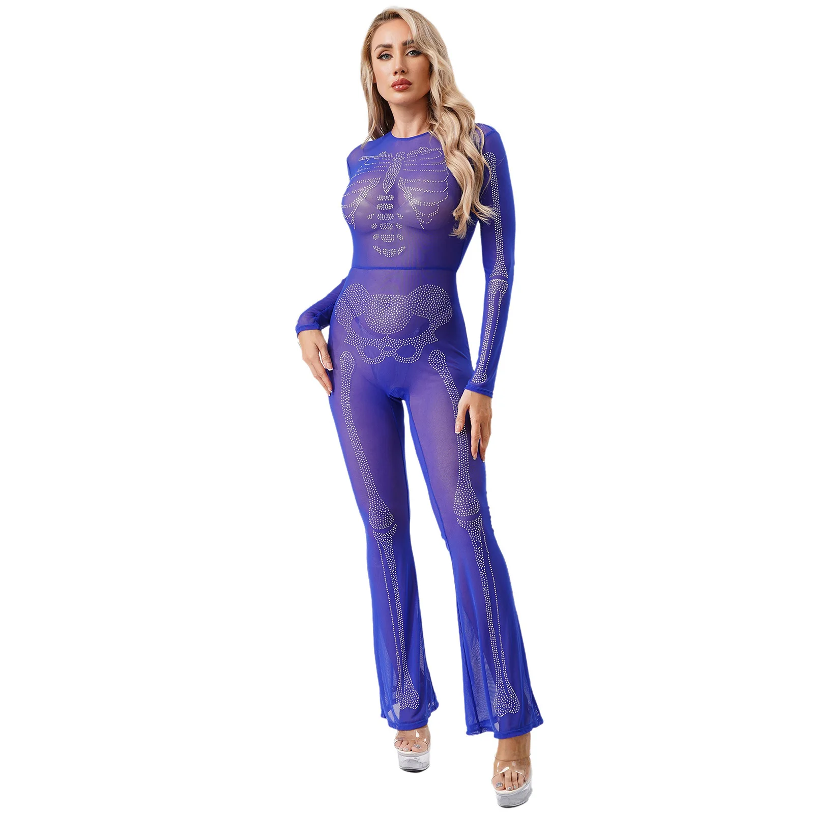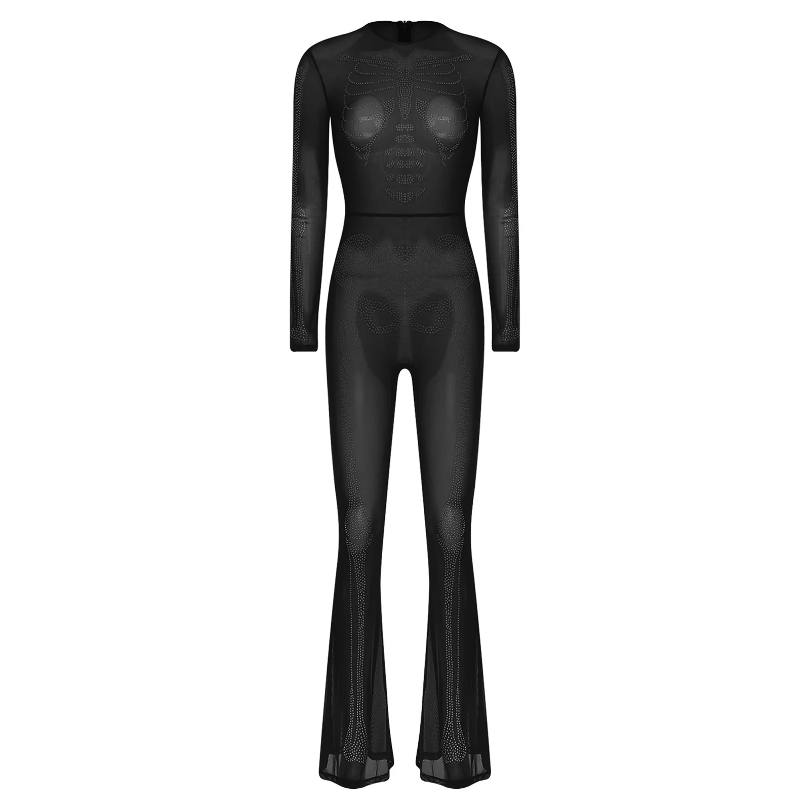 Women Halloween Cosplay Costume Shiny Rhinestones Skeleton Jumpsuit Back Invisible Zipper Bell-Bottom See-Through Mesh Bodysuit