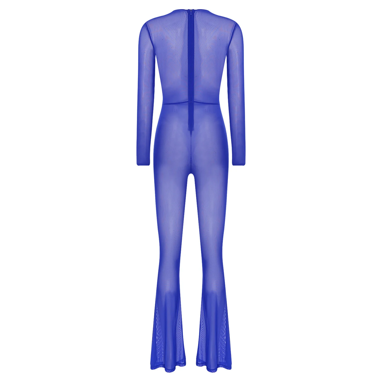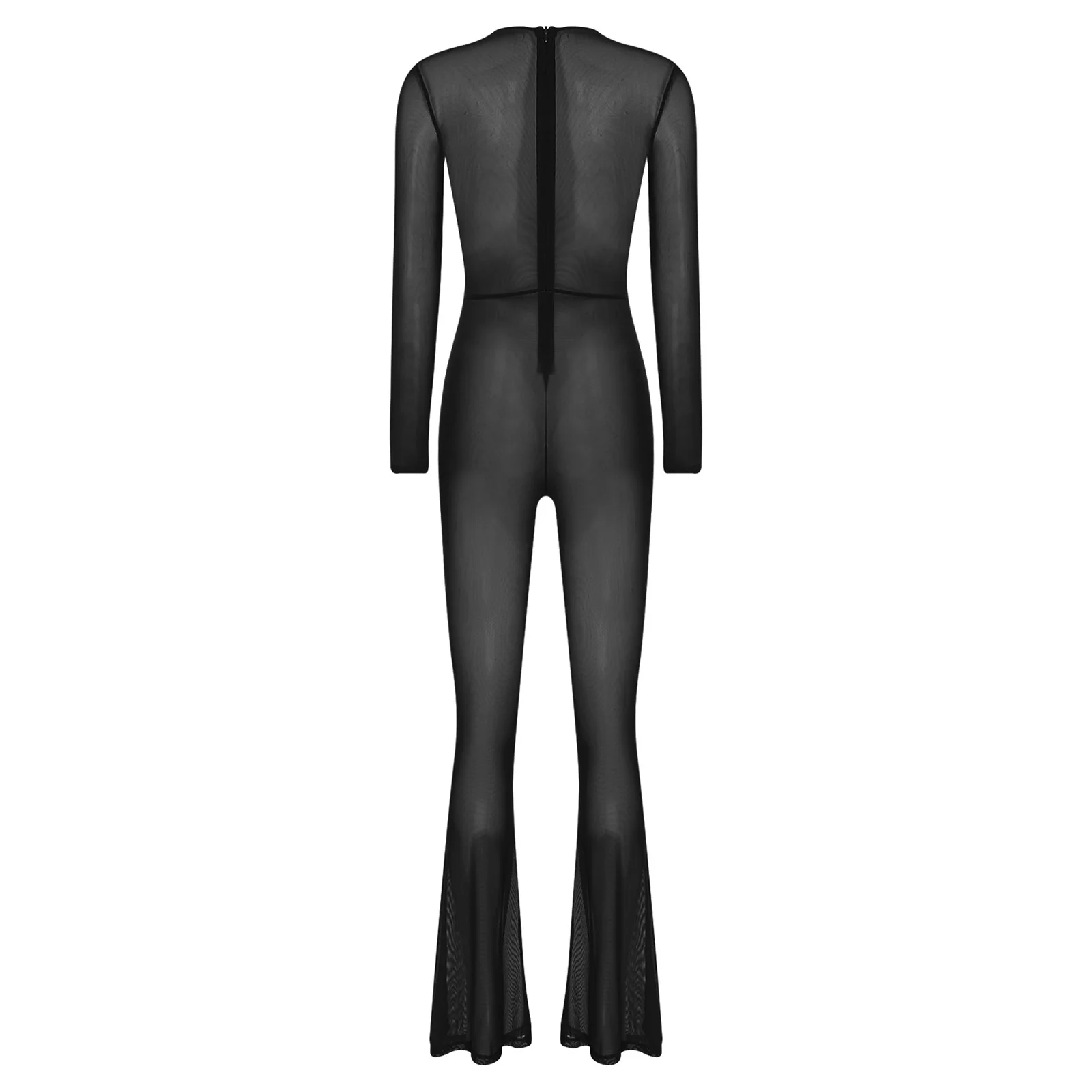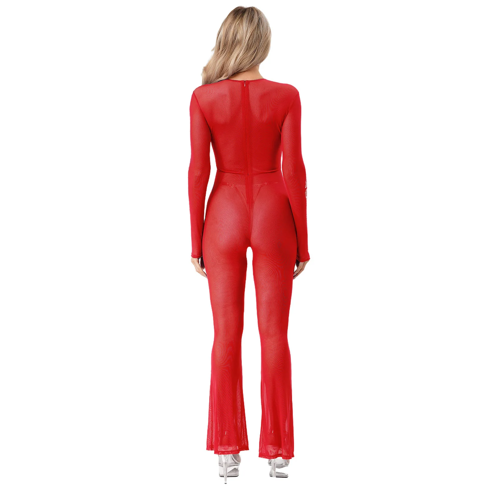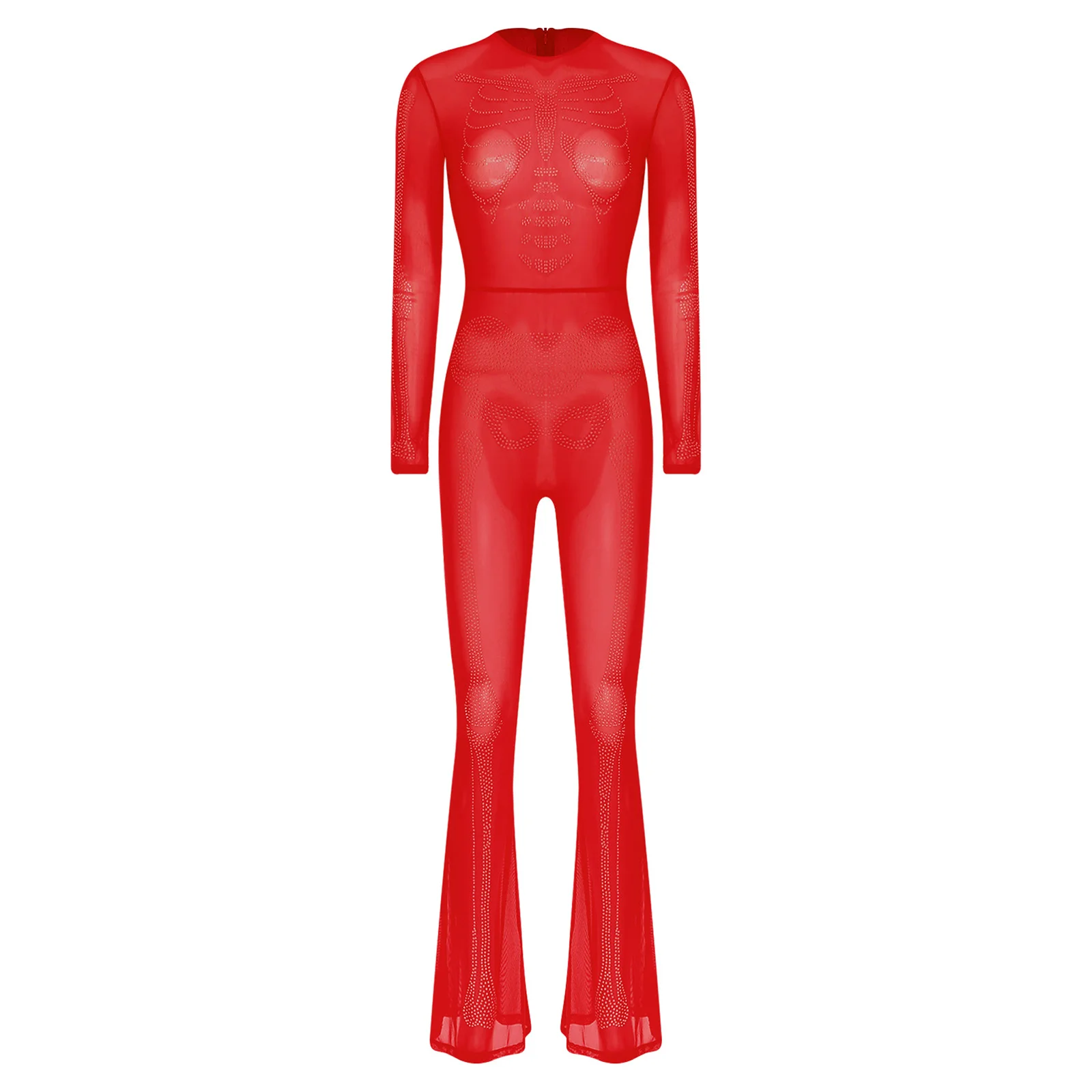 Women Halloween Cosplay Costume Shiny Rhinestones Skeleton Jumpsuit Back Invisible Zipper Bell-Bottom See-Through Mesh Bodysuit