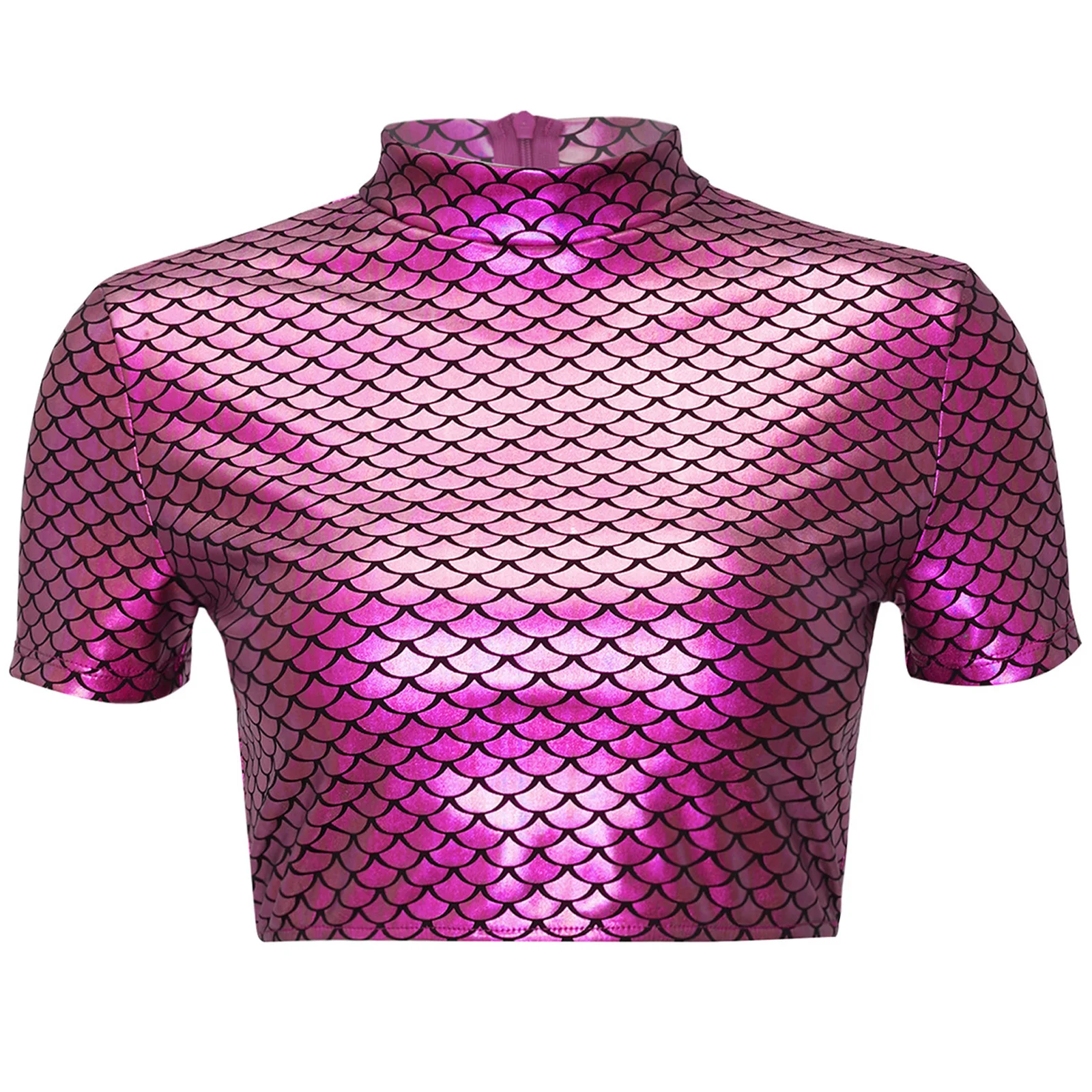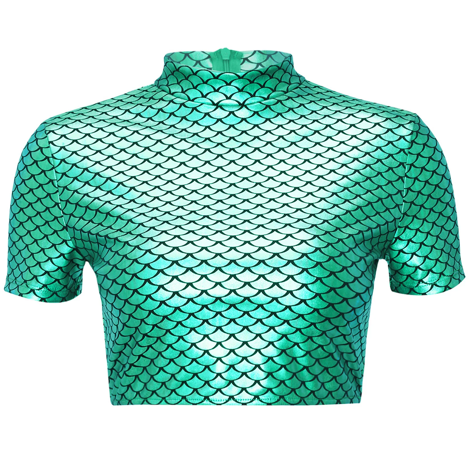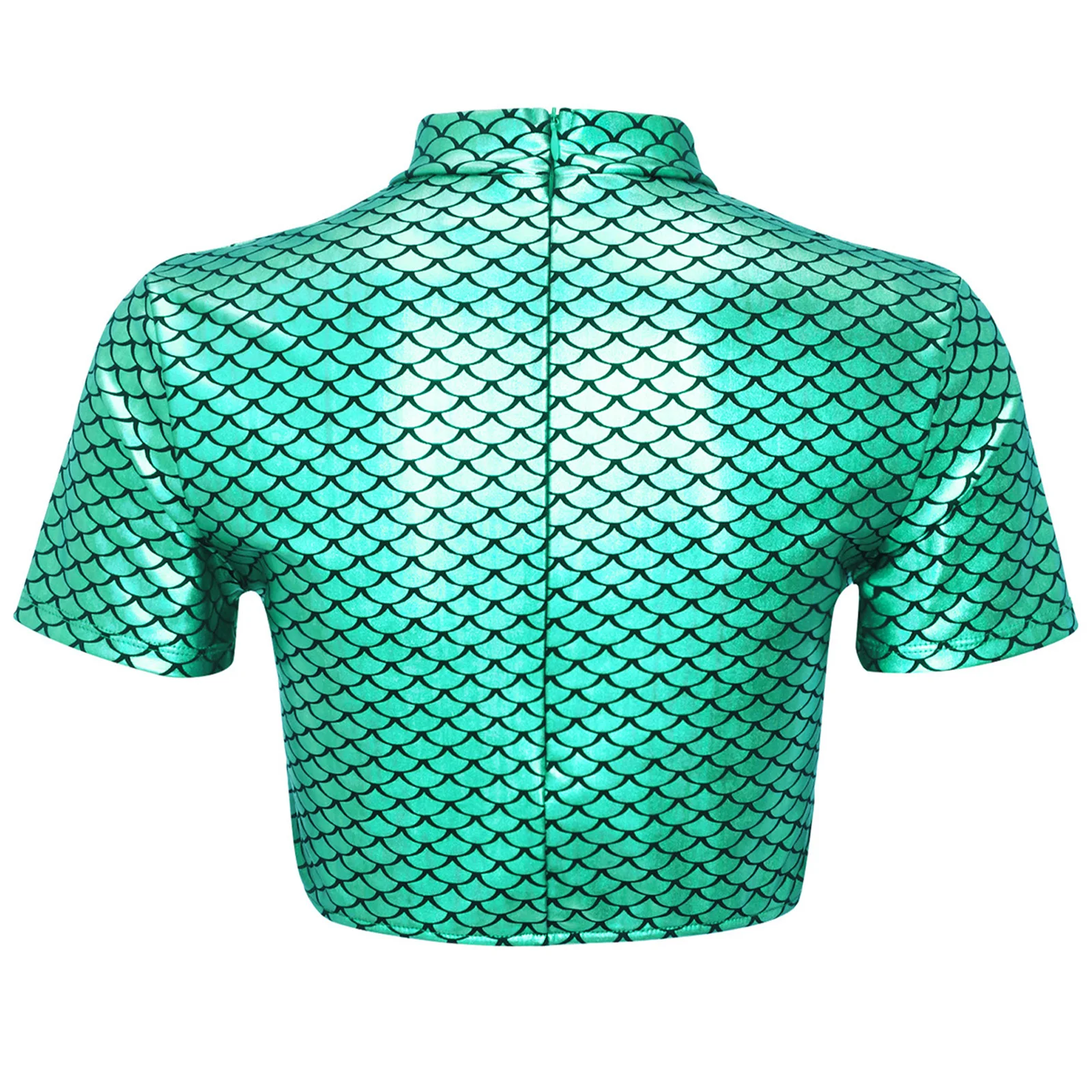 Women Halloween Mermaid Fish Scale Print Crop Tops Metallic Cosplay Dress Up Short Sleeve Back Zipper Shirt for Themed Party