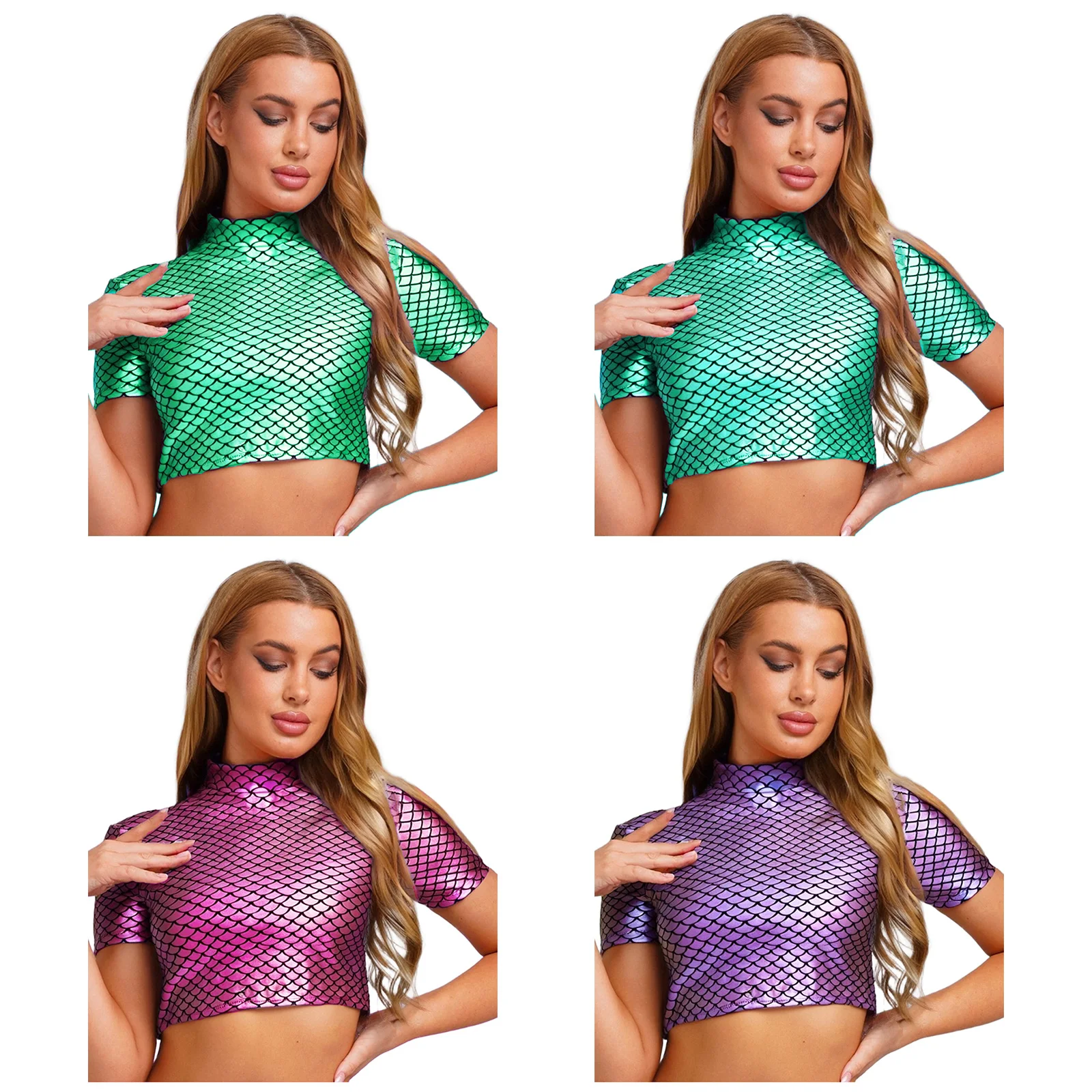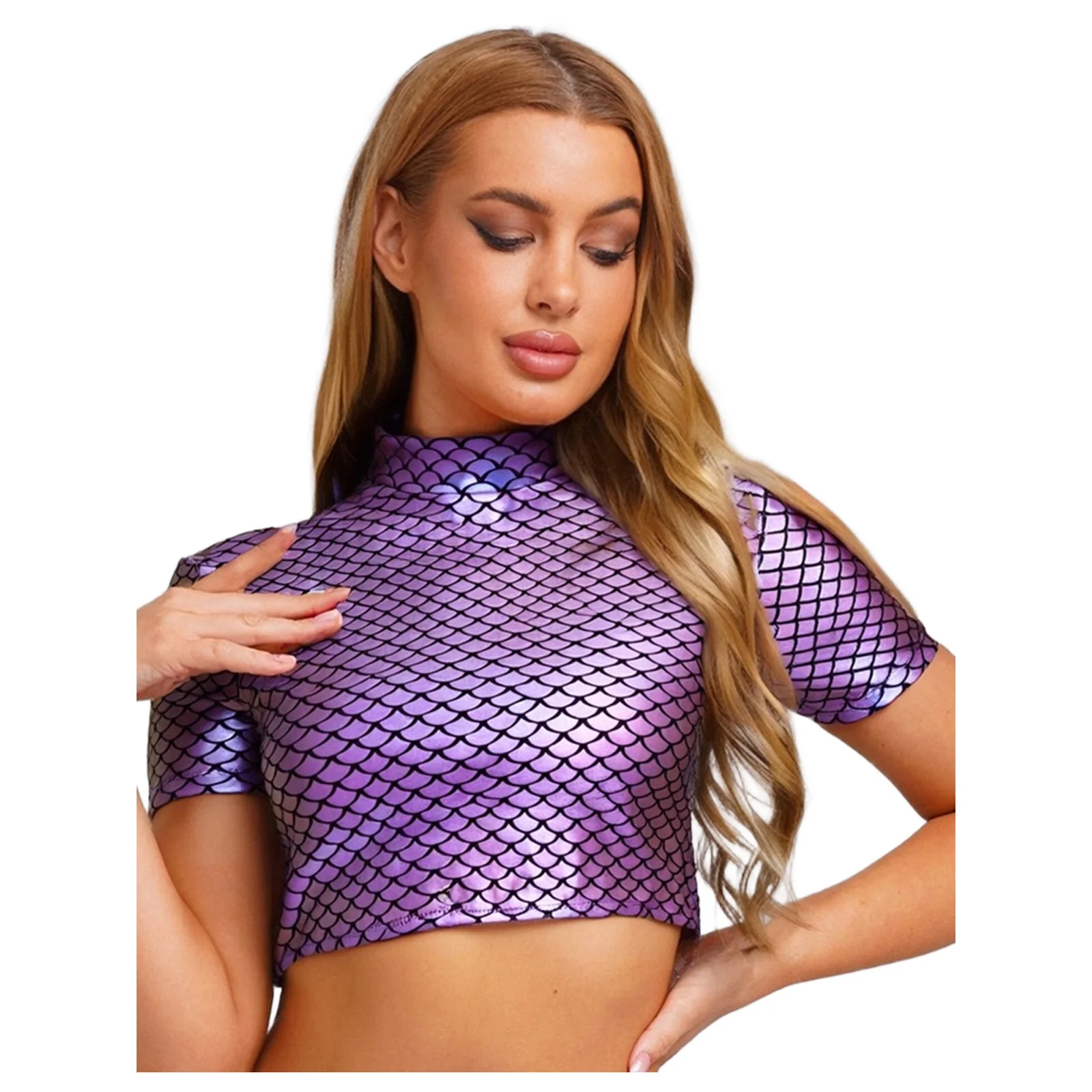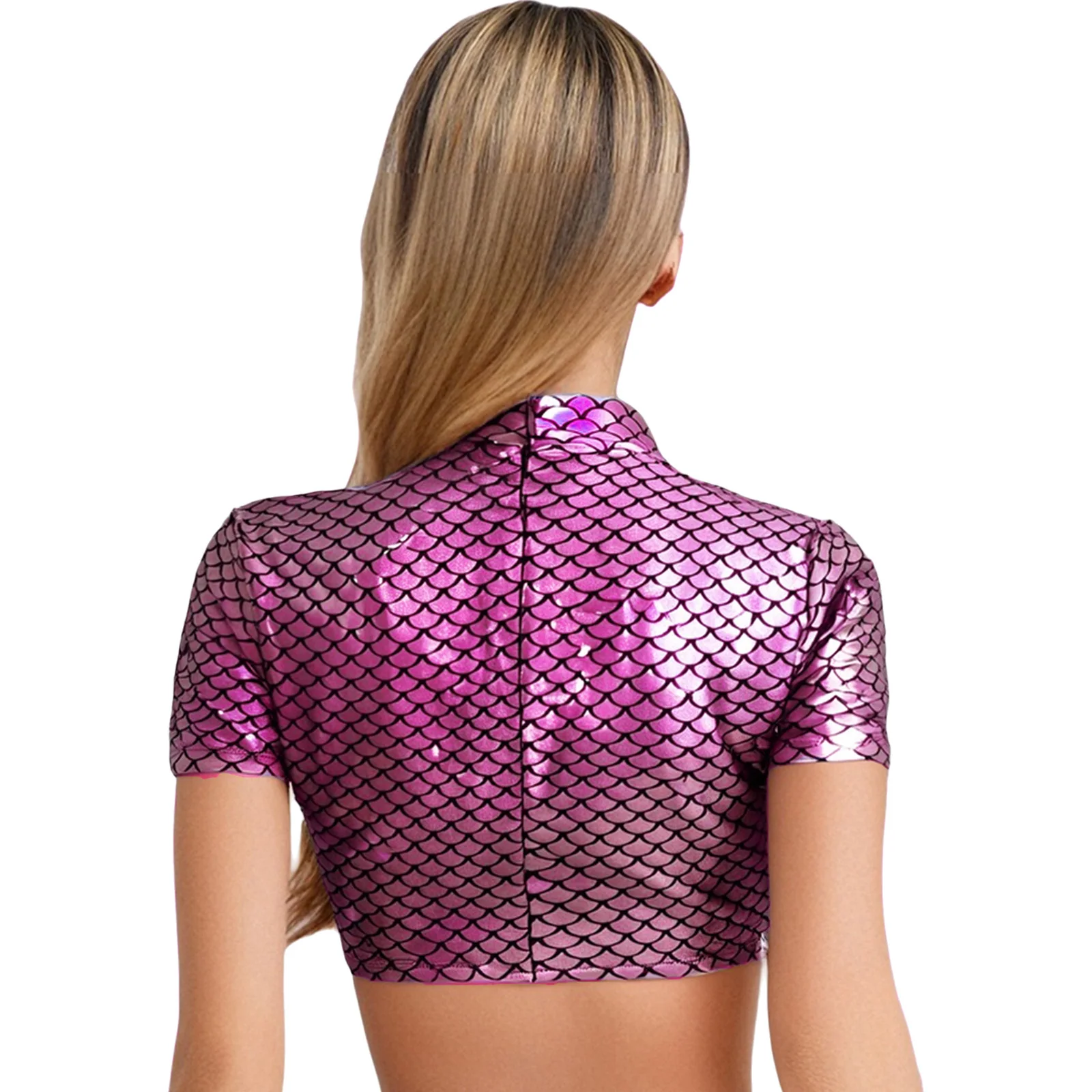 Women Halloween Mermaid Fish Scale Print Crop Tops Metallic Cosplay Dress Up Short Sleeve Back Zipper Shirt for Themed Party