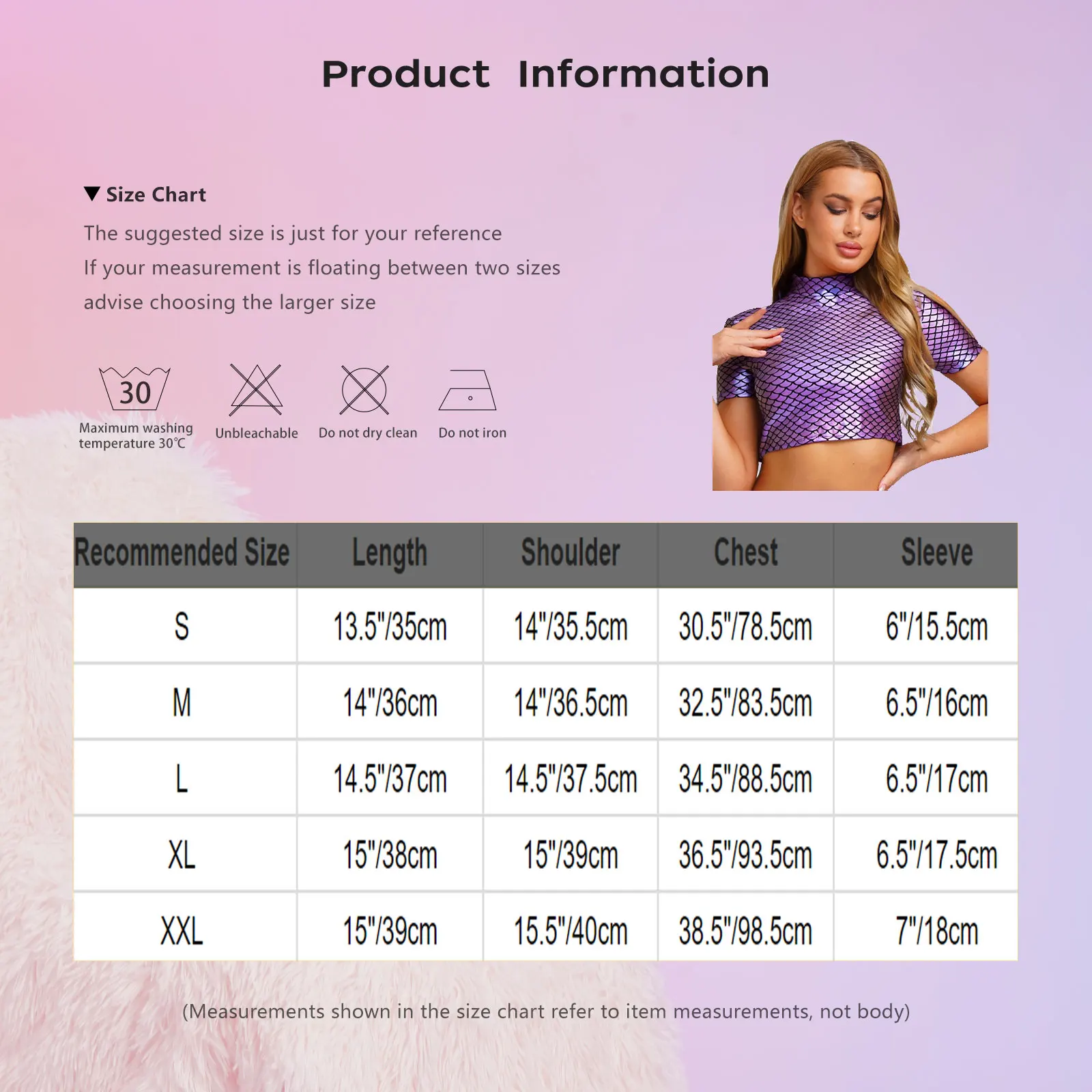 Size Chart: The suggested size is just for your reference. If your measurement is floating between two sizes, advise choosing the larger size. (Measurements shown in the size chart refer to item measurements, not body)