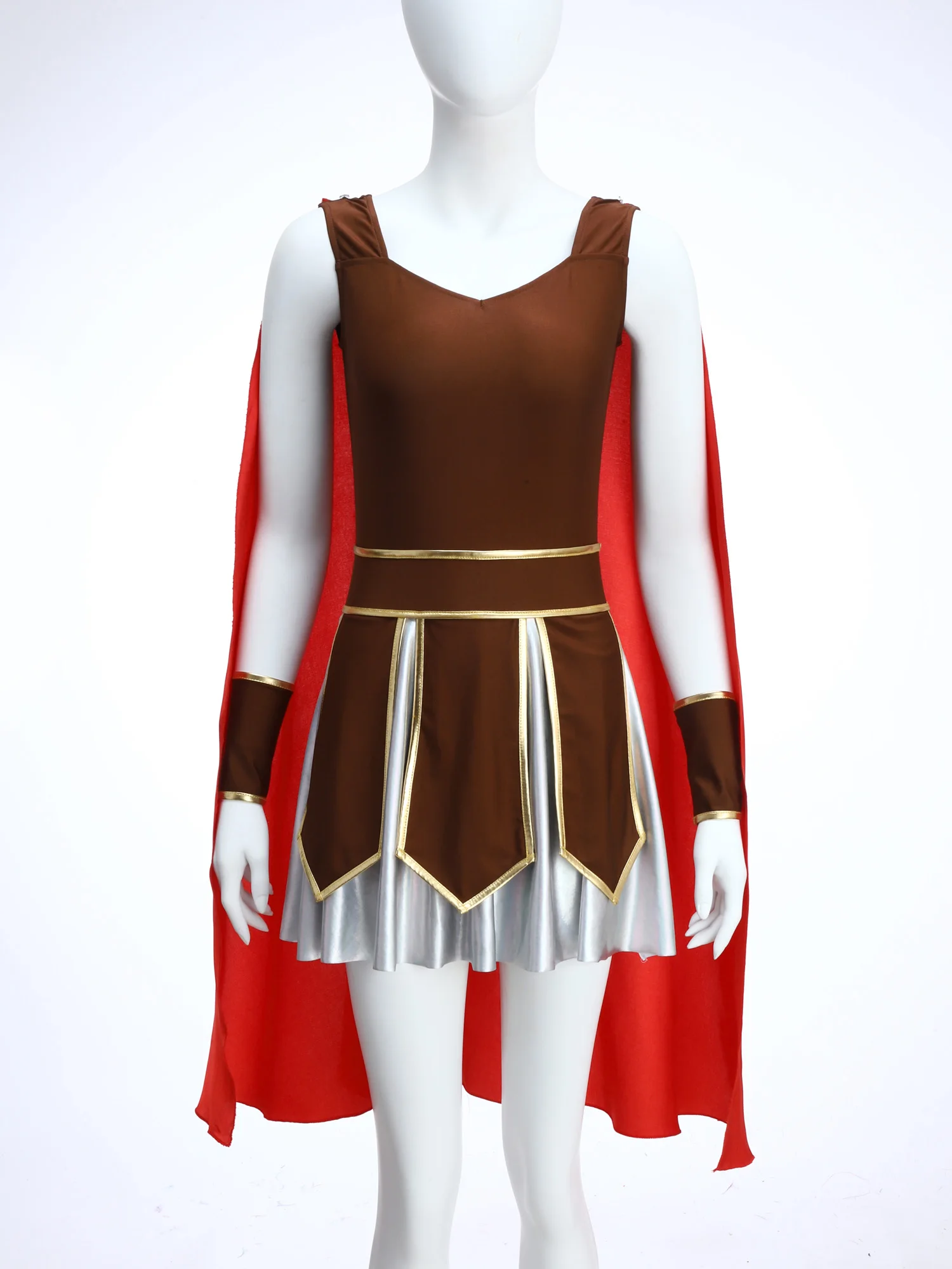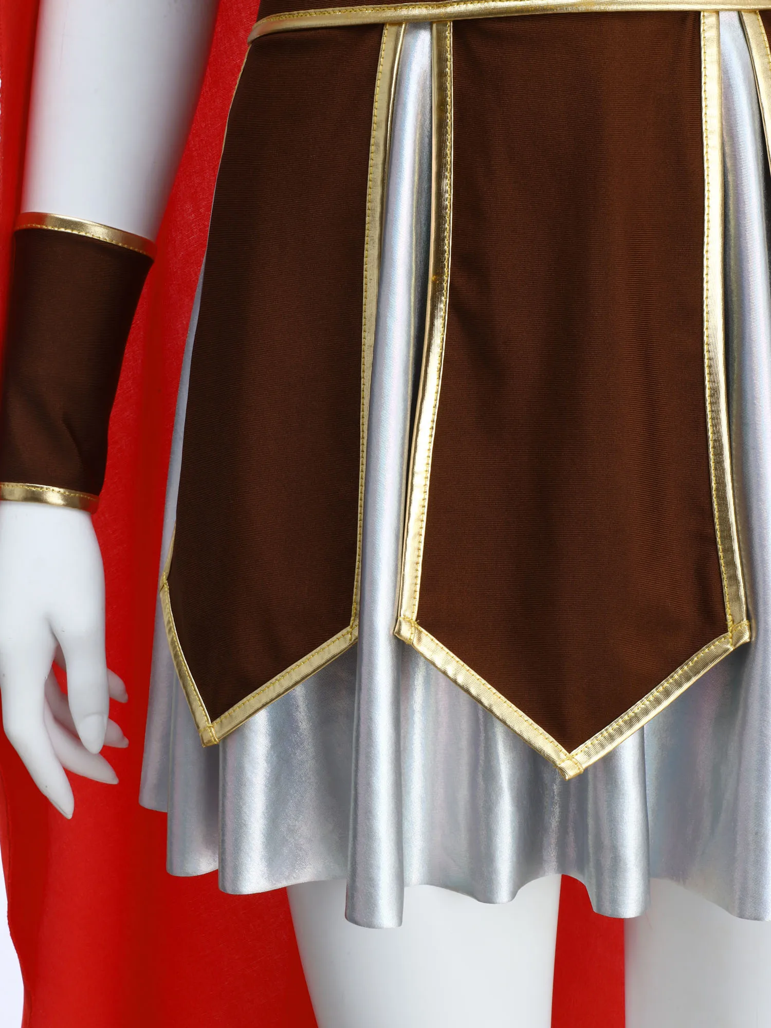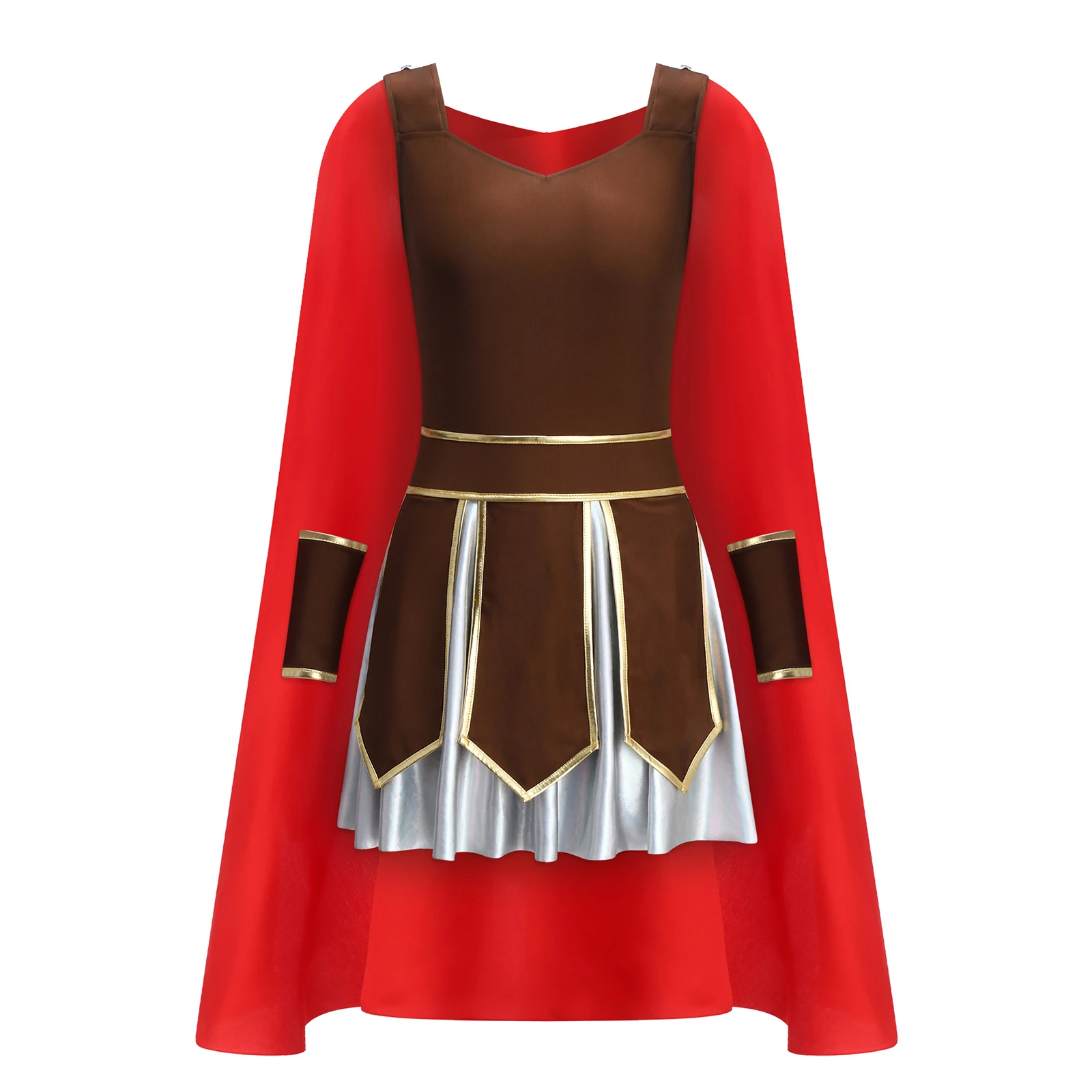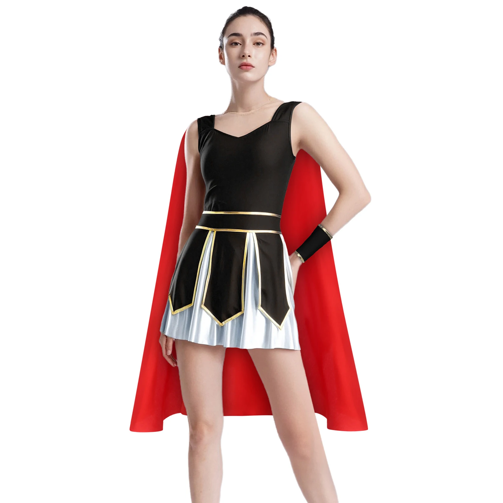 Women Halloween Roman Gladiator Warrior Princess Carnival Dress Up Roman Solider Cosplay Costume Dress with Satin Cape And Cuffs