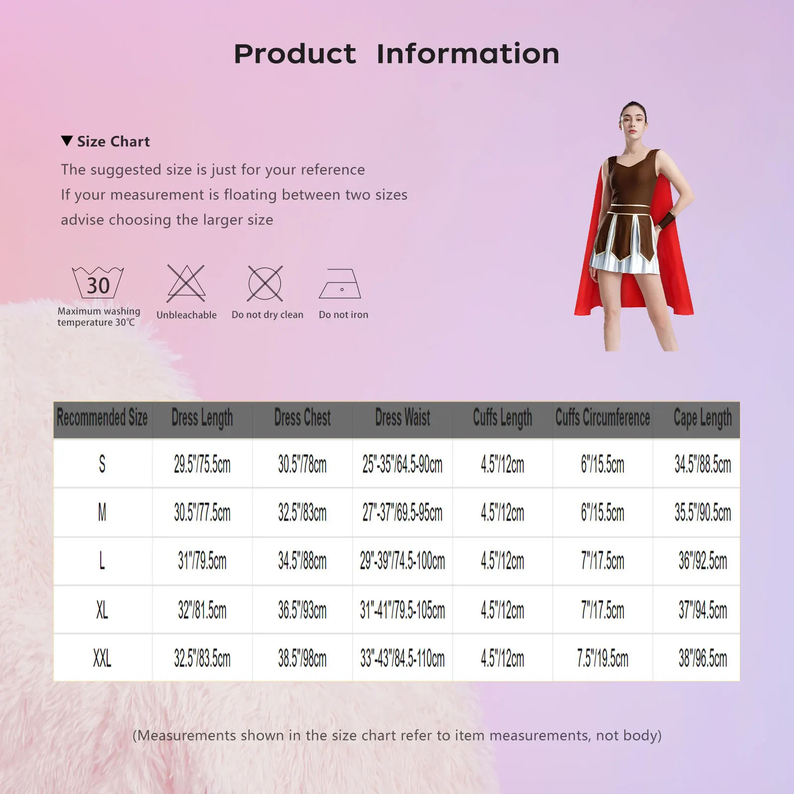 | Tag No. | Recommended Size | Dress Length | Dress Chest | Dress Waist | Cuffs Length | Cuffs Circumference | Cape Length |