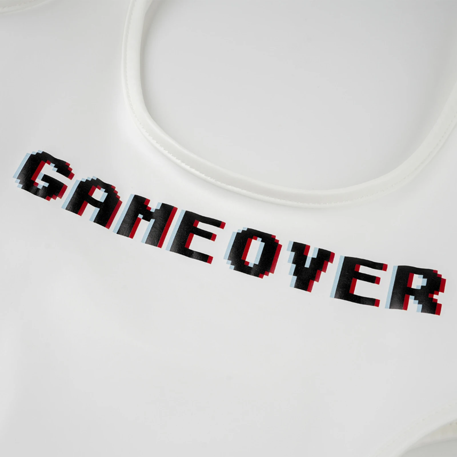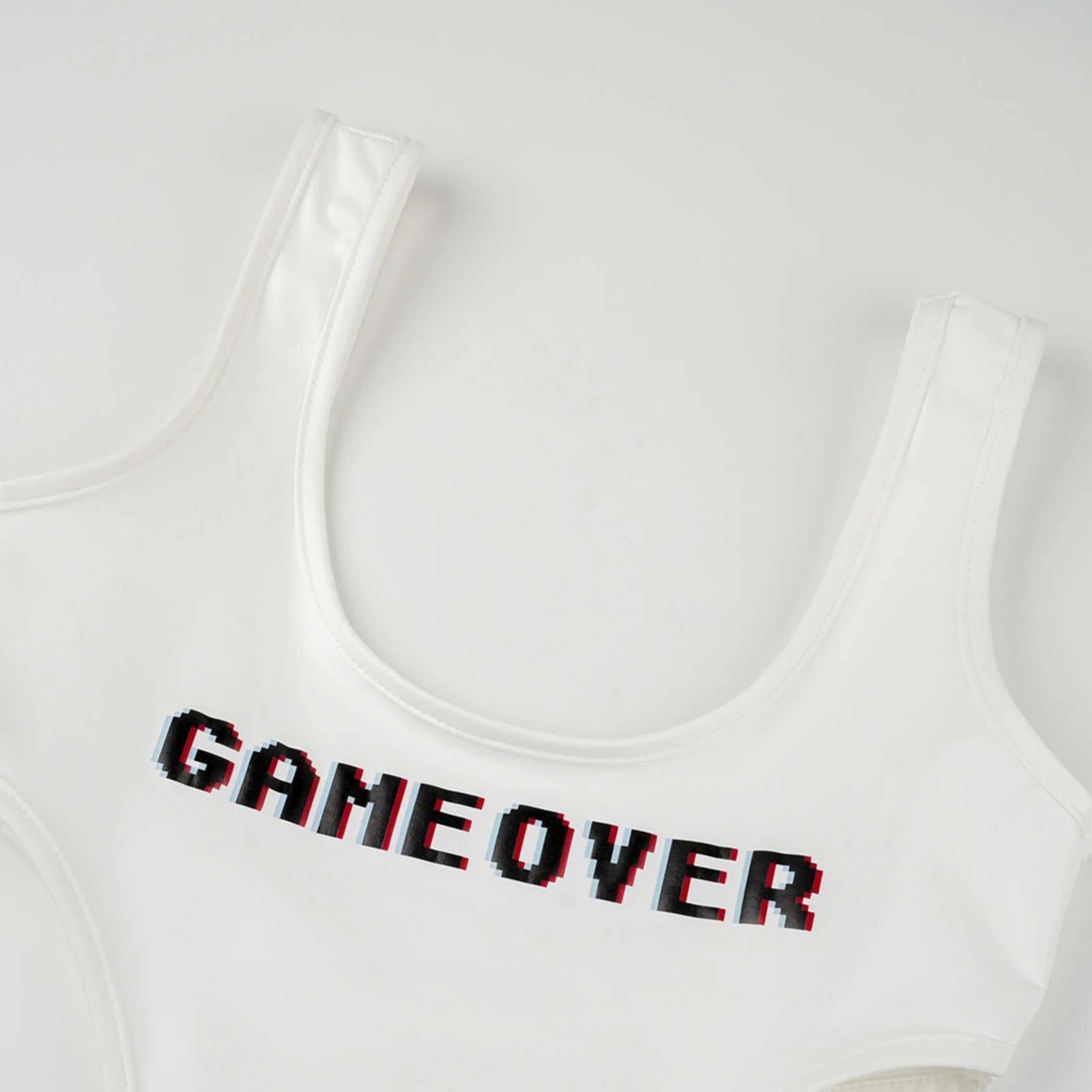 Sleeveless, round neckline bodysuit is designed with printed letters at front, high-cut style.