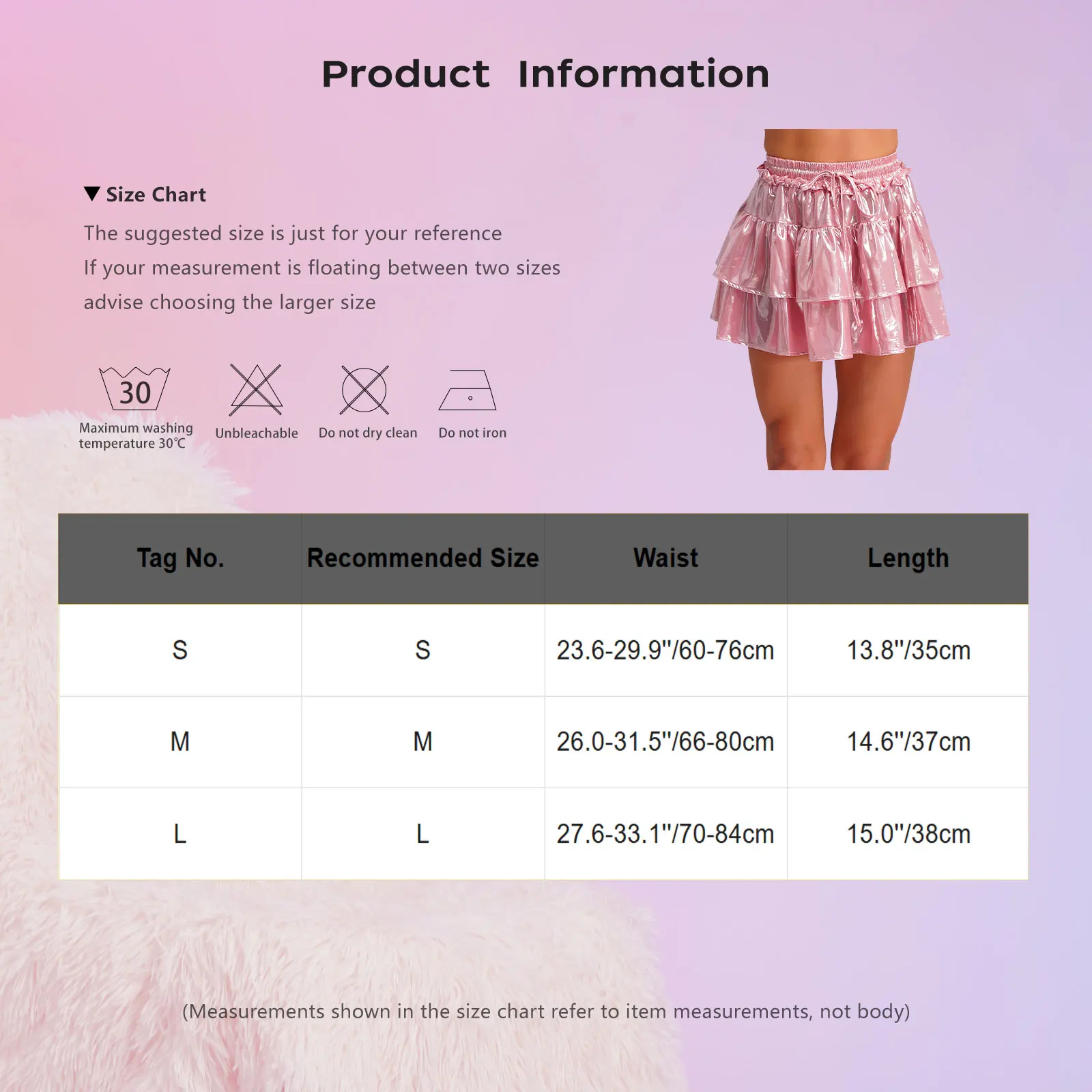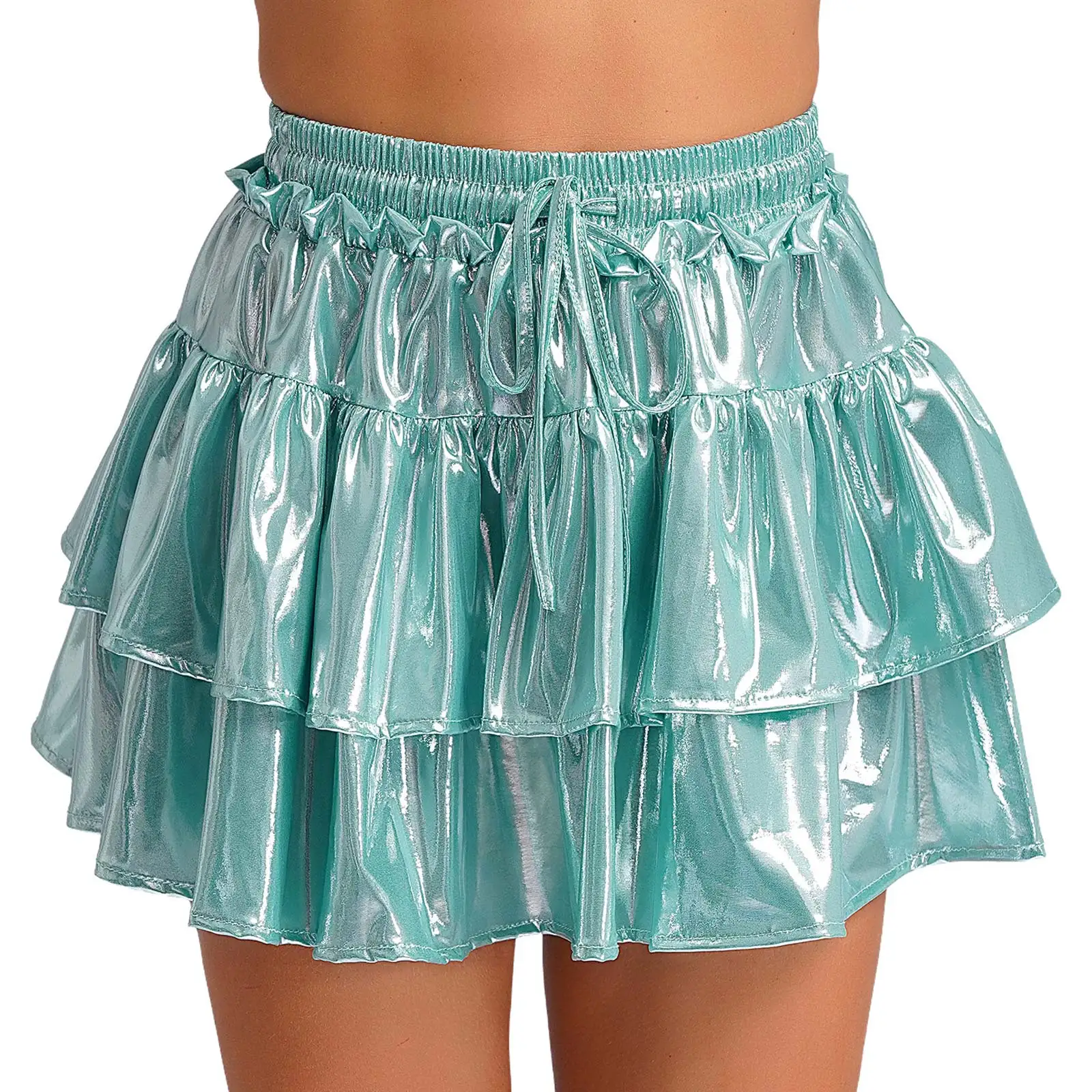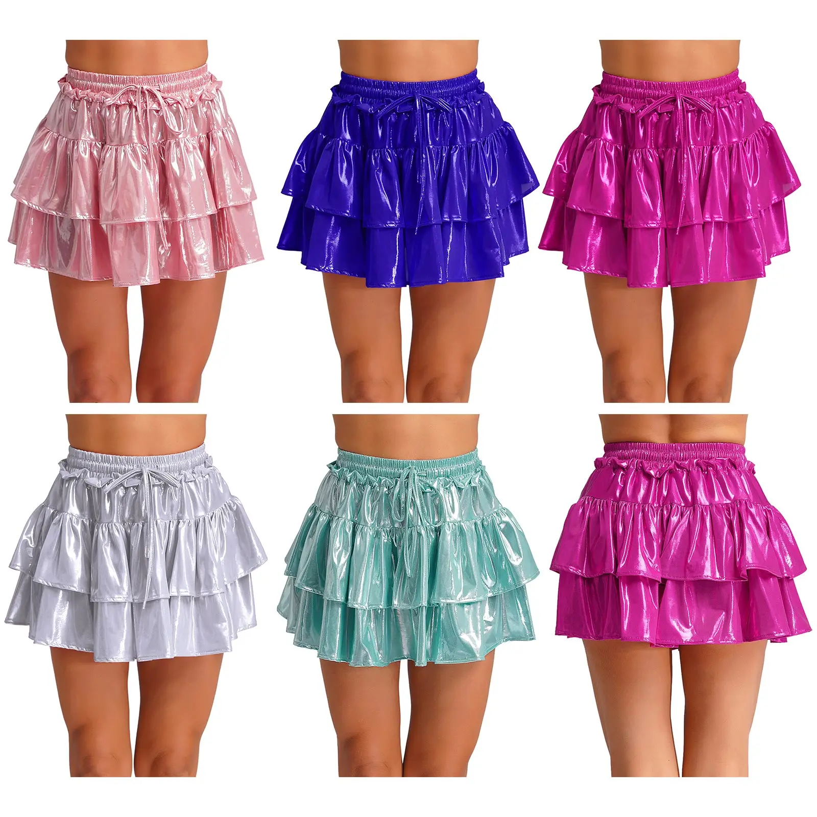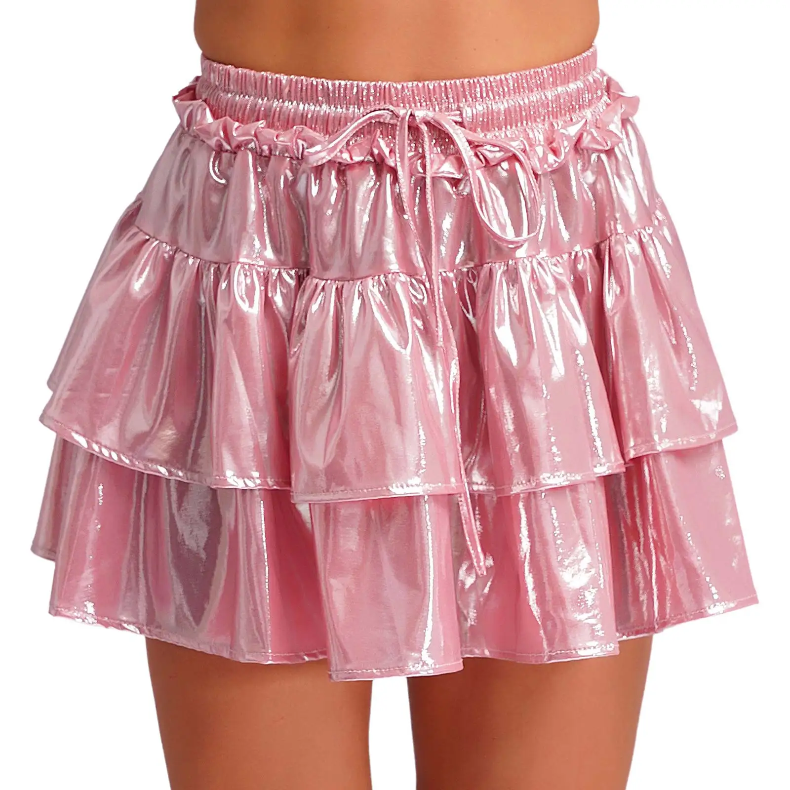 Women High Waist Flared A Line Stretchy Puffy Mini Skirt Metallic Party Carnival Drawstring Tiered Ruffles High Waist Mini Skirt