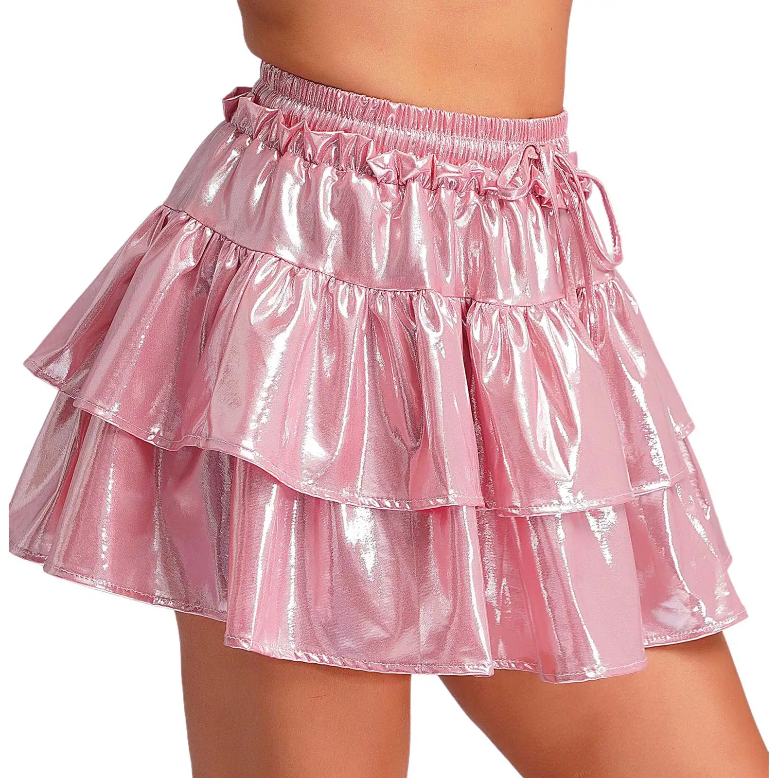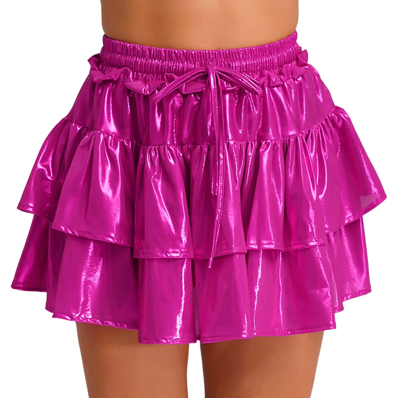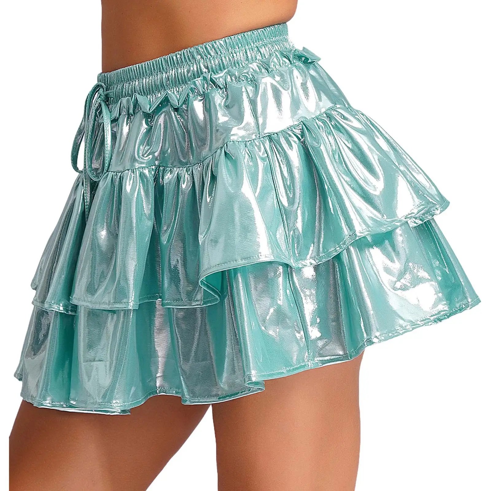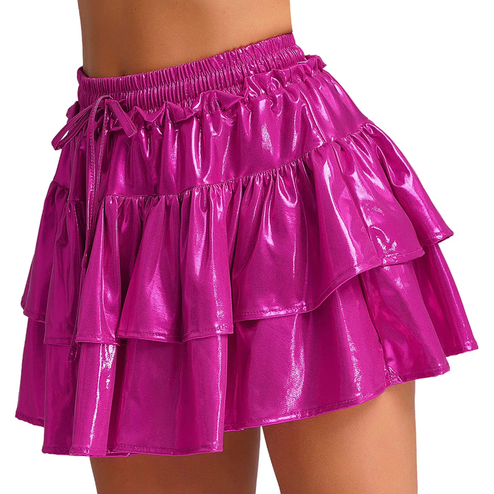 Women High Waist Flared A Line Stretchy Puffy Mini Skirt Metallic Party Carnival Drawstring Tiered Ruffles High Waist Mini Skirt