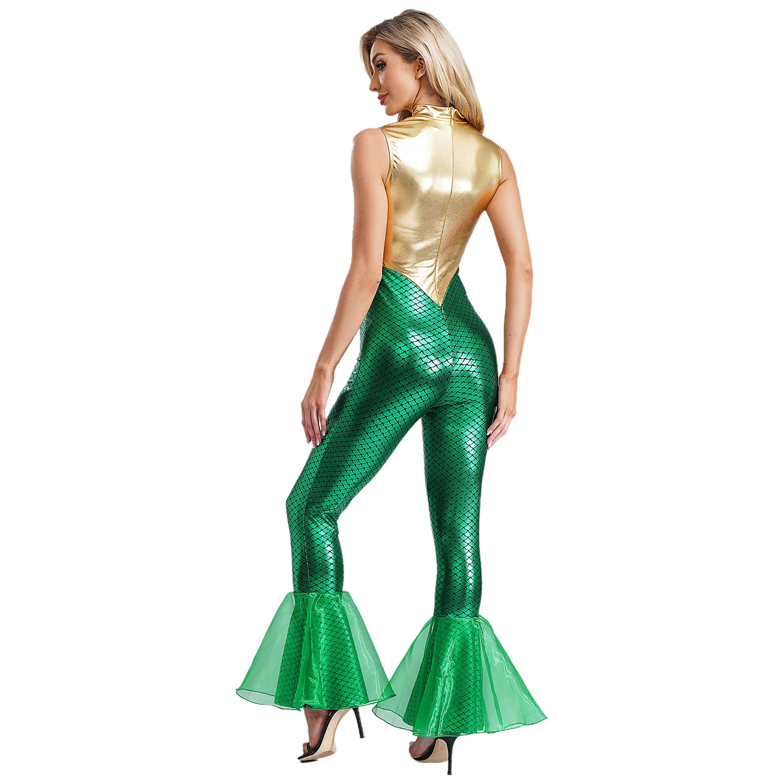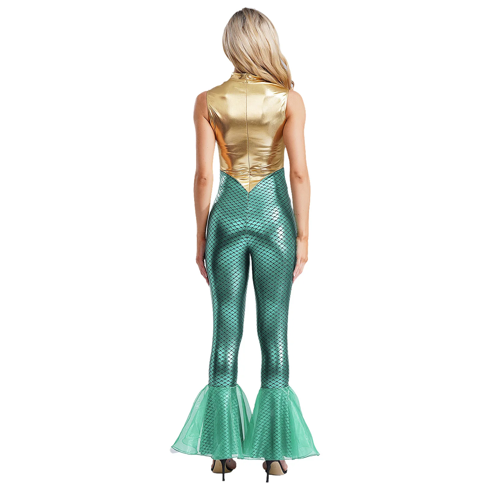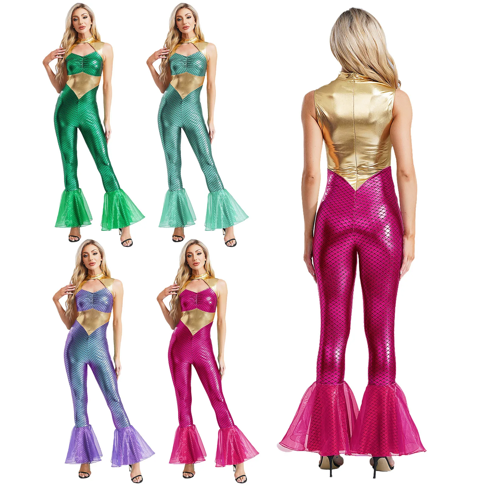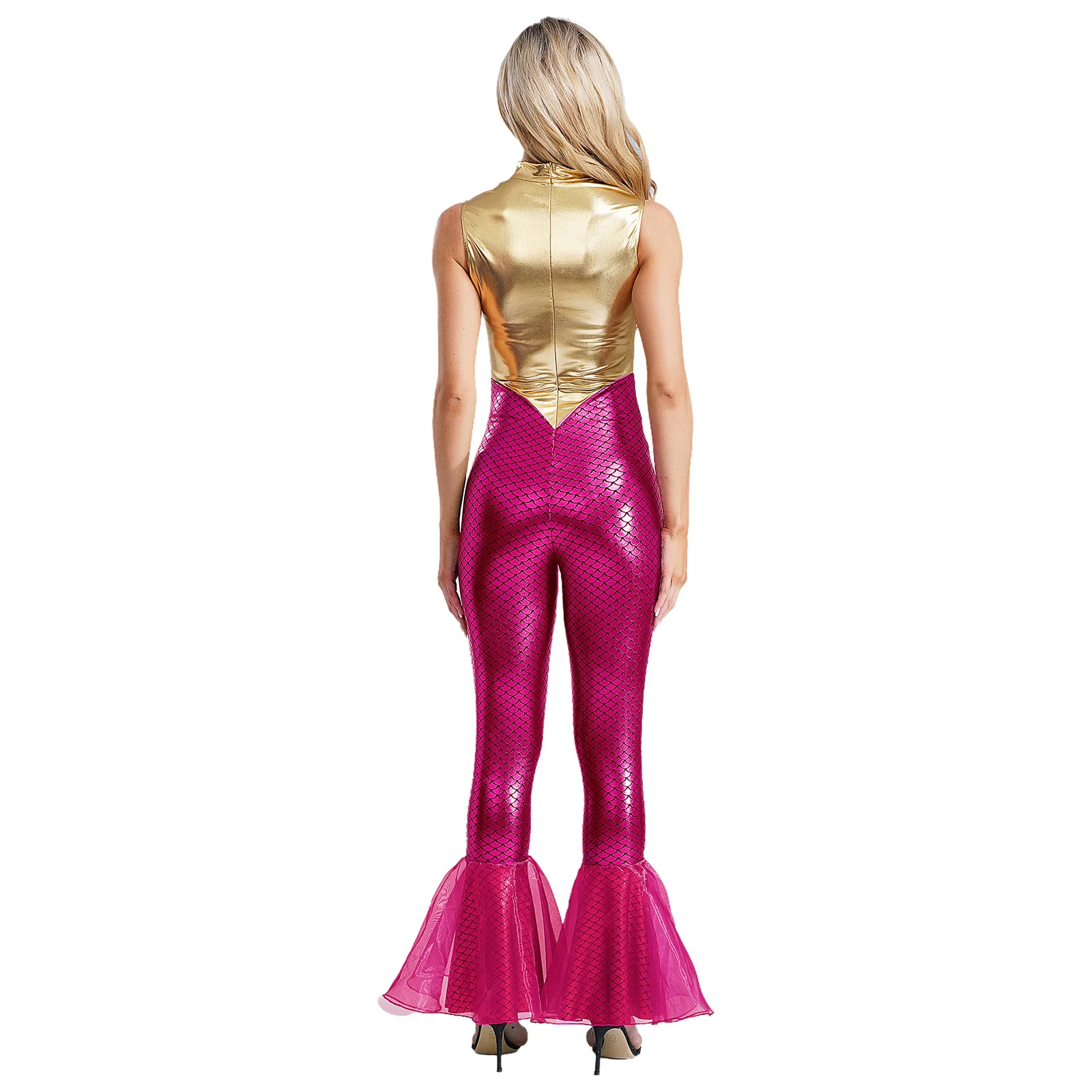 Women Mermaid Cosplay Performance Theme Party Costume Cutout Front Metallic Fish Scales Pattern Patchwork Flared Hem Jumpsuit